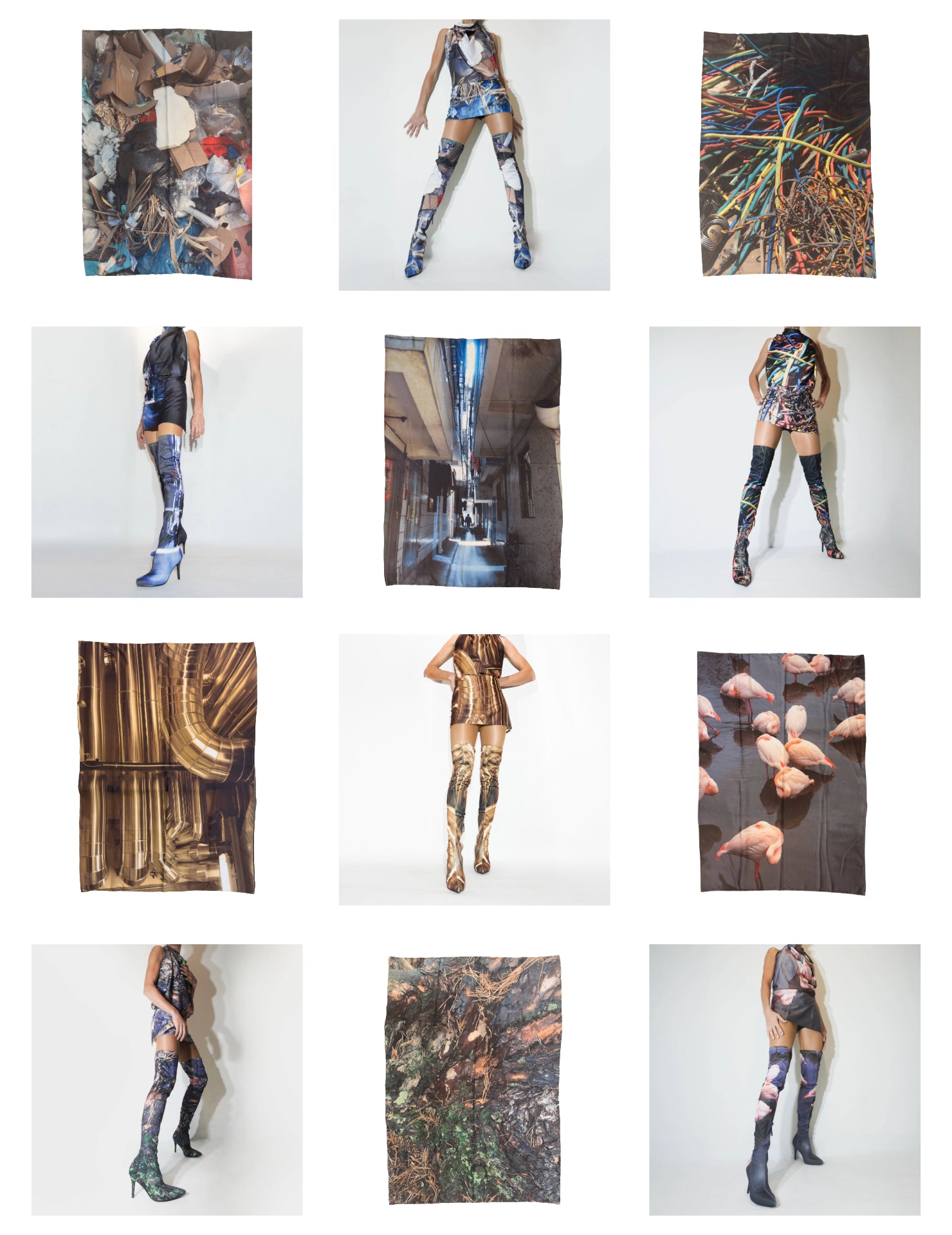 This project is a continuation of Charlie's experimentation with turning her photographs of globalized metropolises into fashion objects. The photographs, taken from her recent book, CITY LUST, document settings of everyday life, for example, a recycling facility in Lagos or a bucket of scorpions sold in a market in China. As the streets and surfaces of these often overlooked spaces are applied as fabrics, textures and colors, they become beautiful and surreal objects that invite us to think critically about beauty and fashion's relationship to the real world.