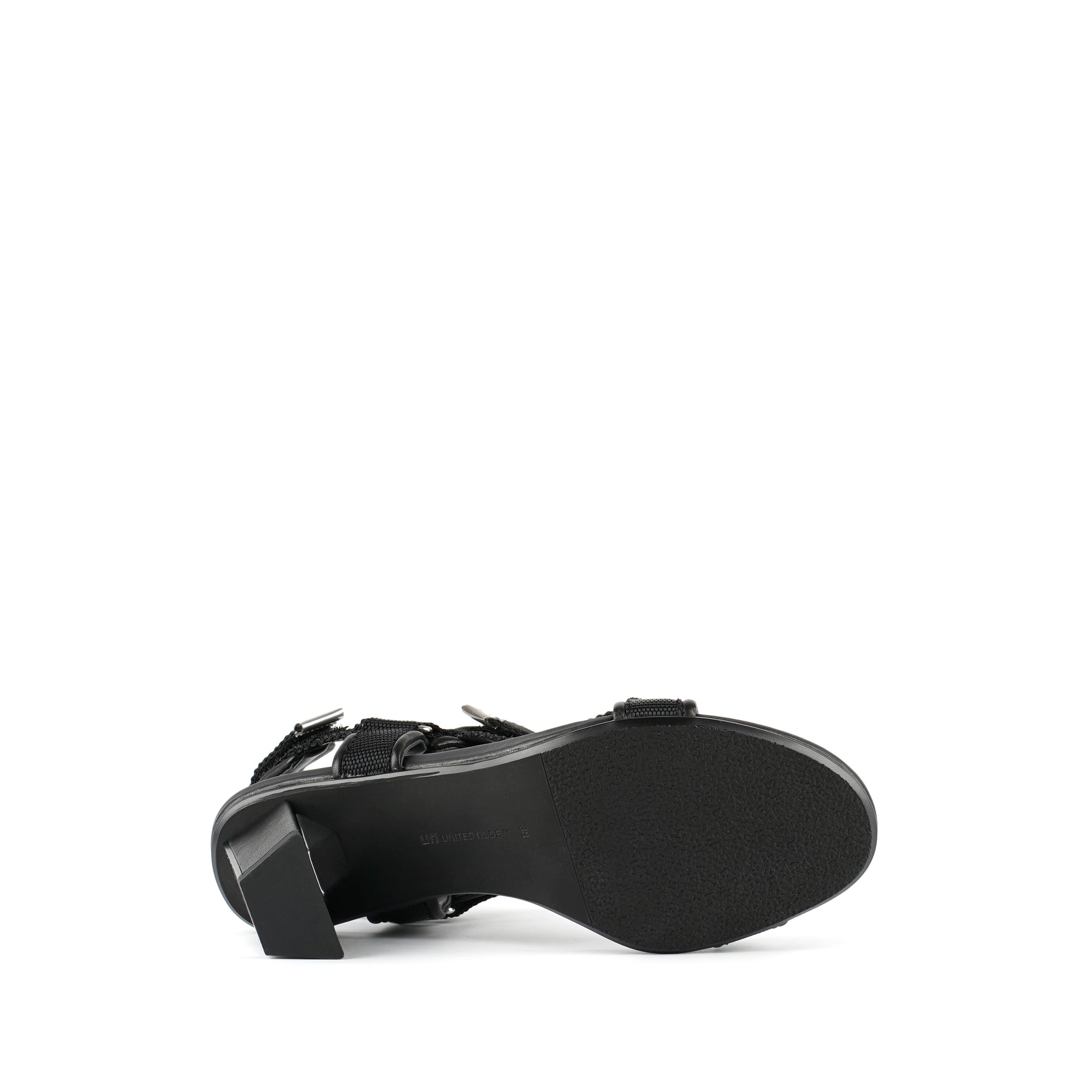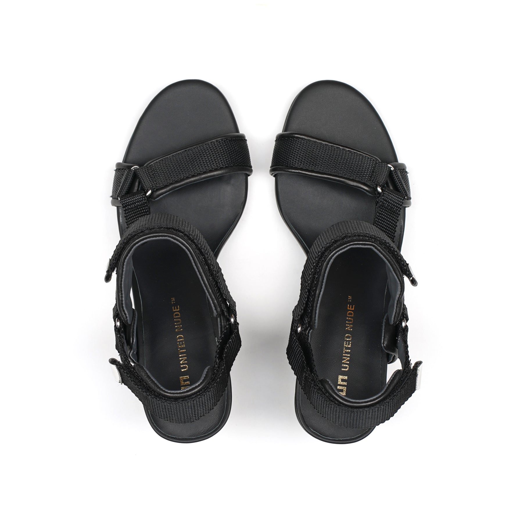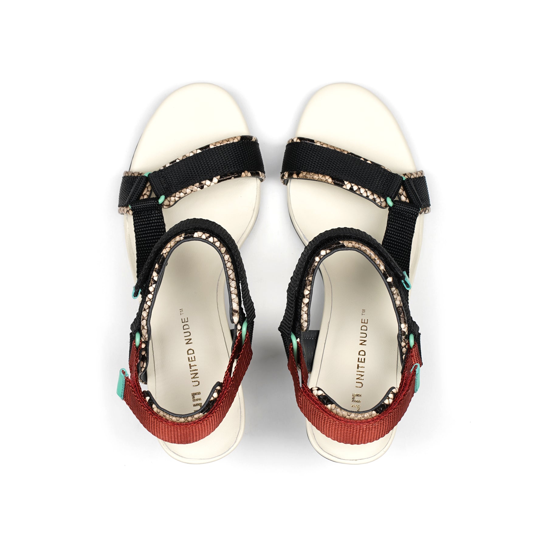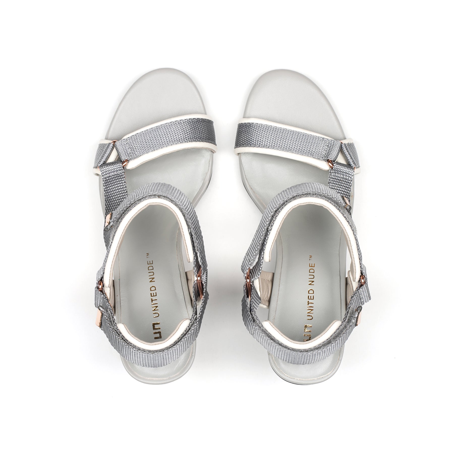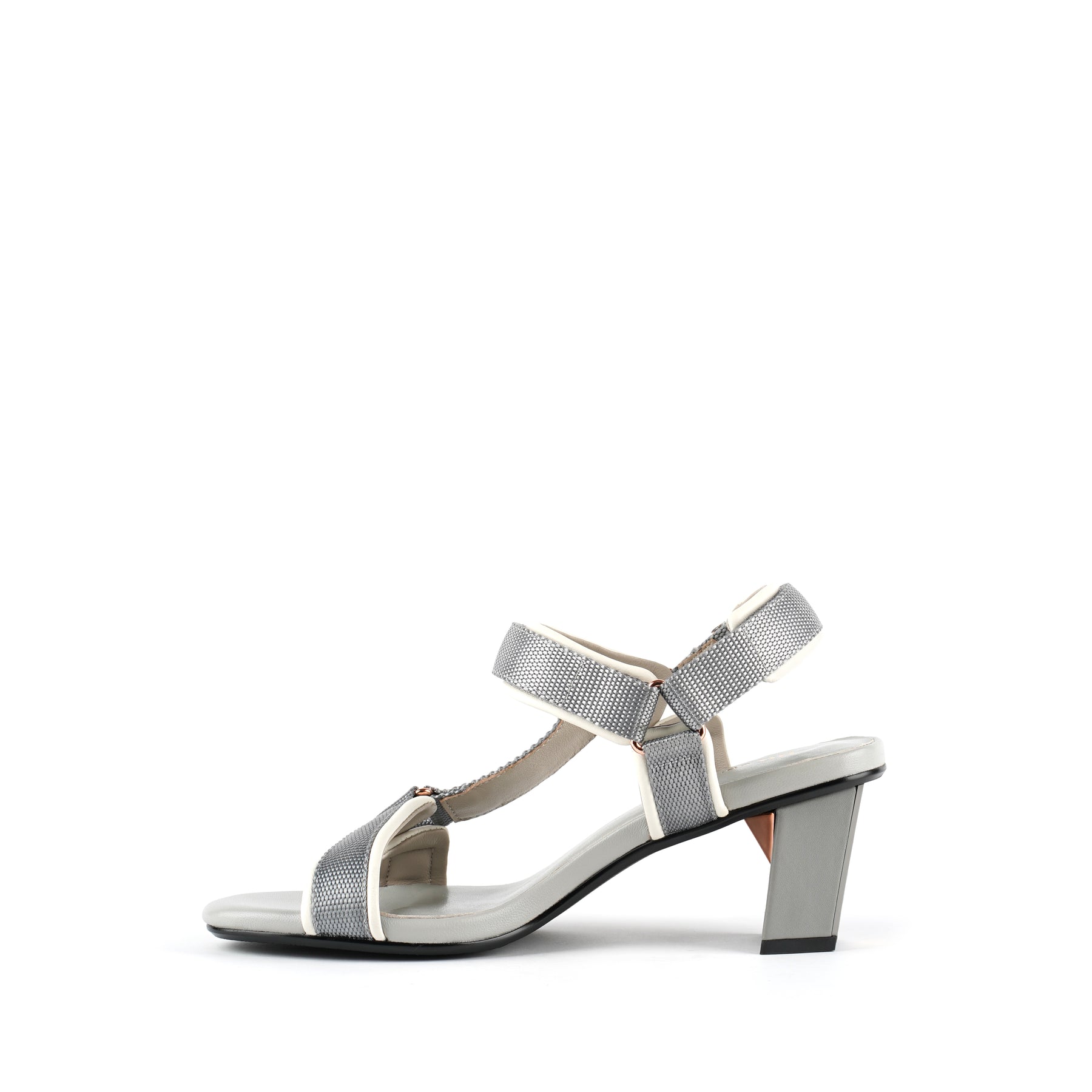The Aura Mid is a sporty mid heel sandal that sits on a leather wrapped angular heel with inset laddered metallic detailing and a chromed triangular wedge that extends from the shank. Utilitarian style nylon belts with two adjustable velcro enclosures complete the look.