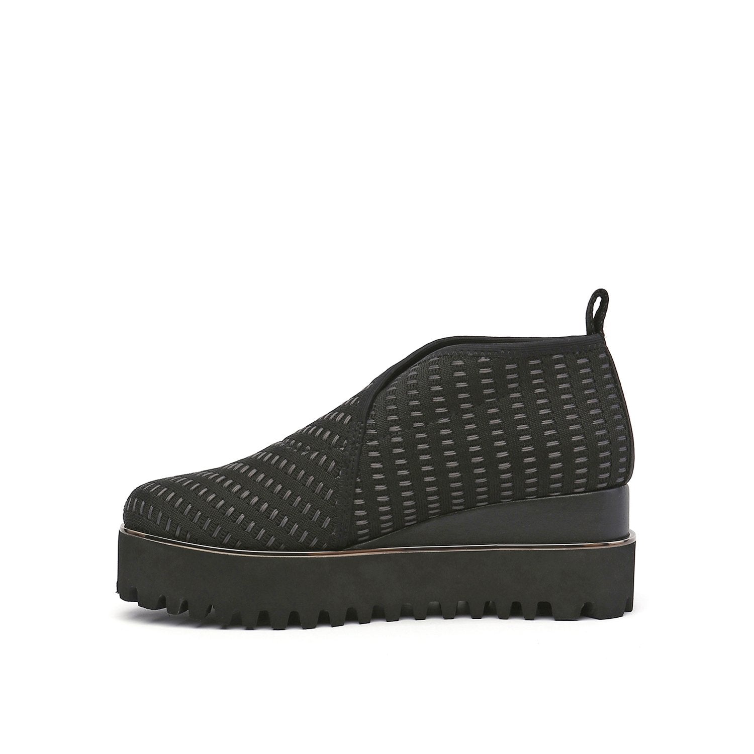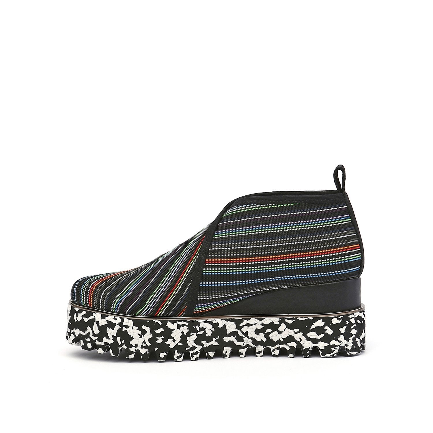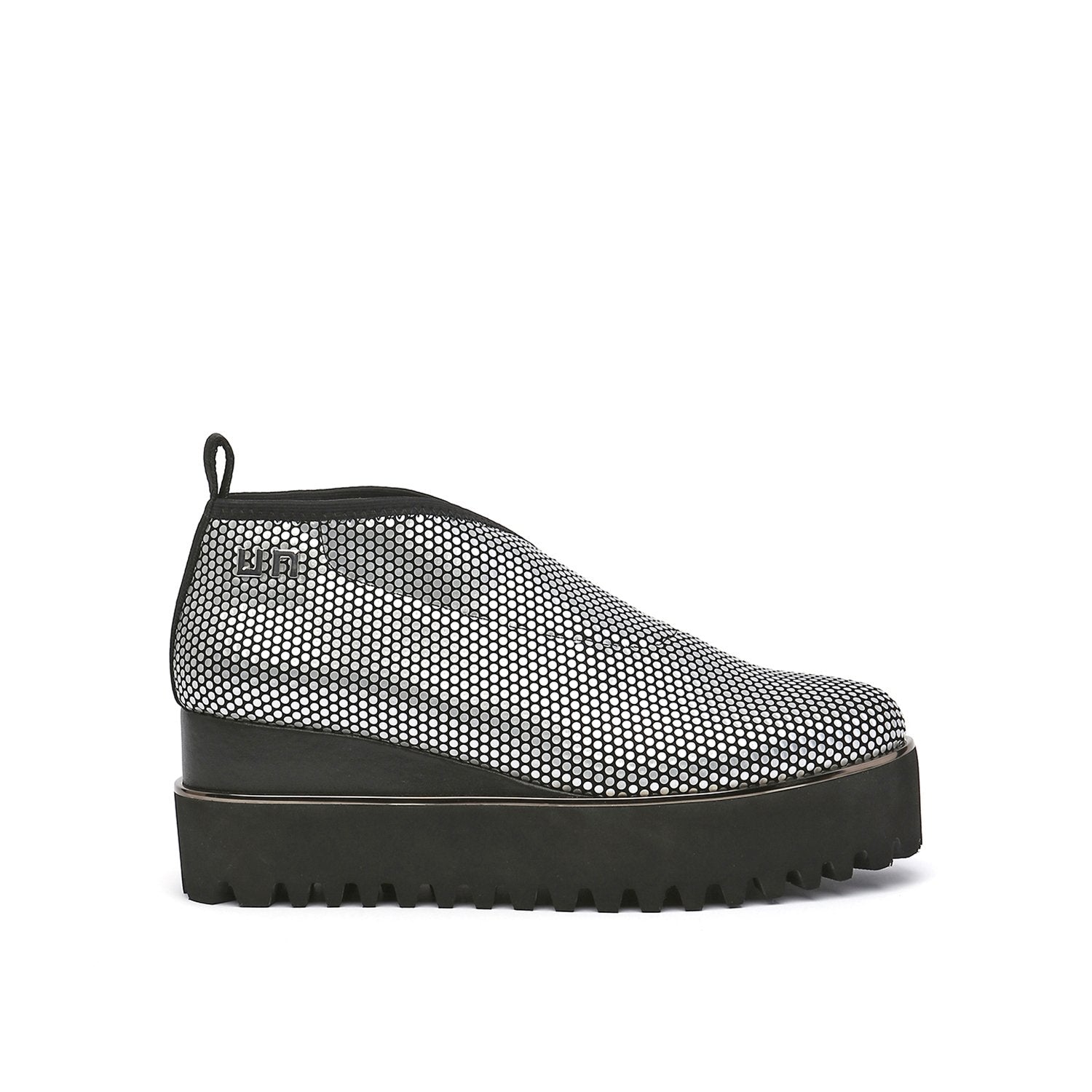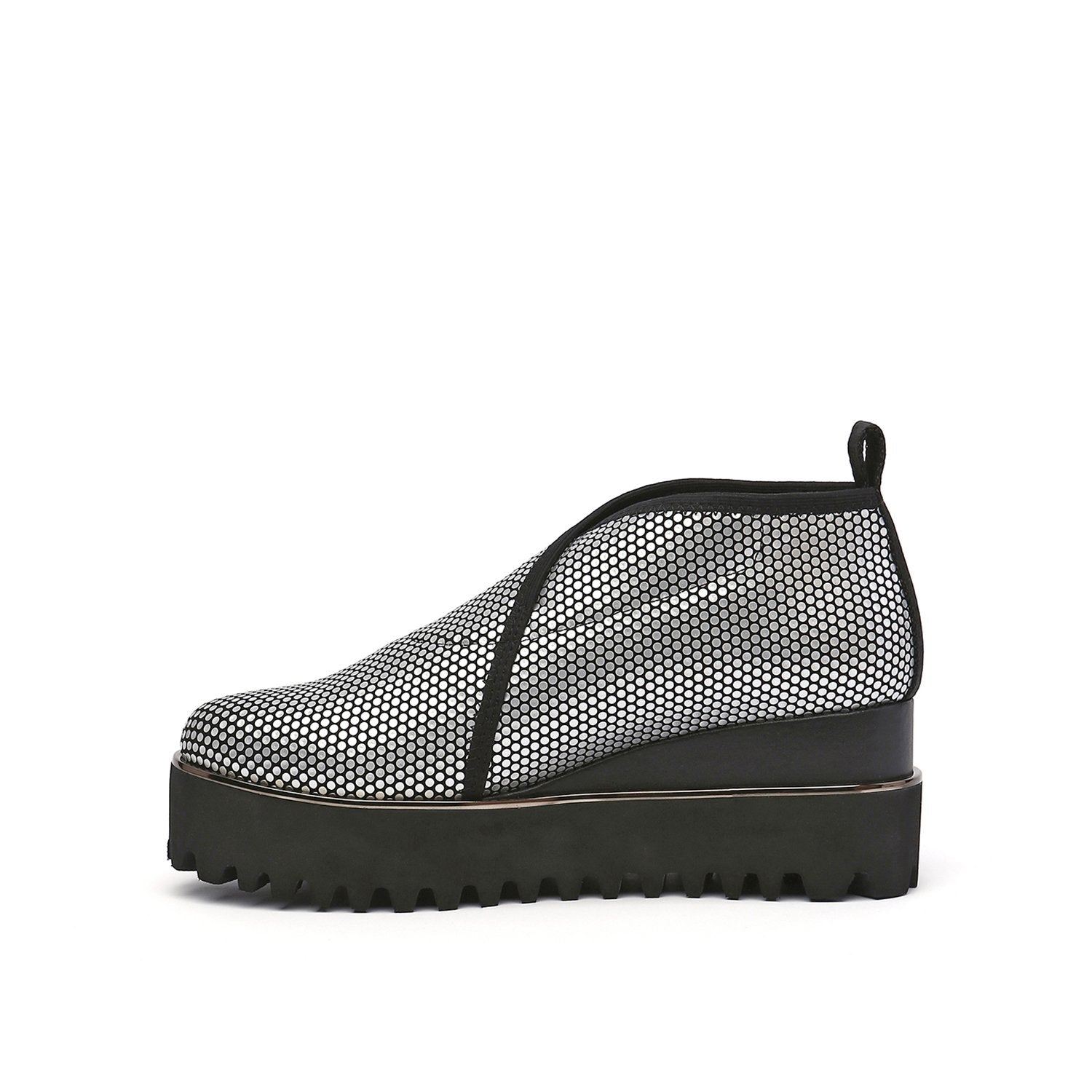 The Fold Casual II is a flatform slip on with an asymmetrical top line and cleated platform outsole. An exposed wedge adds a gentle lift to these metallic trimmed shoes.