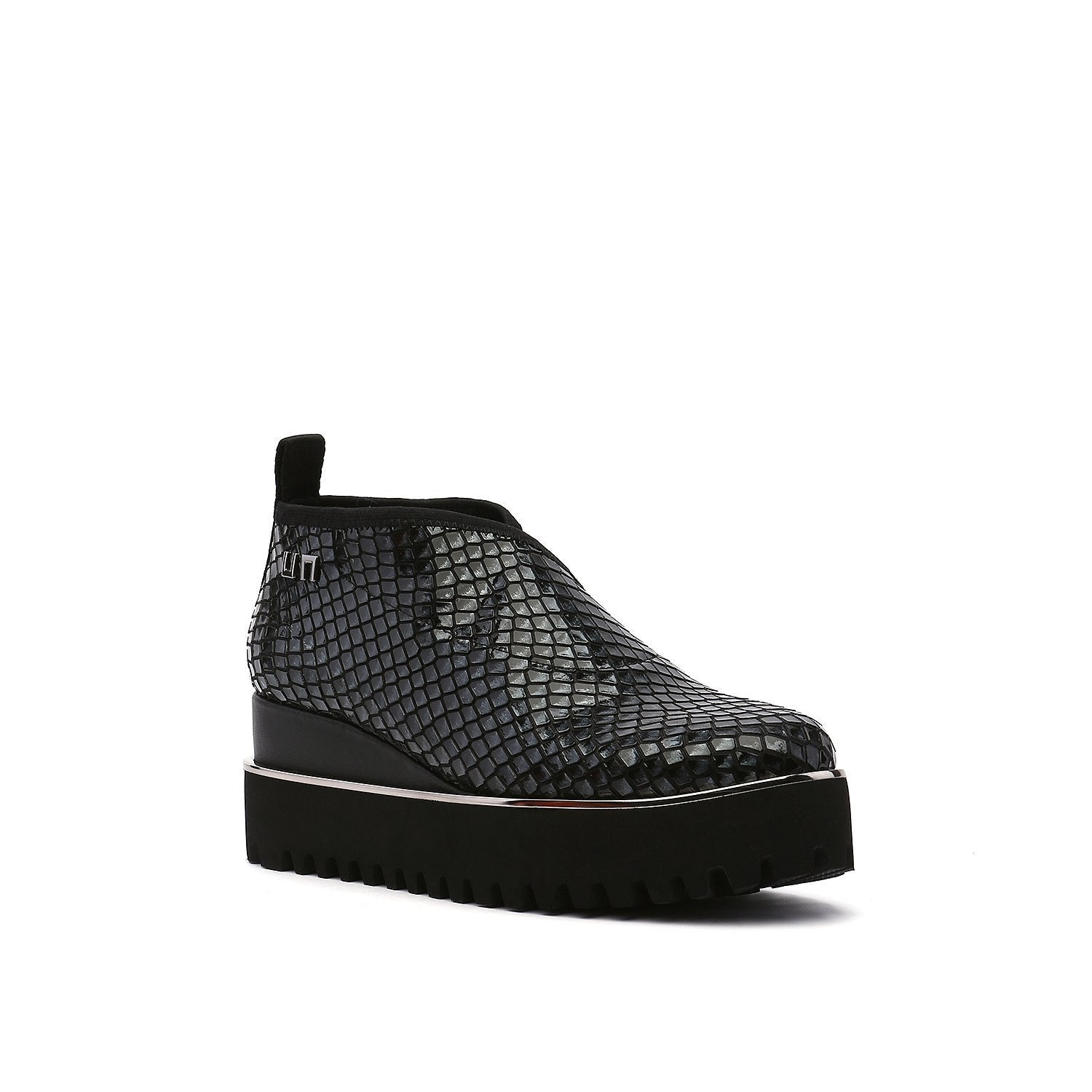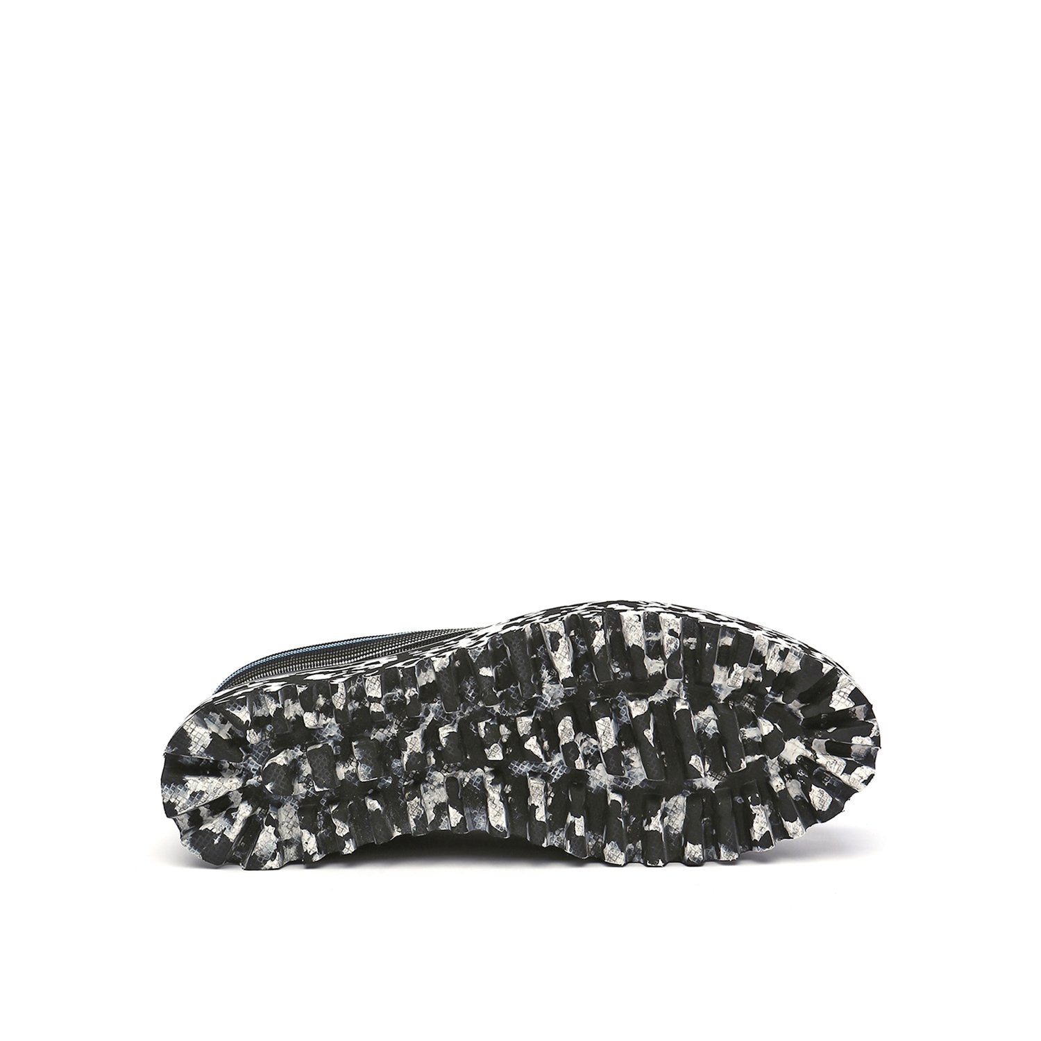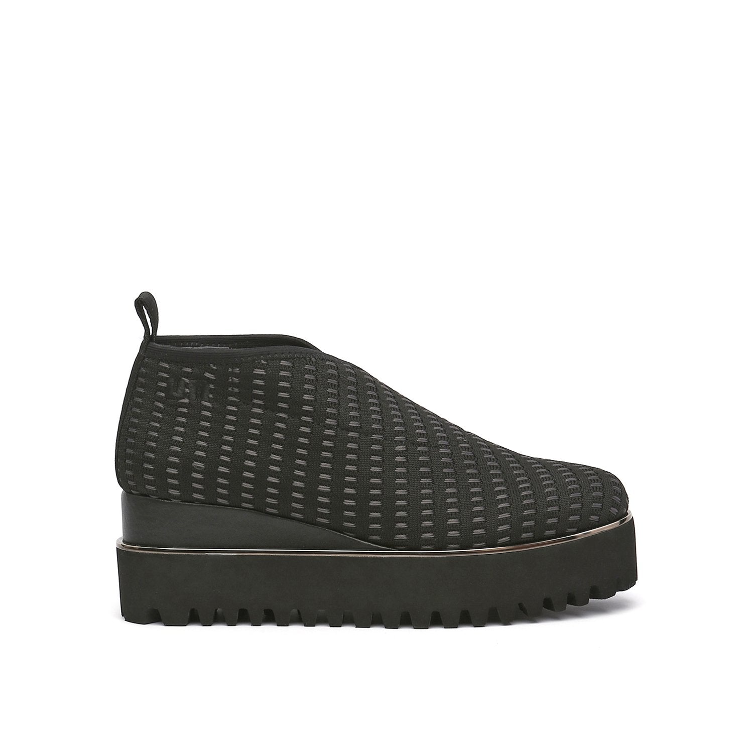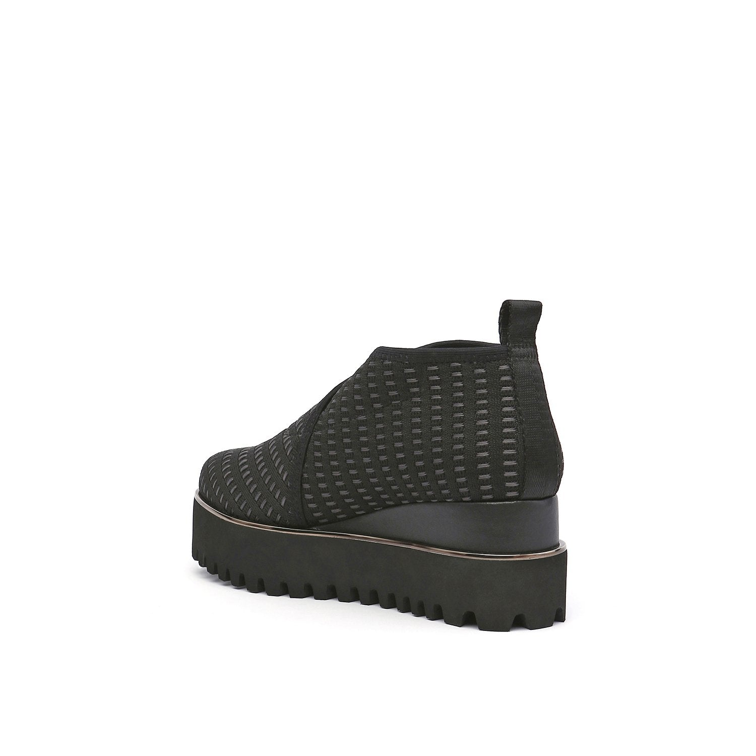 The Fold Casual II is a flatform slip on with an asymmetrical top line and cleated platform outsole. An exposed wedge adds a gentle lift to these metallic trimmed shoes.