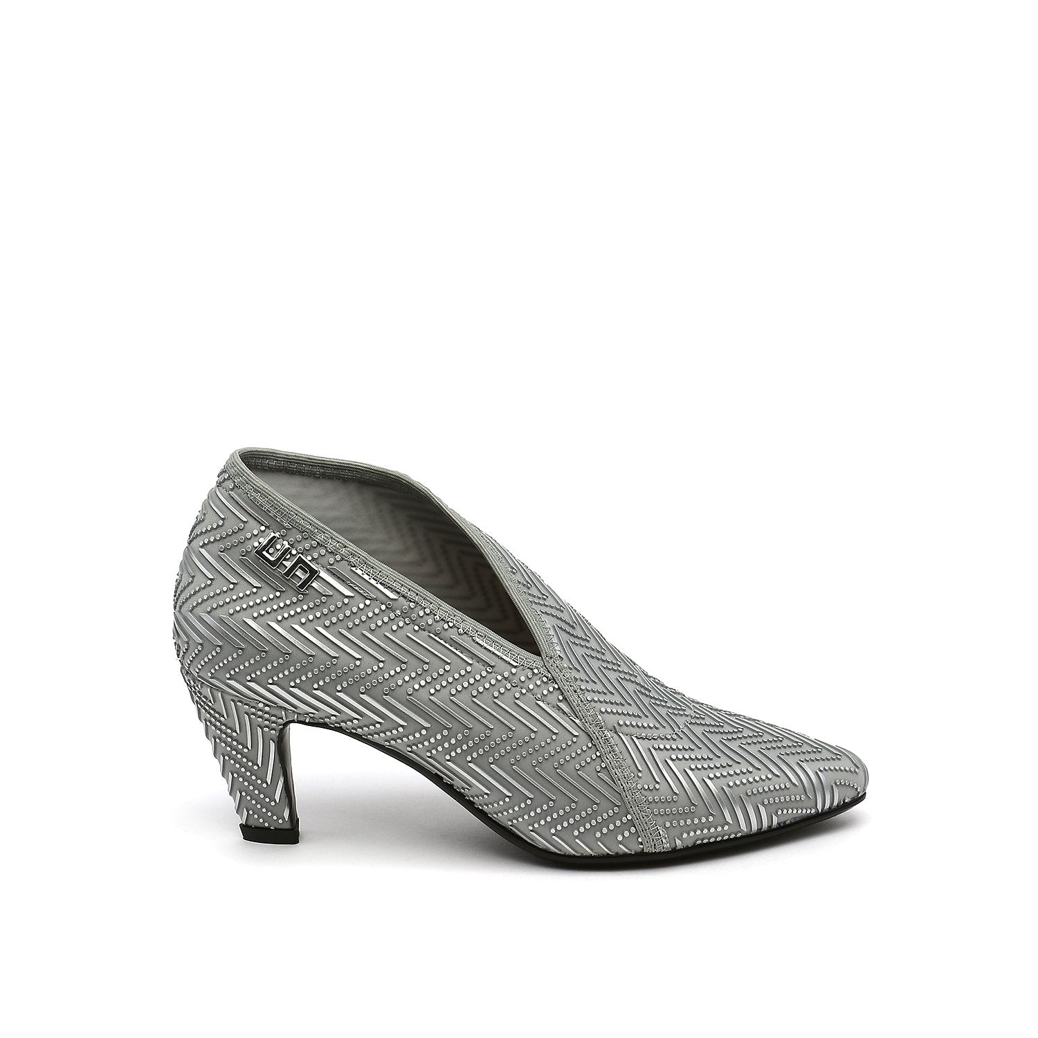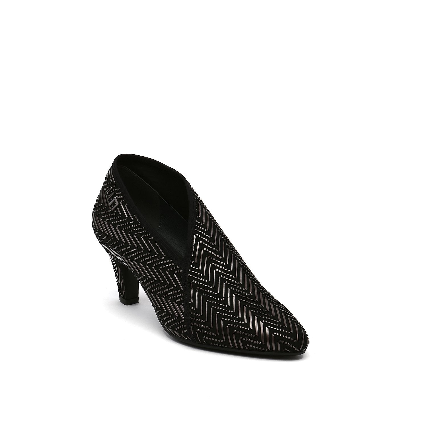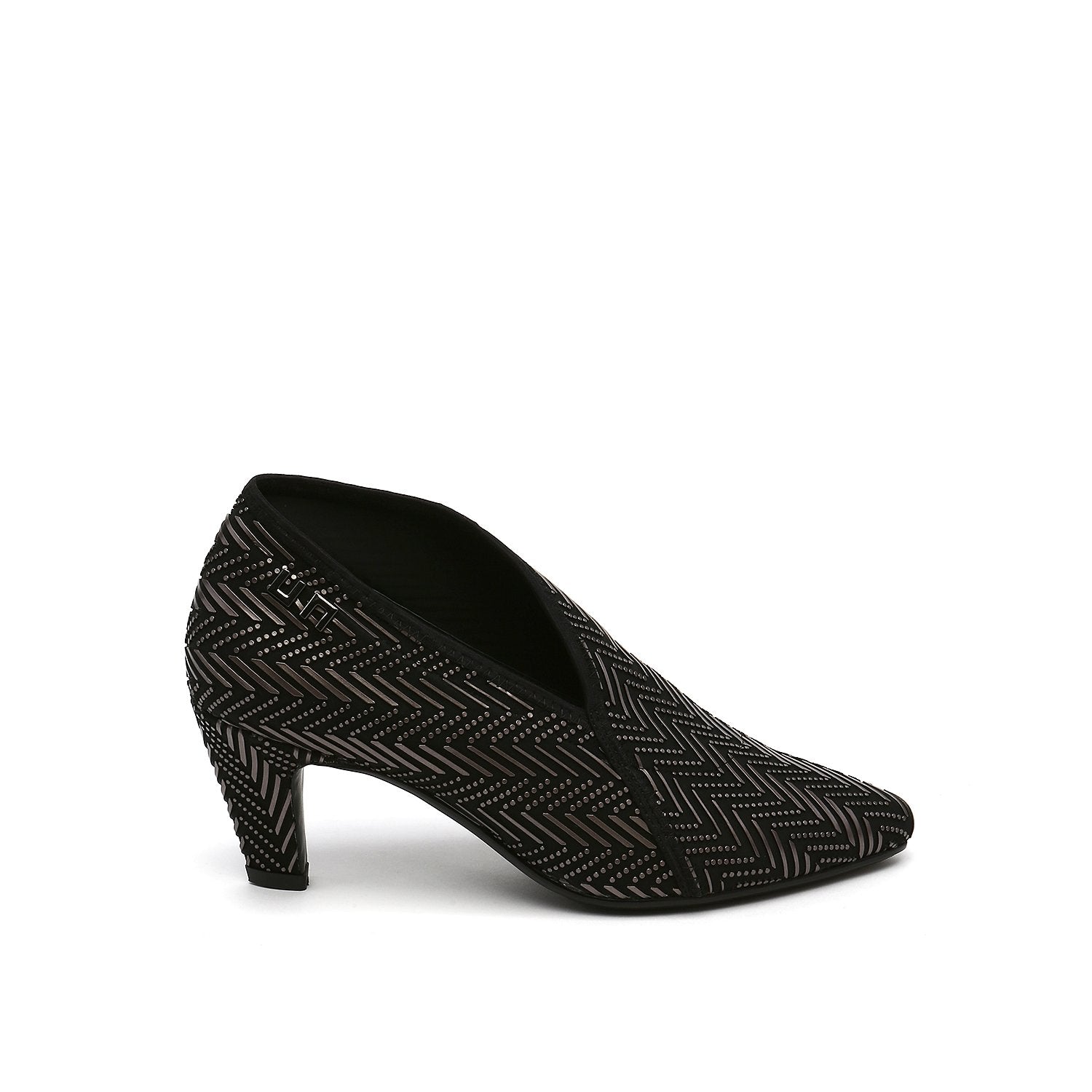 The Fold Lite Mid is a mid-heel ankle bootie with a soft almond toe and asymmetrical top line.