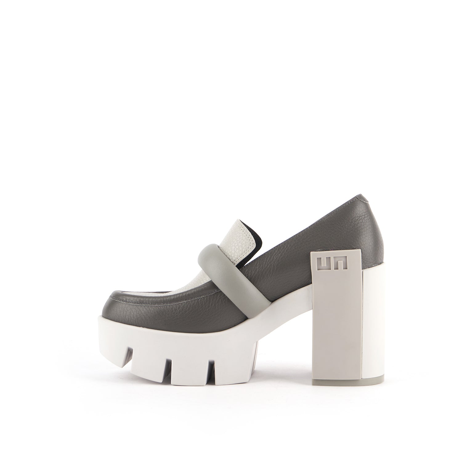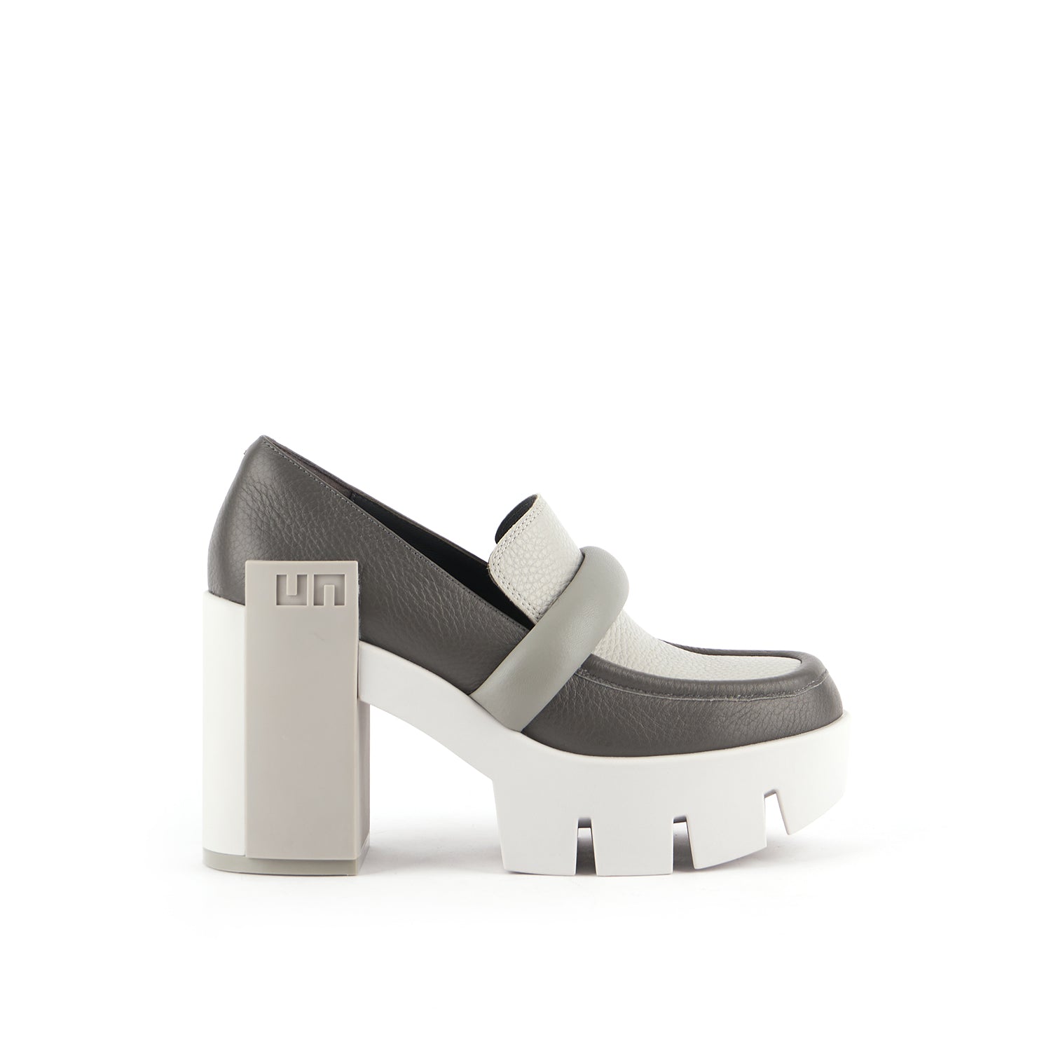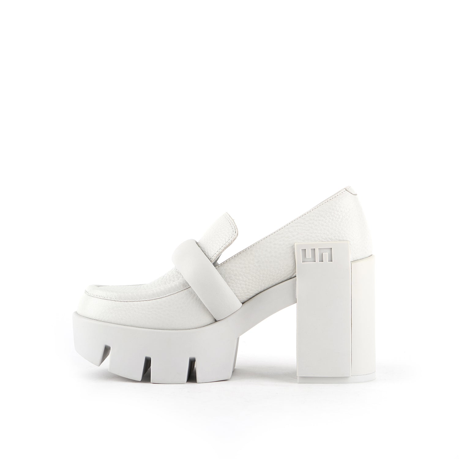 The Grip Loafer is an all-leather slip on shoe with a platform lift, a statement logo block, and a defining lug sole.