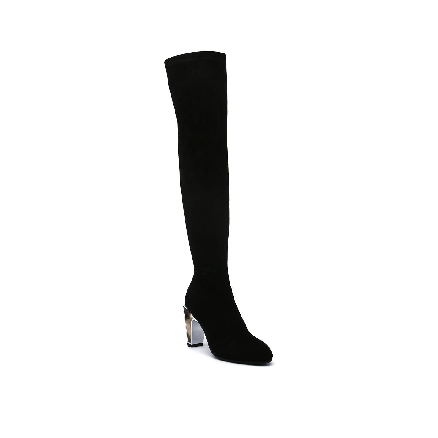 The Icon Tall Boot is an over-the-knee, slim-fitting boot featuring a soft microfiber upper and an aluminum cut-out statement heel.