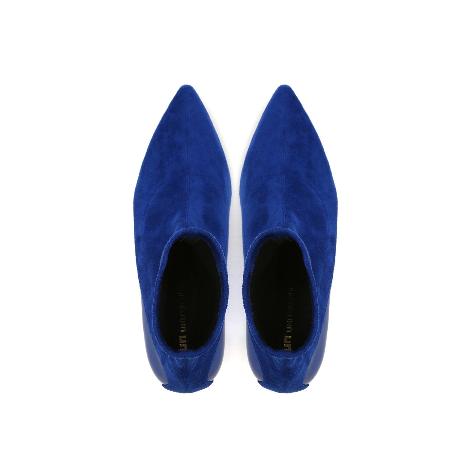 The Molten Flow Ankle Boot Mid is a mid heel pointy-toe ankle boot with a flexible microfiber upper that is defined by a swooping metallic panel.