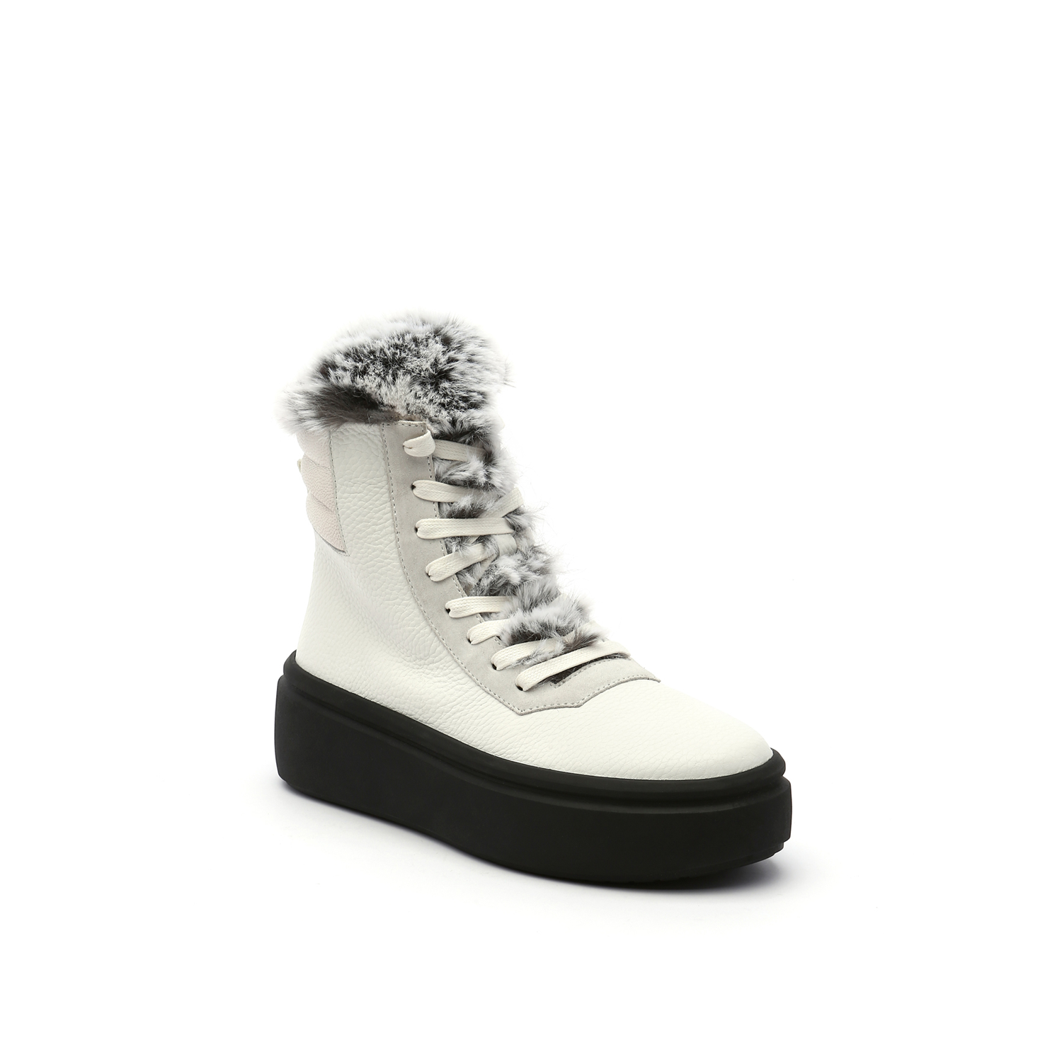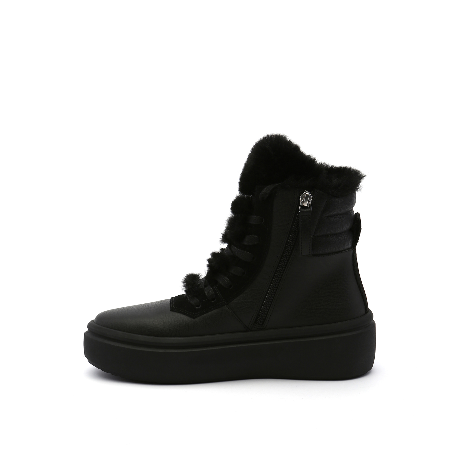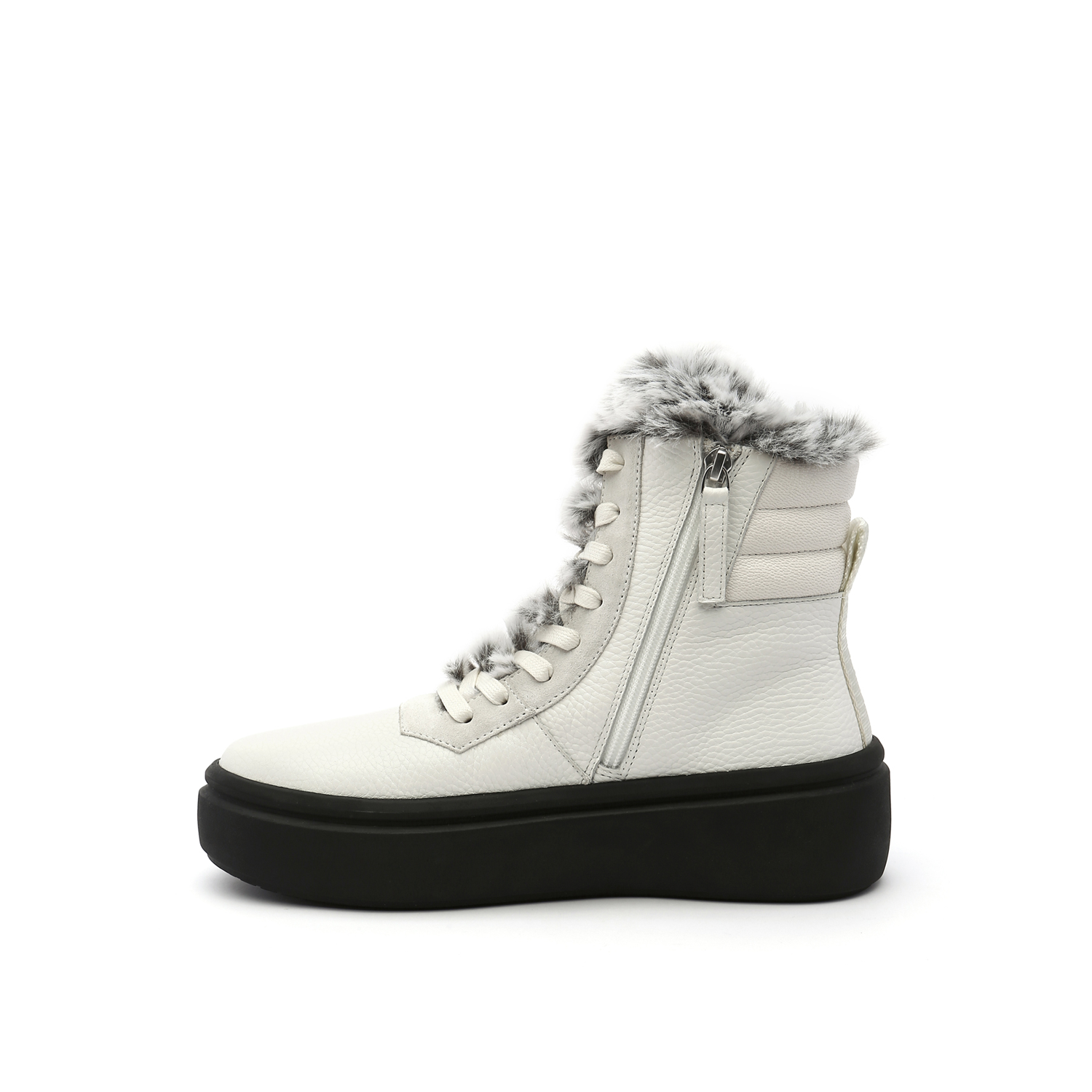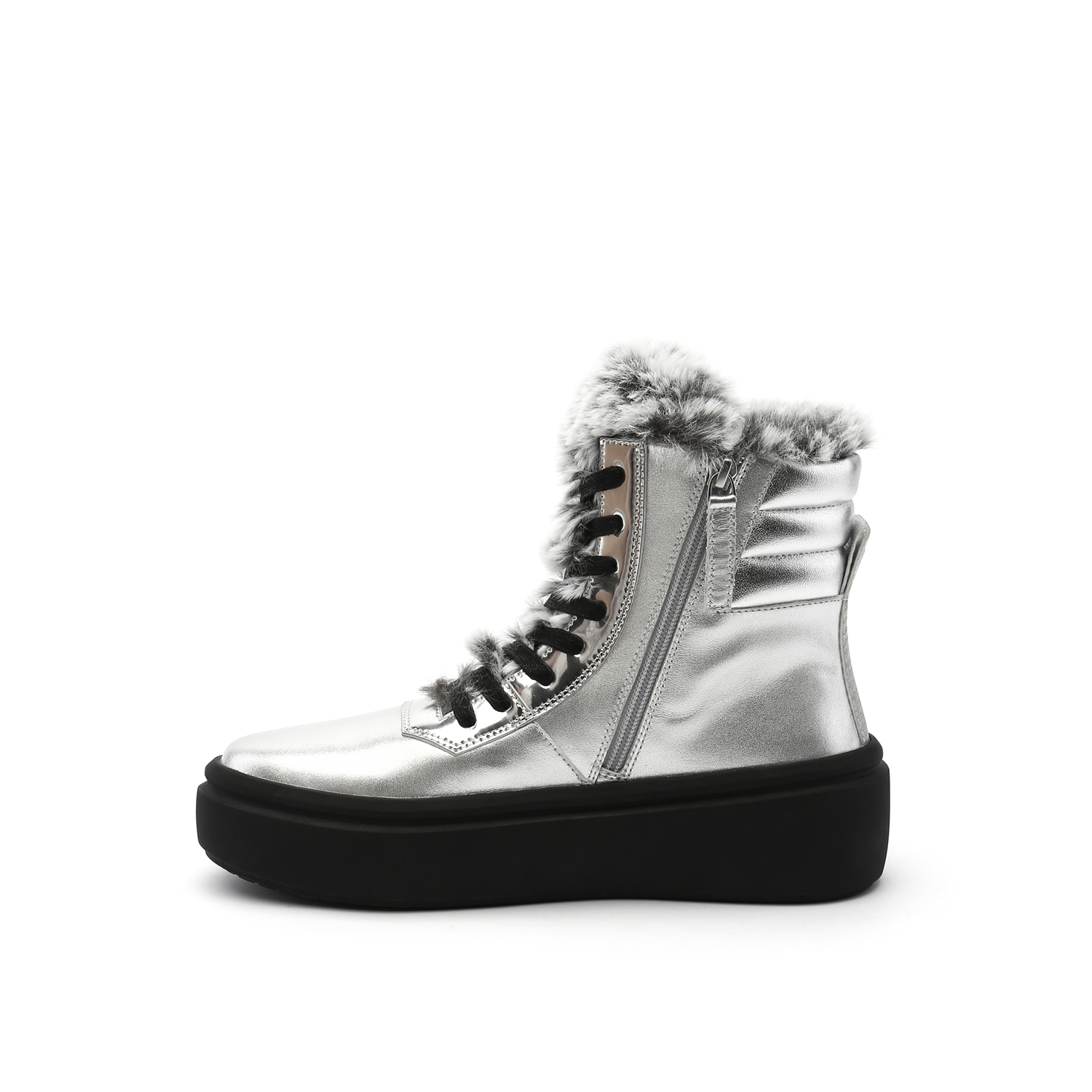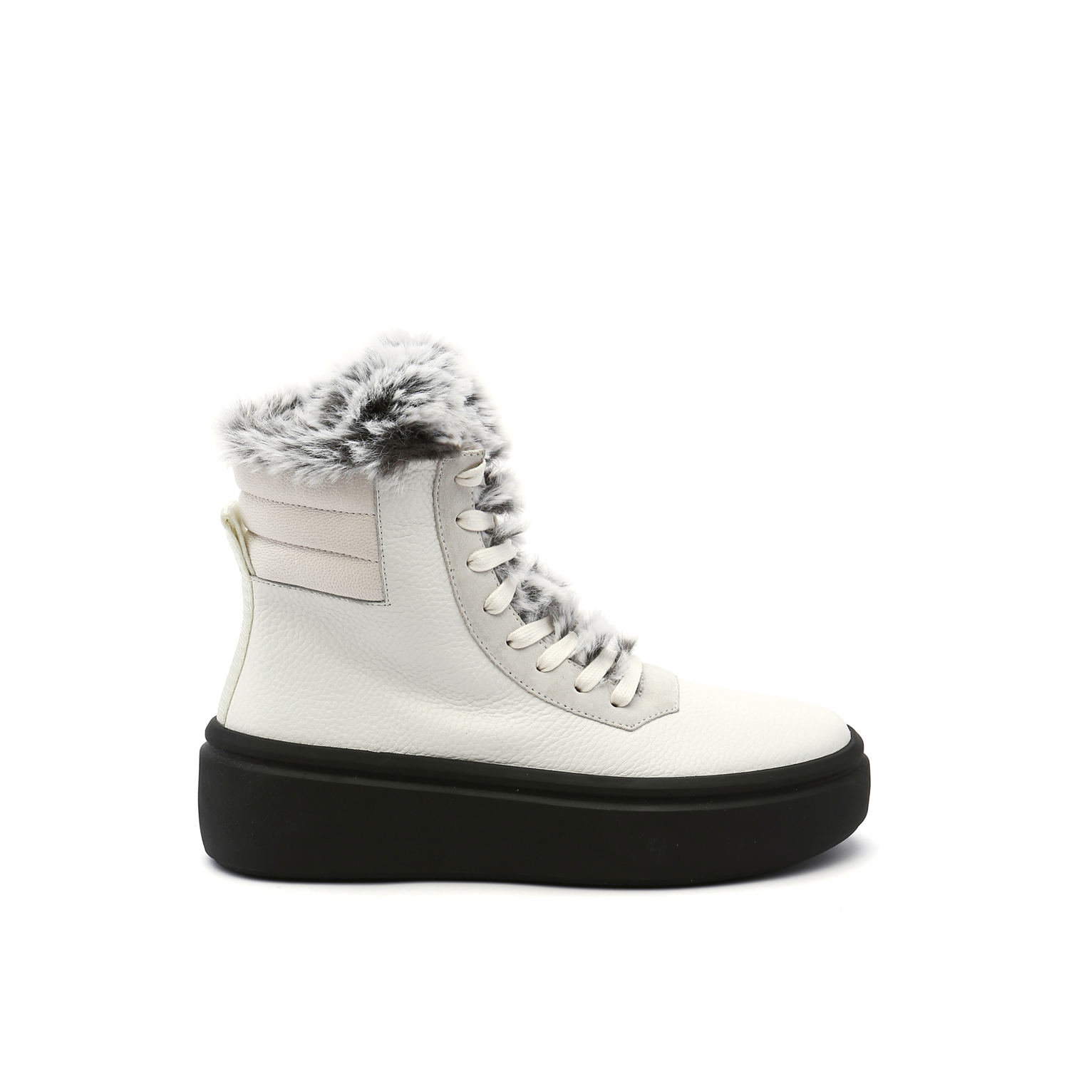 The Motto High Womens is a high top sneaker with a cozy faux fur tongue and leather upper that sit on a flexible rubber sole with a slight lift. This lace-up sneaker is perfect for a casual cold weather look.