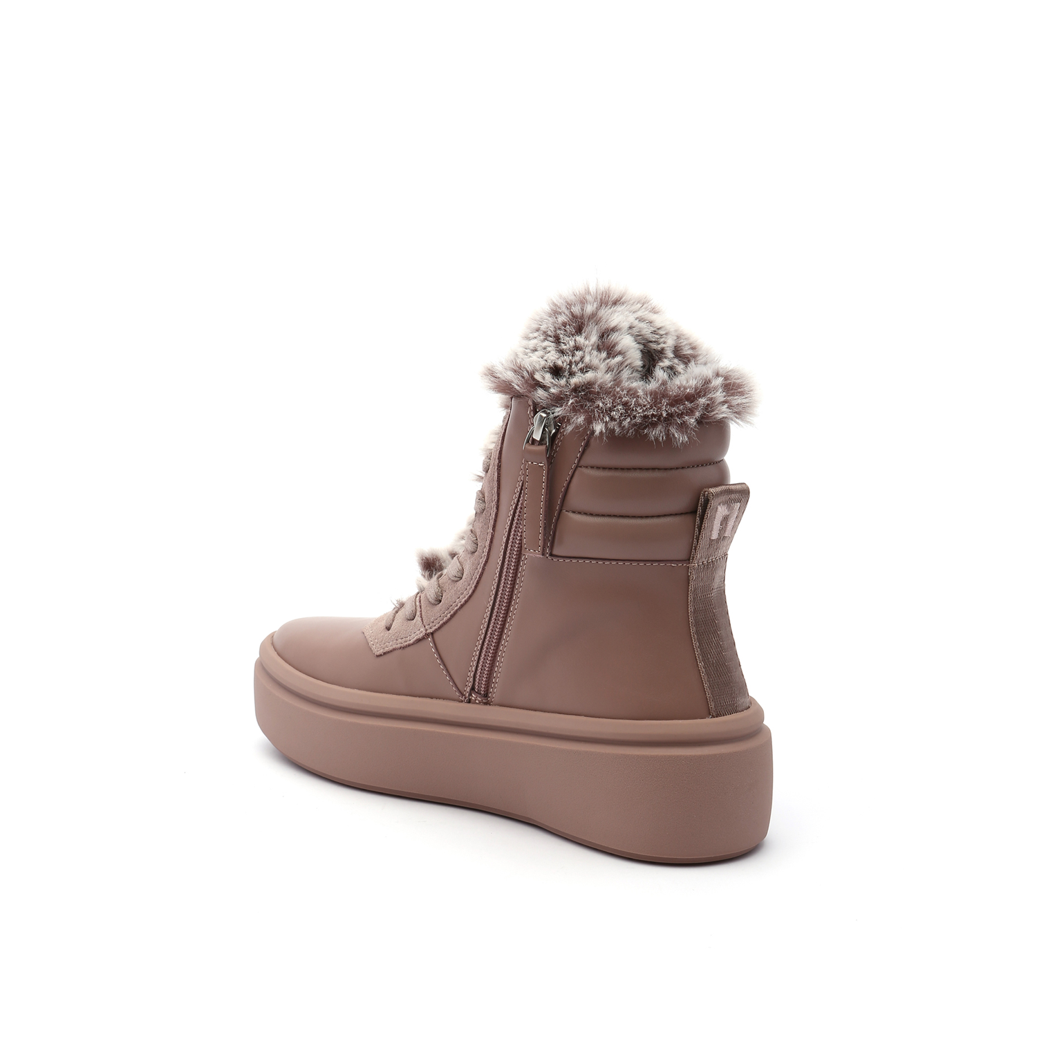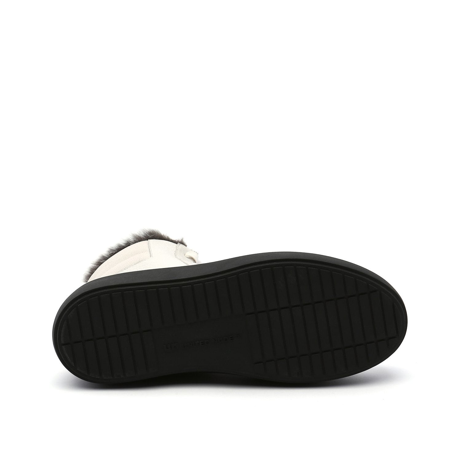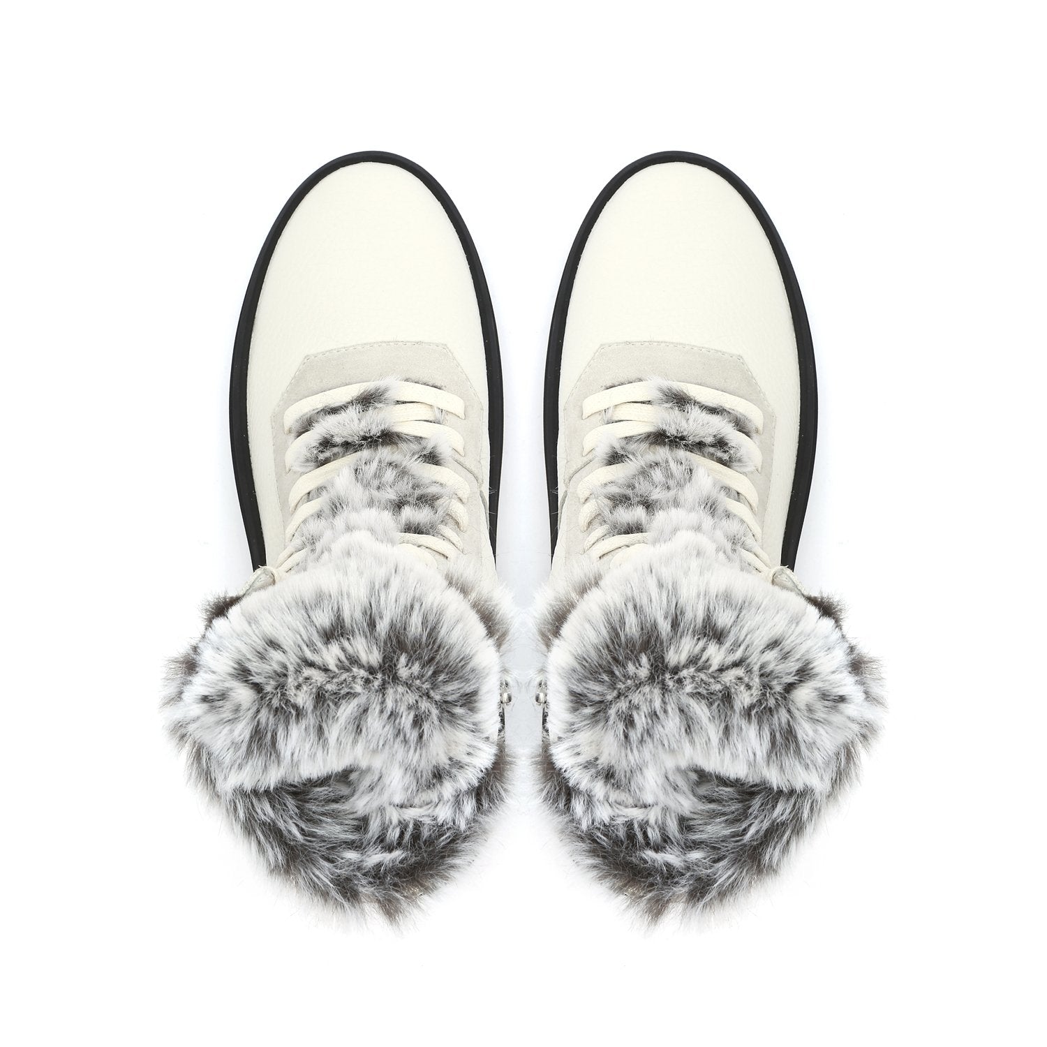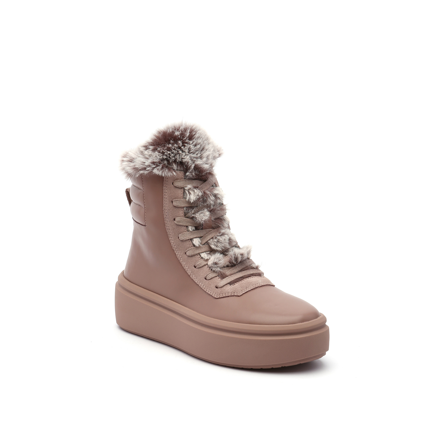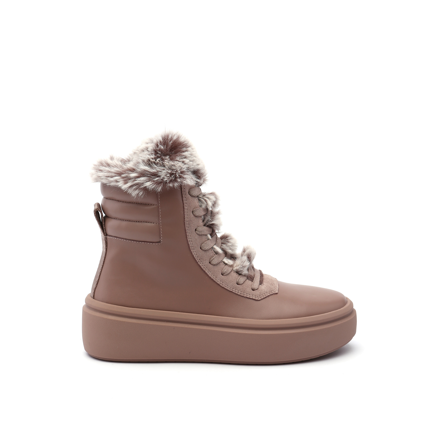 The Motto High Womens is a high top sneaker with a cozy faux fur tongue and leather upper that sit on a flexible rubber sole with a slight lift. This lace-up sneaker is perfect for a casual cold weather look.