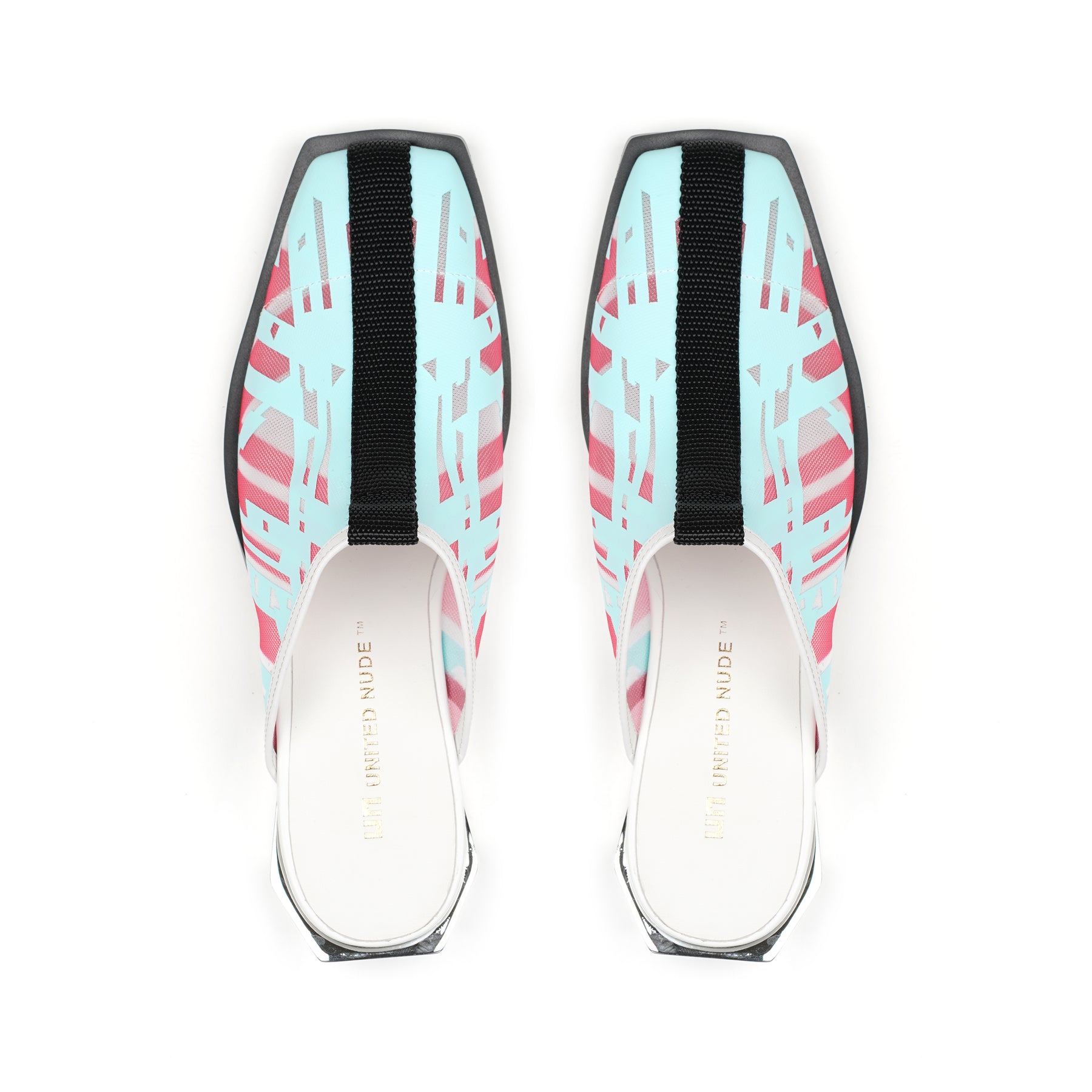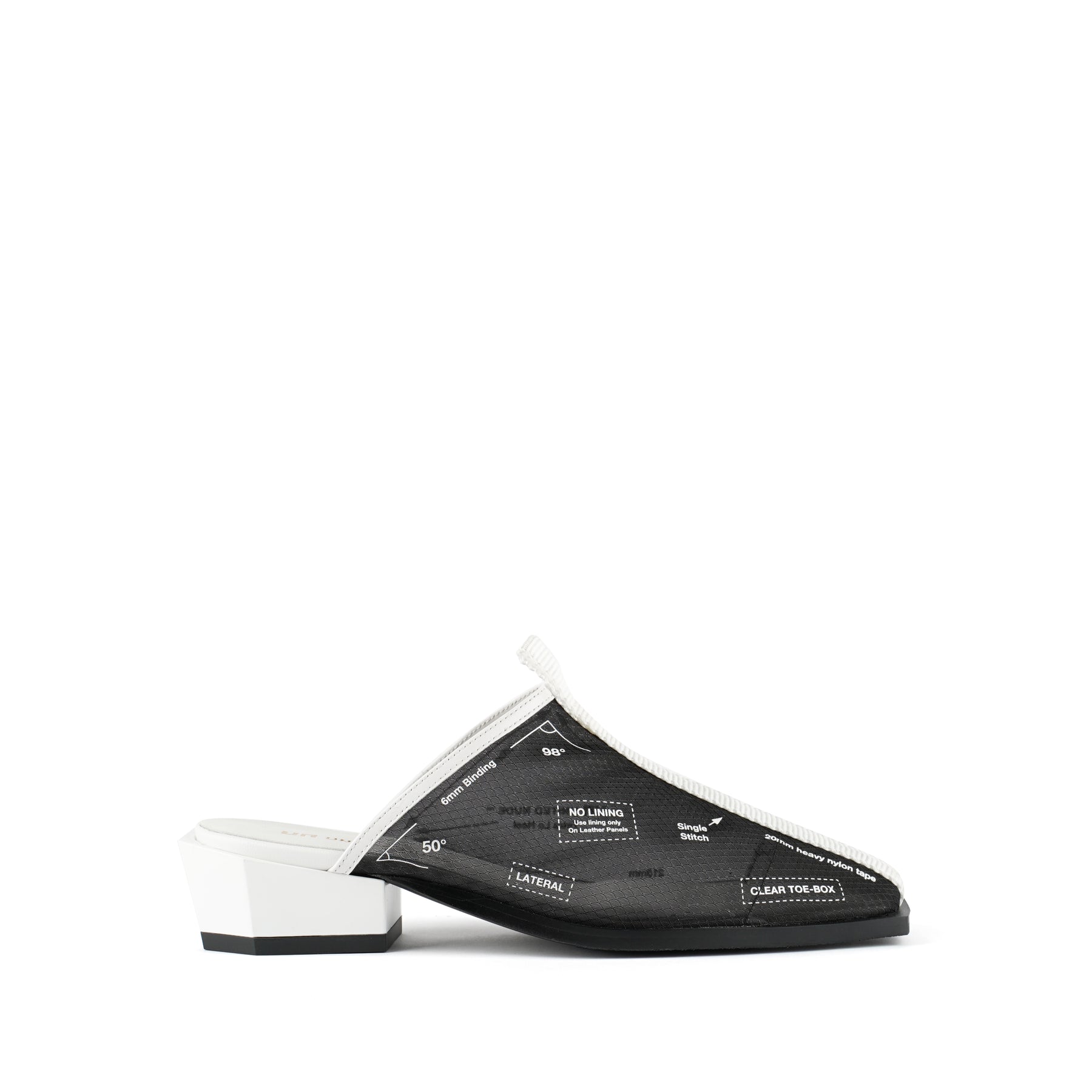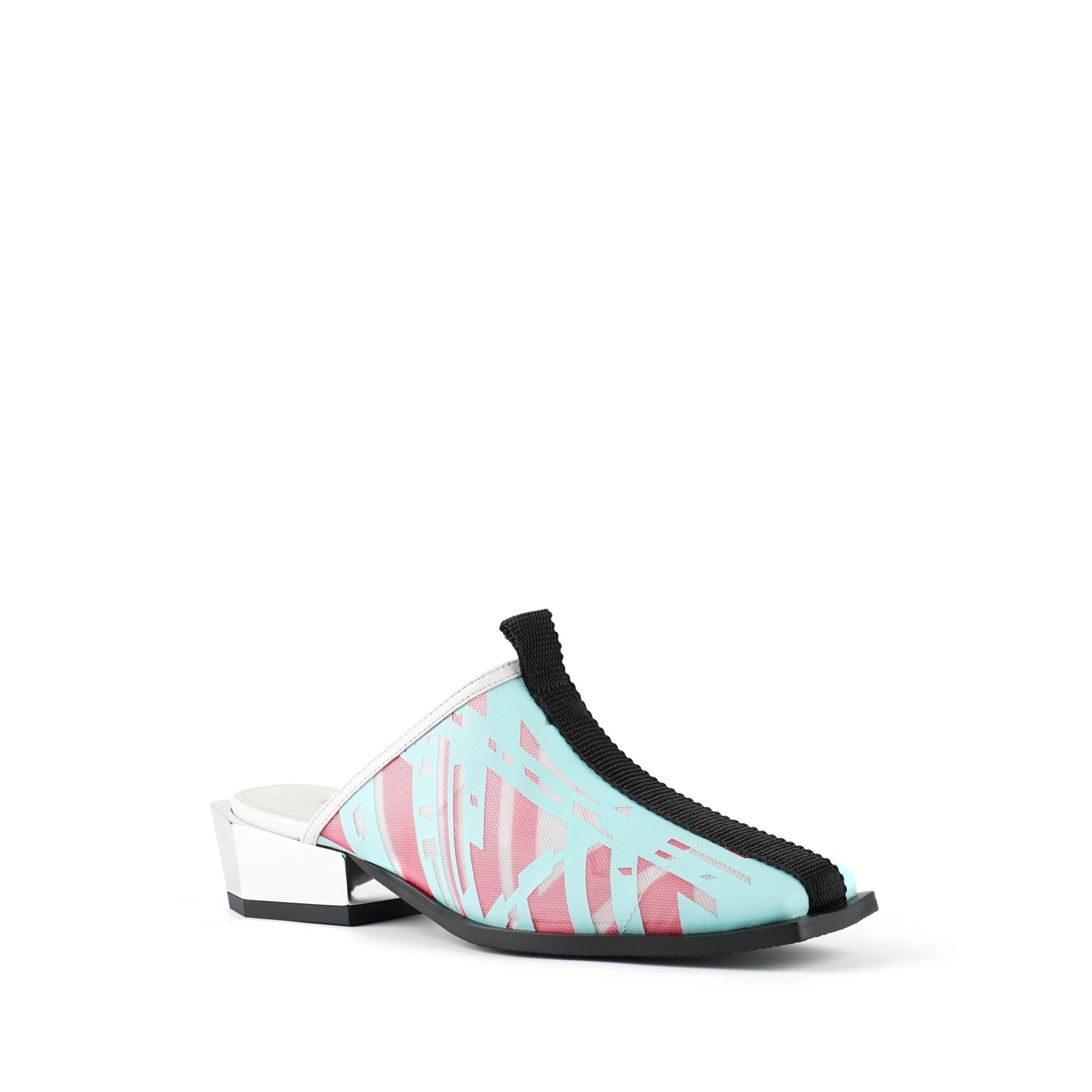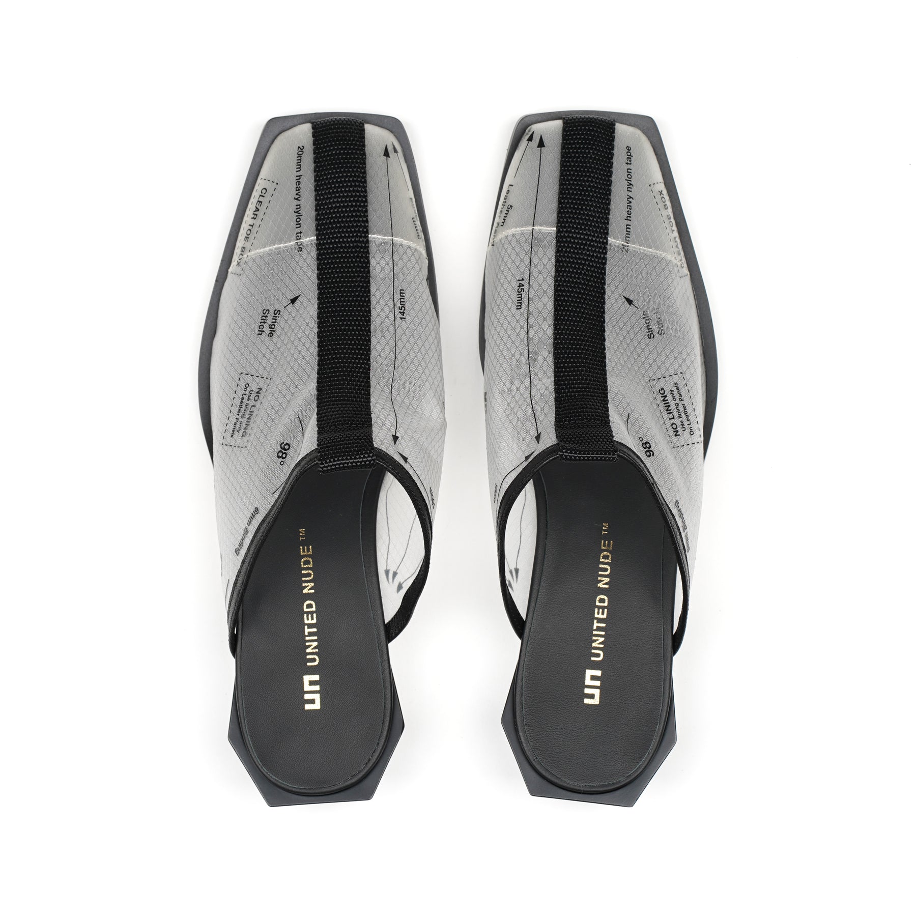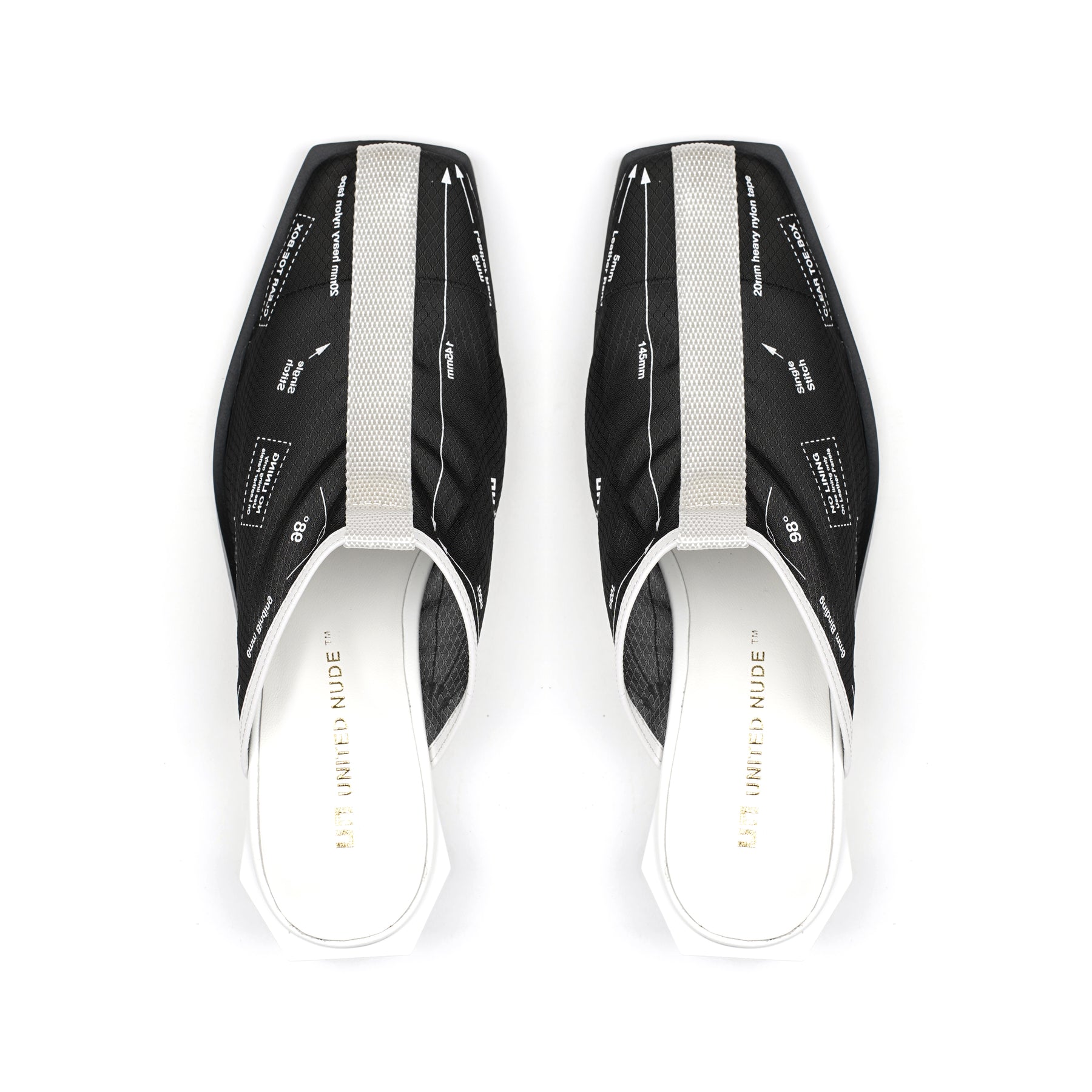 The Rasa Mule is a slip on mule that is lifted by a low geometric block heel. The transparent mesh upper is trimmed with leather and accented with a nylon strip. The heat pressed graphics and striking color breaks are inspired by a series of mixed media paintings by United Nude founder and creative director Rem D. Koolhaas.