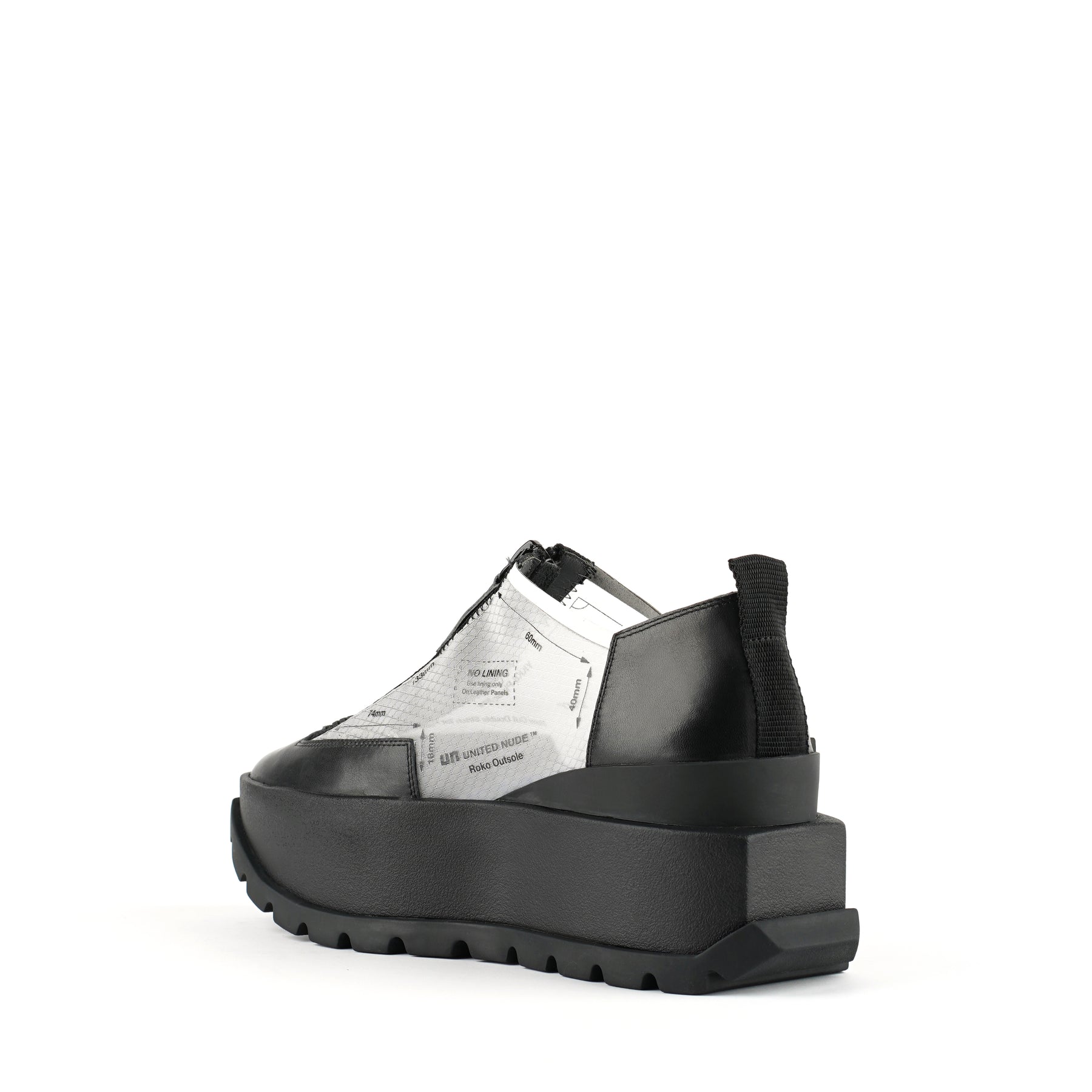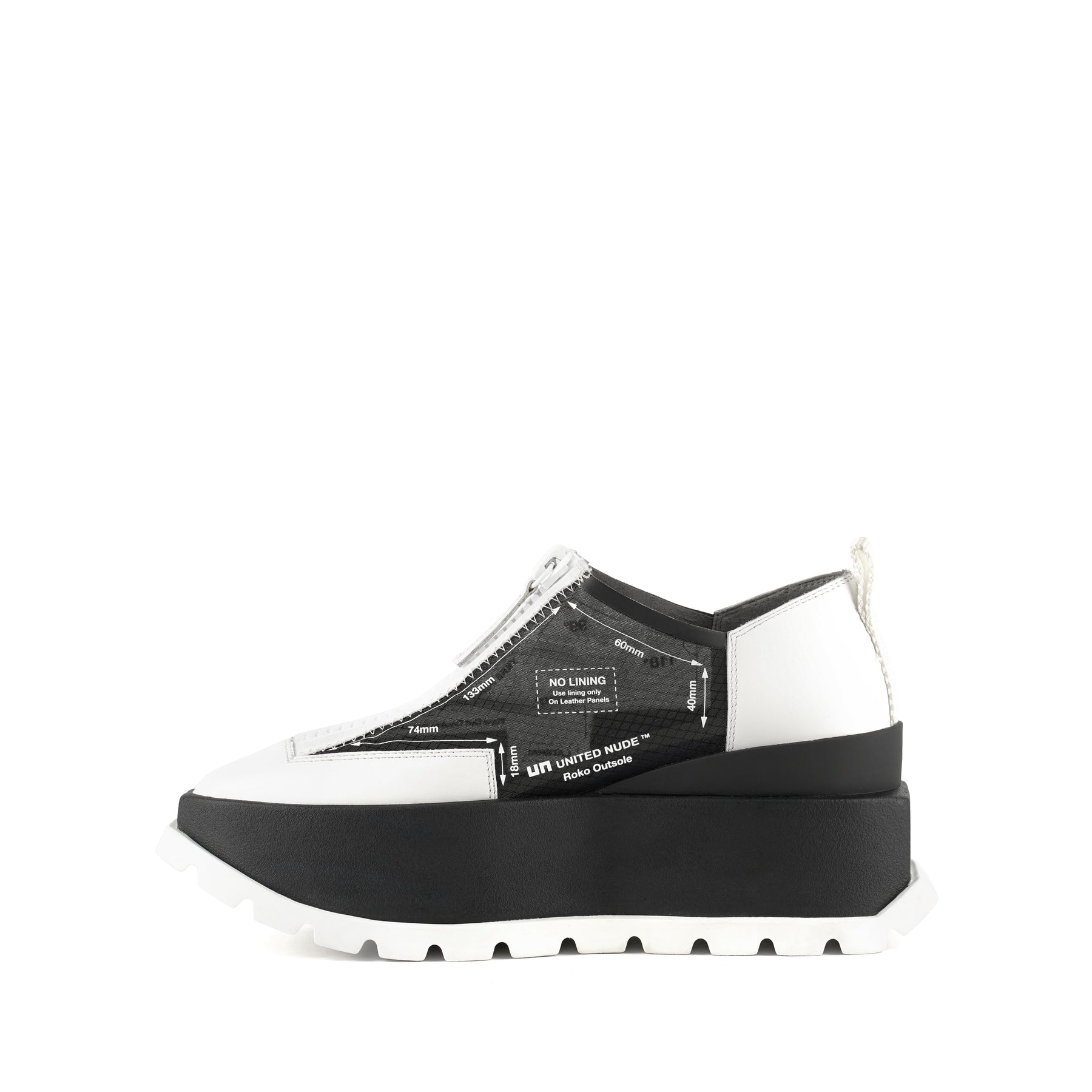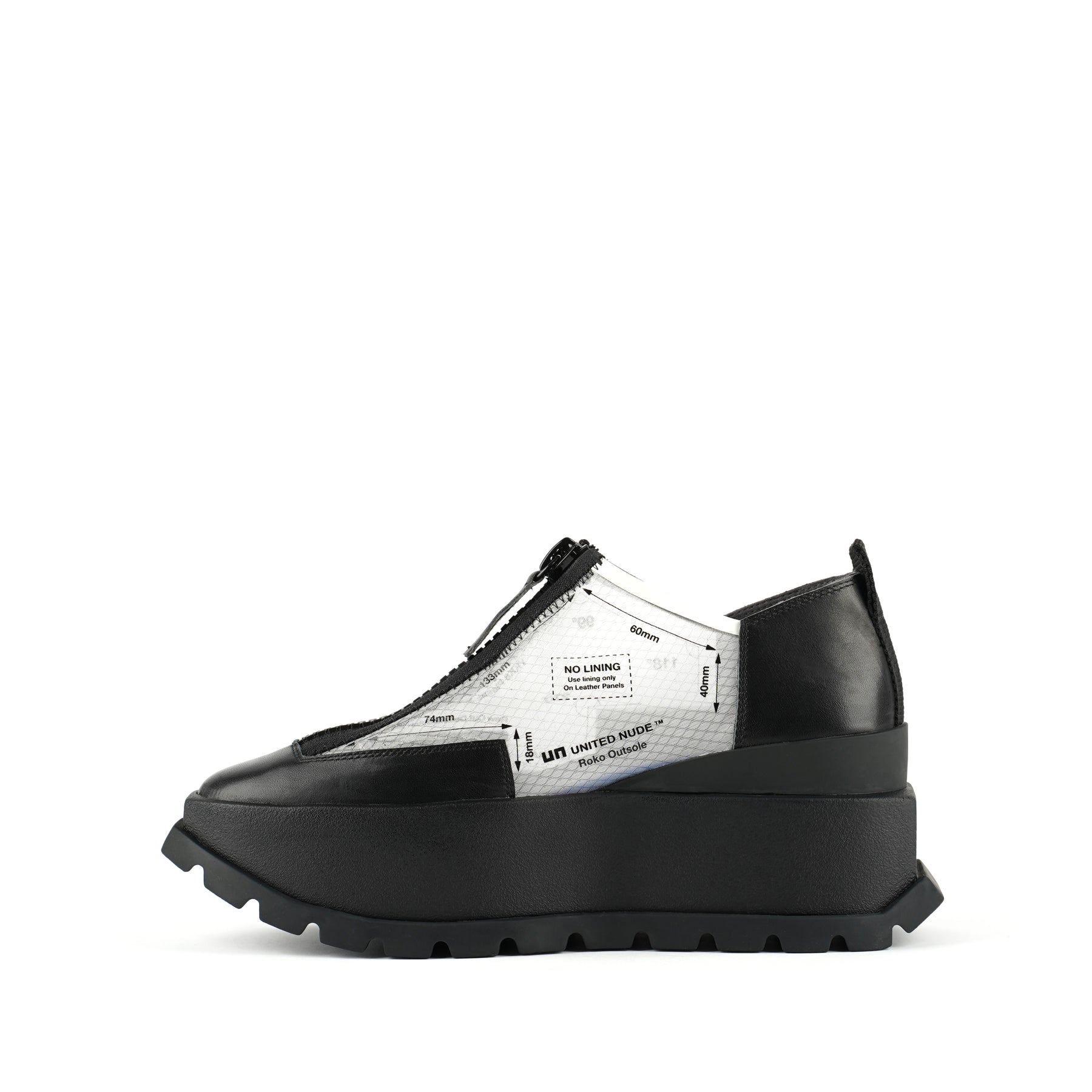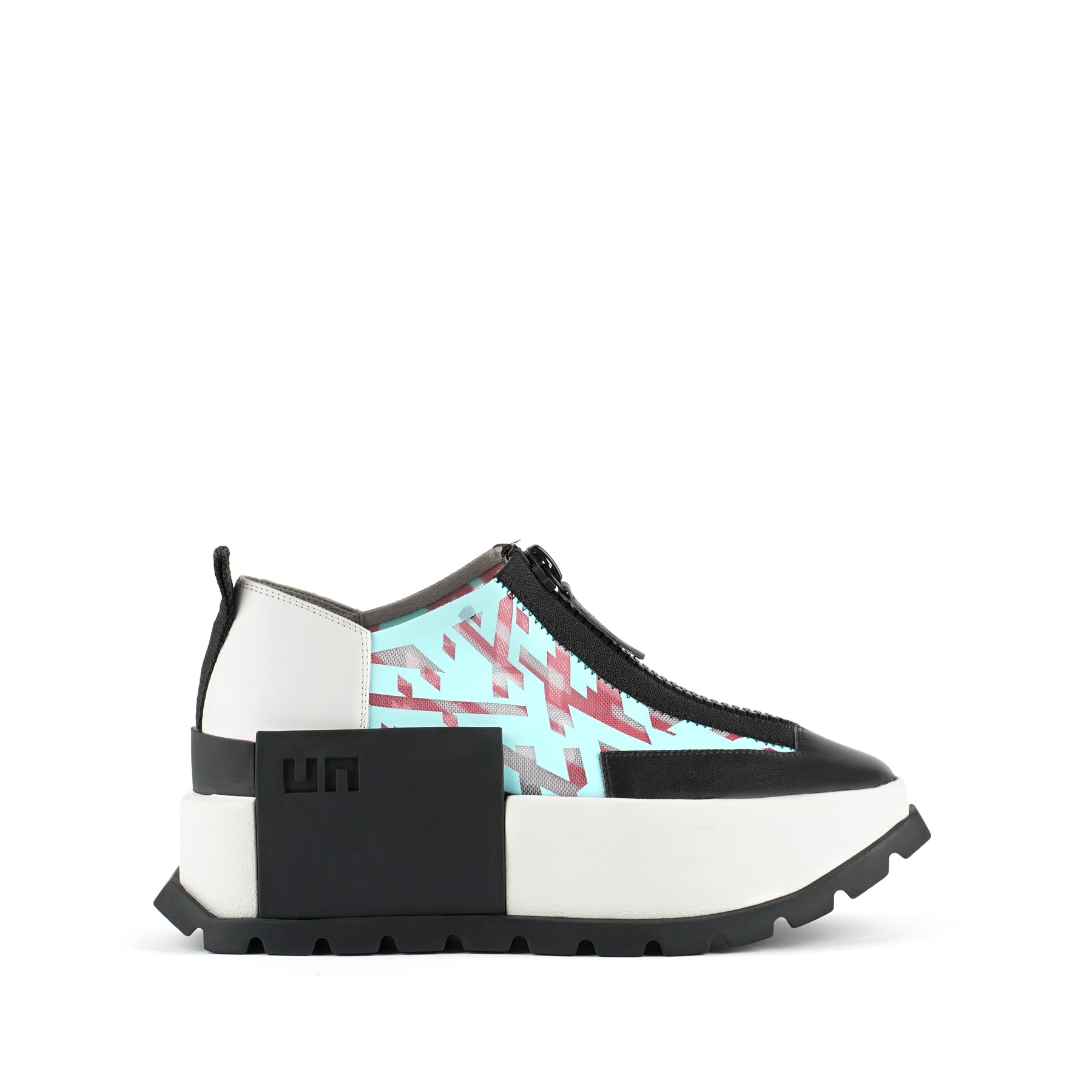 The Rasa Roko is a hybrid sneaker that sits on a bold cleated platform punctuated by a defining block embossed with the UN logo. The signature UN Roko style is updated with a breathable transparent mesh upper with leather accents. The top zipper enclosure allows for easy on and off wear. The heat pressed graphics and striking color breaks are inspired by a series of mixed media paintings by United Nude founder and creative director Rem D. Koolhaas.