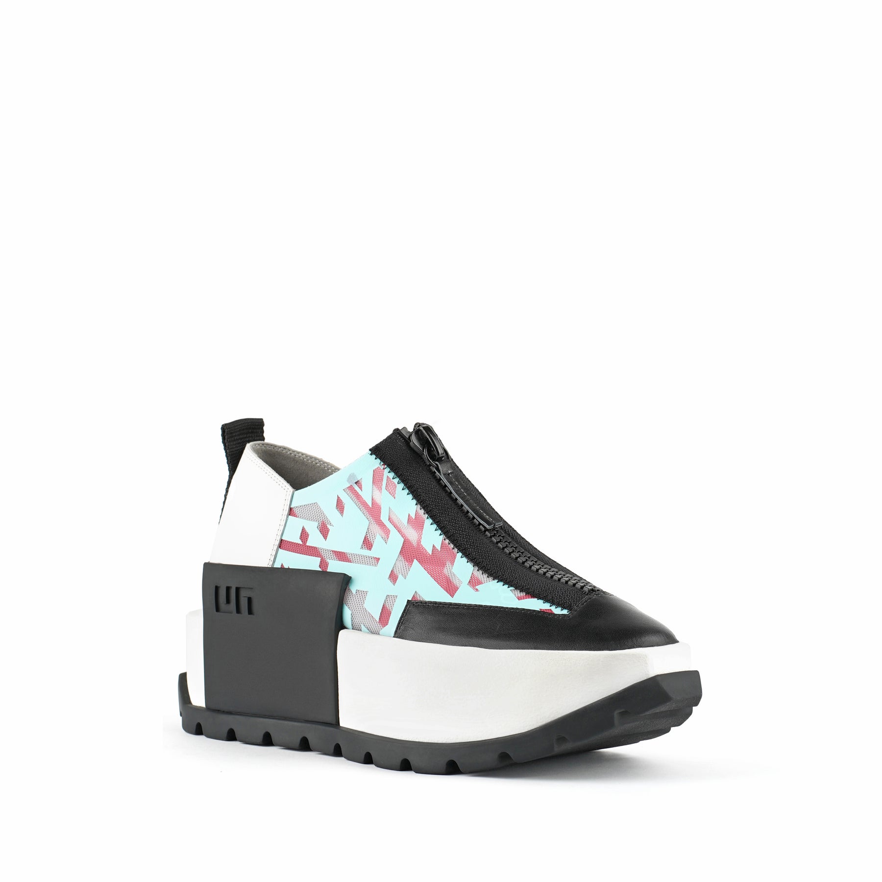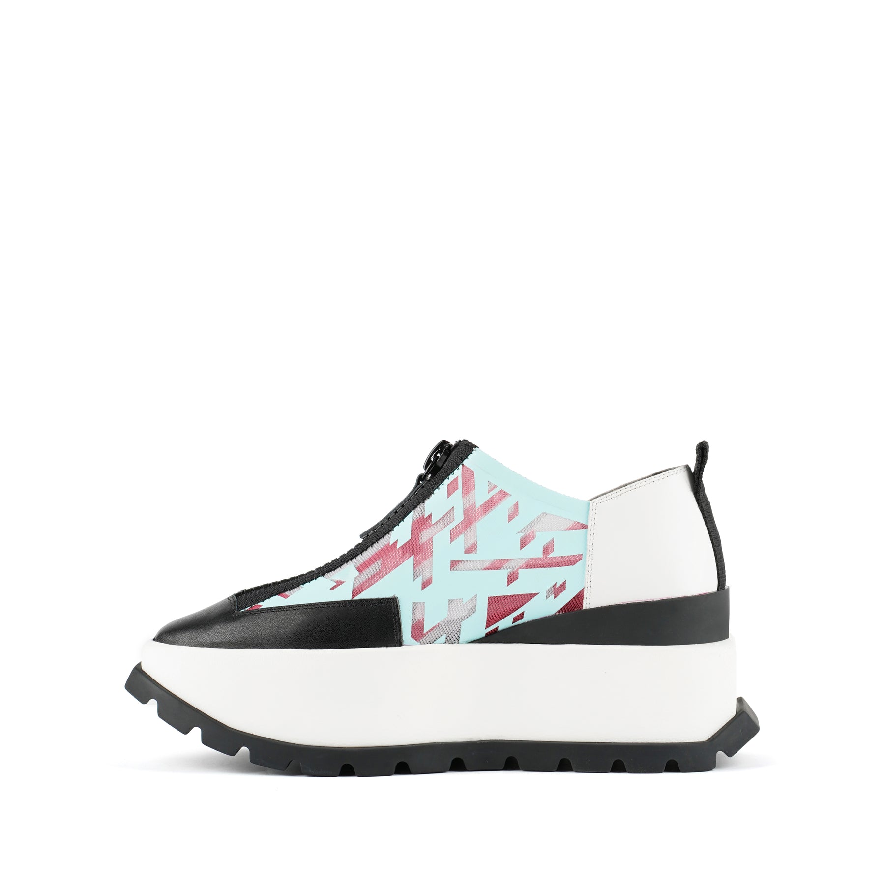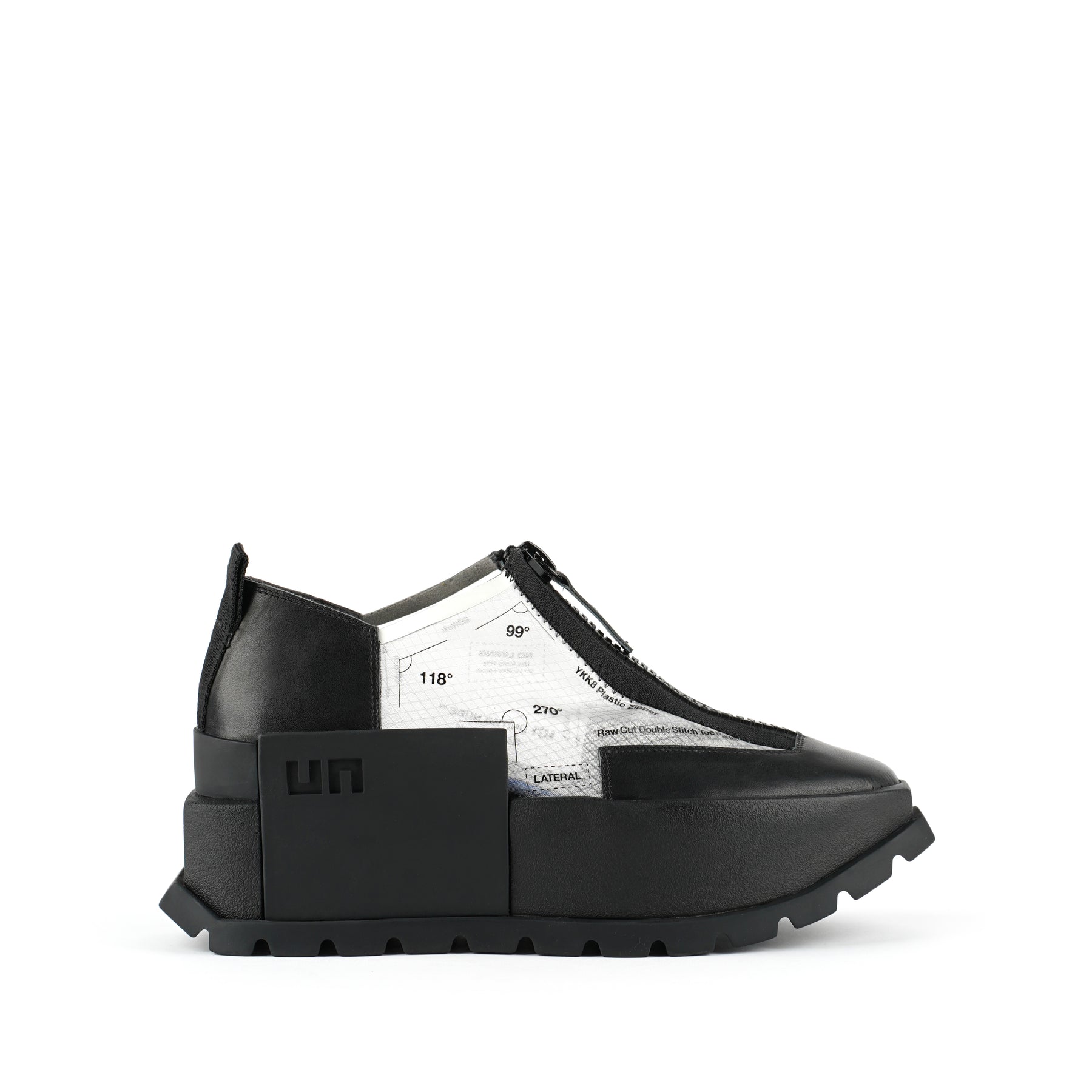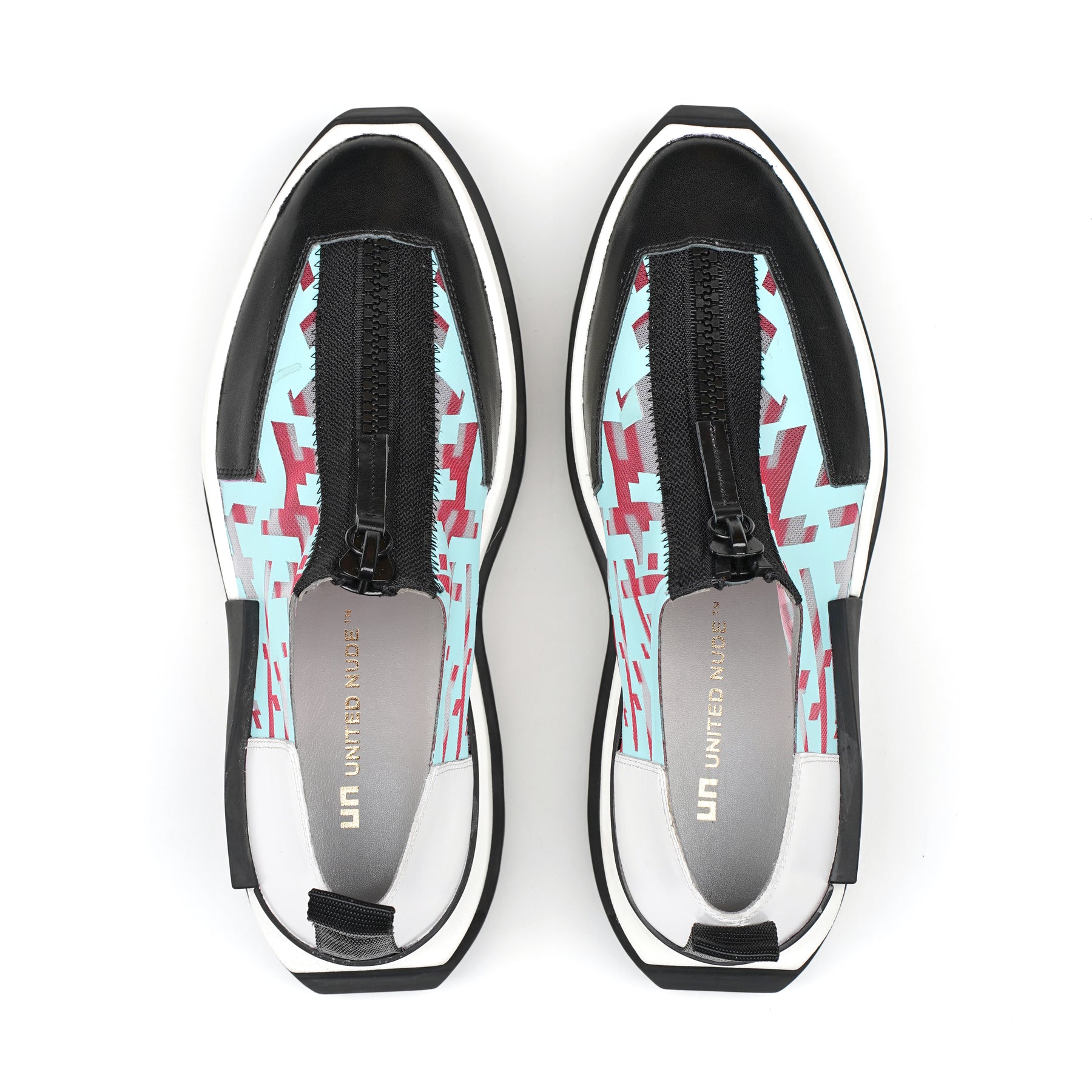 The Rasa Roko is a hybrid sneaker that sits on a bold cleated platform punctuated by a defining block embossed with the UN logo. The signature UN Roko style is updated with a breathable transparent mesh upper with leather accents. The top zipper enclosure allows for easy on and off wear. The heat pressed graphics and striking color breaks are inspired by a series of mixed media paintings by United Nude founder and creative director Rem D. Koolhaas.