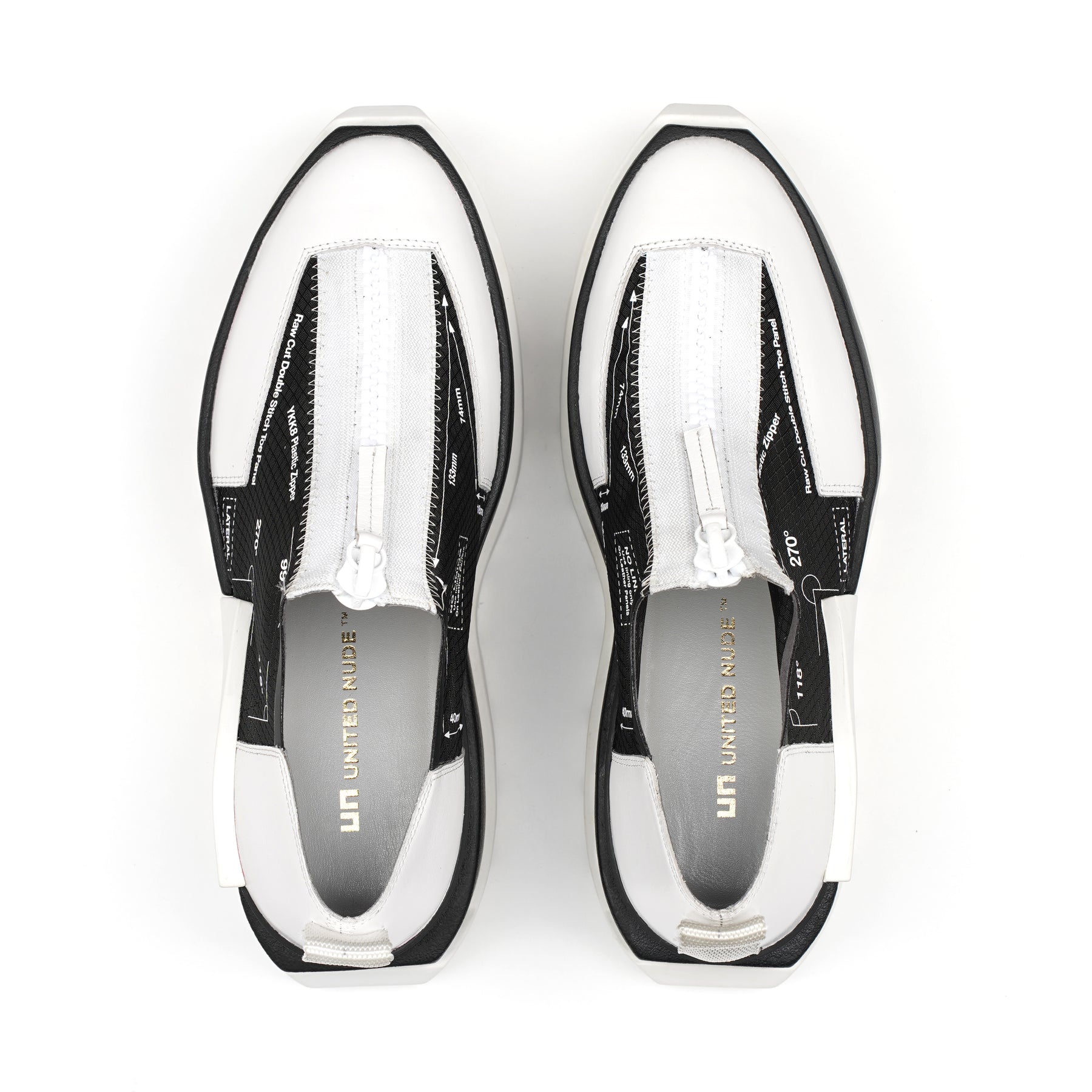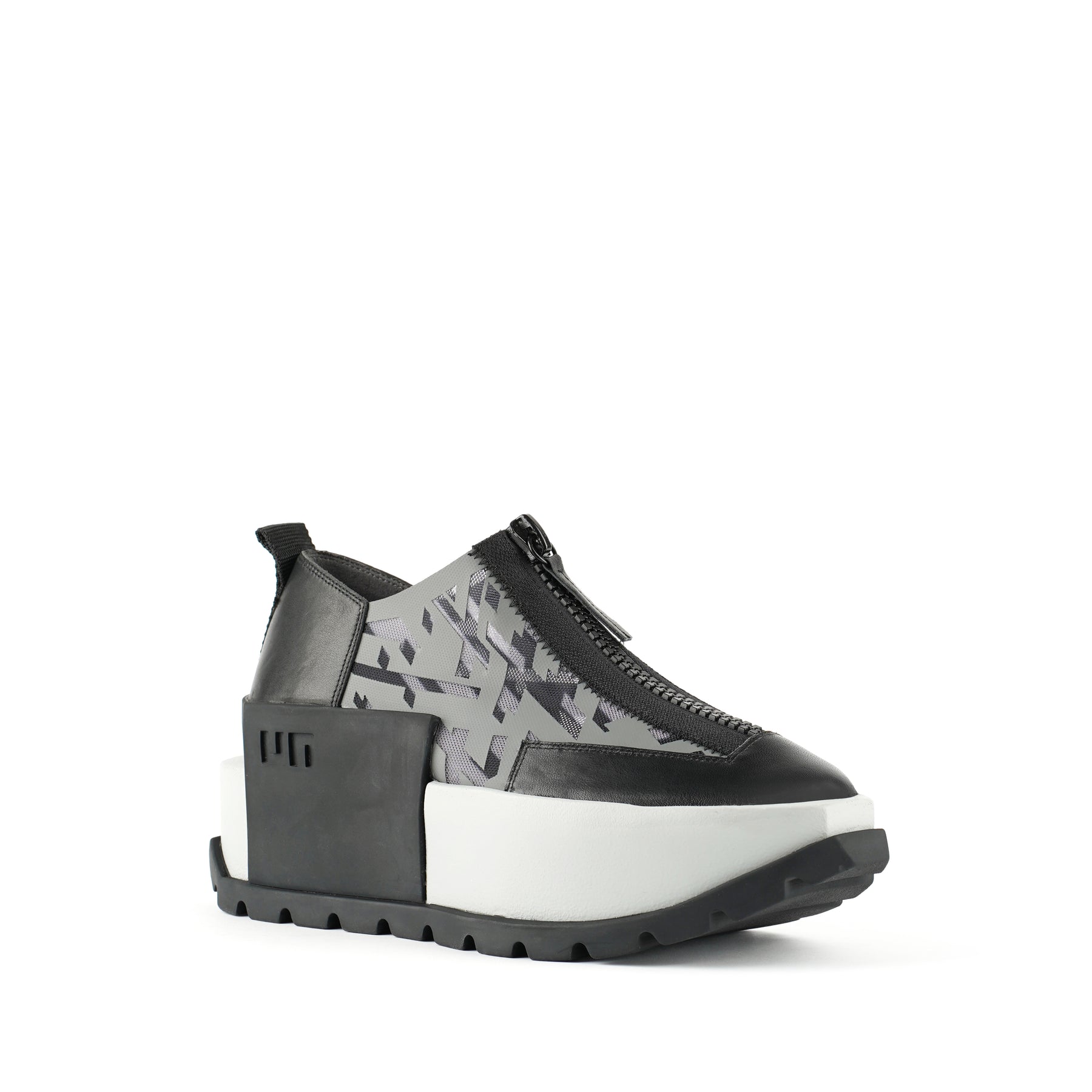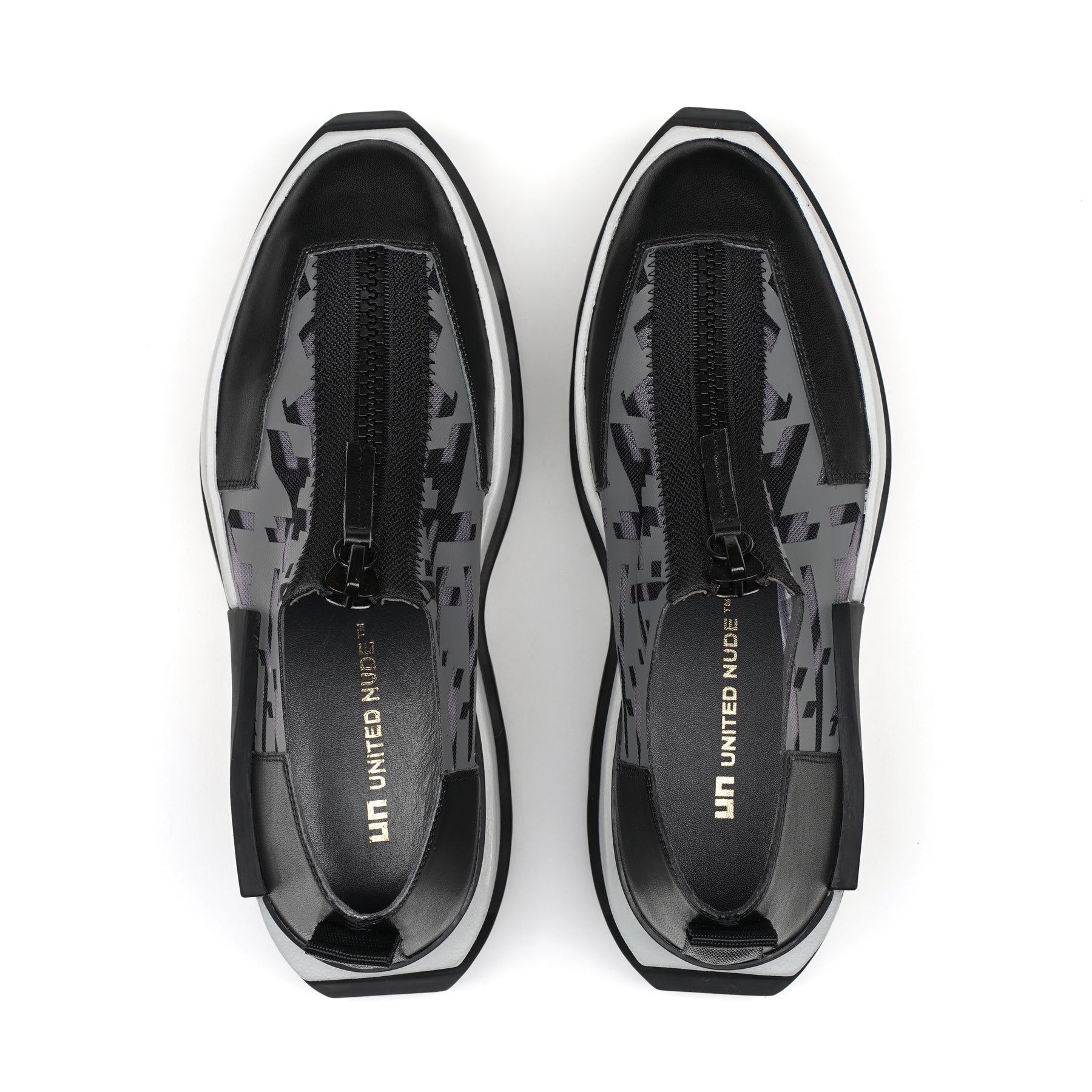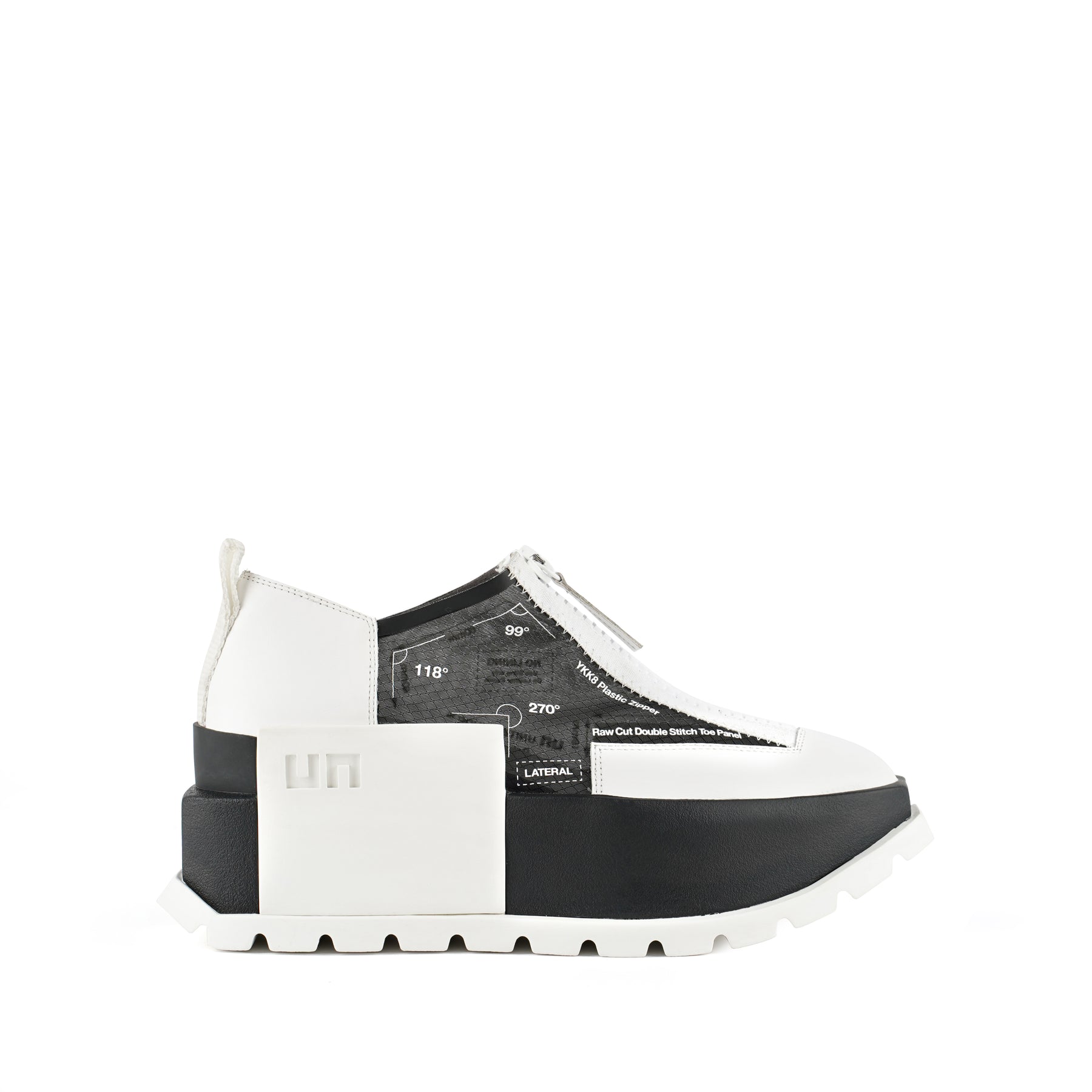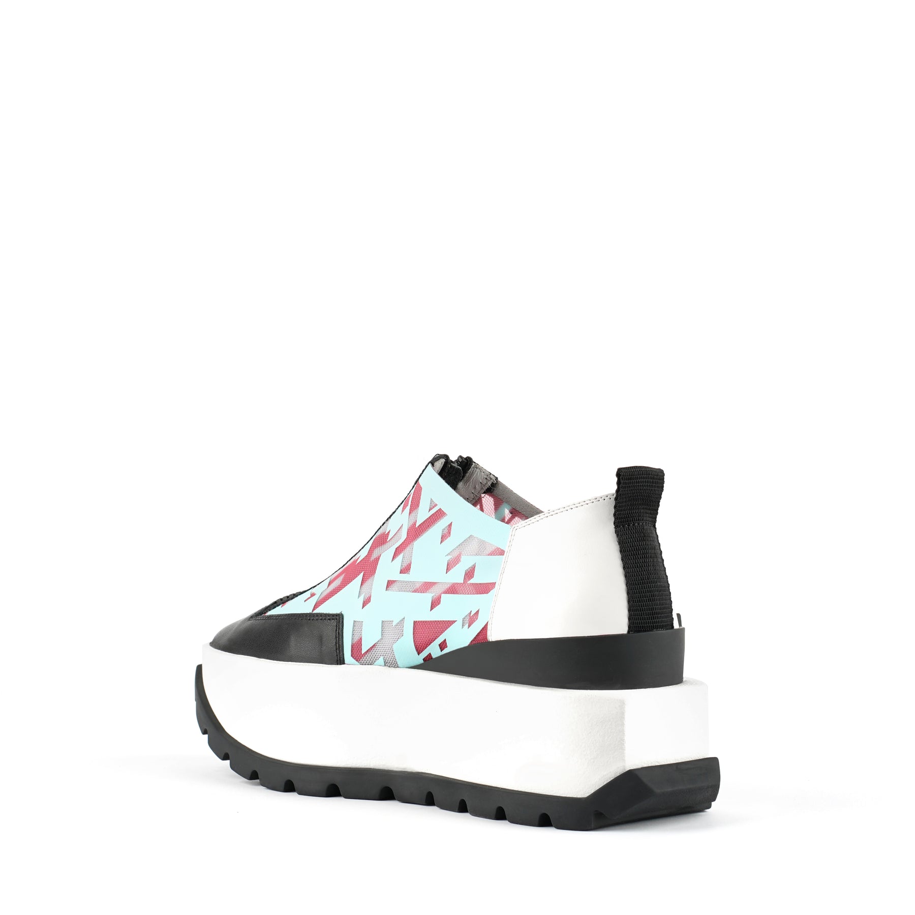The Rasa Roko is a hybrid sneaker that sits on a bold cleated platform punctuated by a defining block embossed with the UN logo. The signature UN Roko style is updated with a breathable transparent mesh upper with leather accents. The top zipper enclosure allows for easy on and off wear. The heat pressed graphics and striking color breaks are inspired by a series of mixed media paintings by United Nude founder and creative director Rem D. Koolhaas.