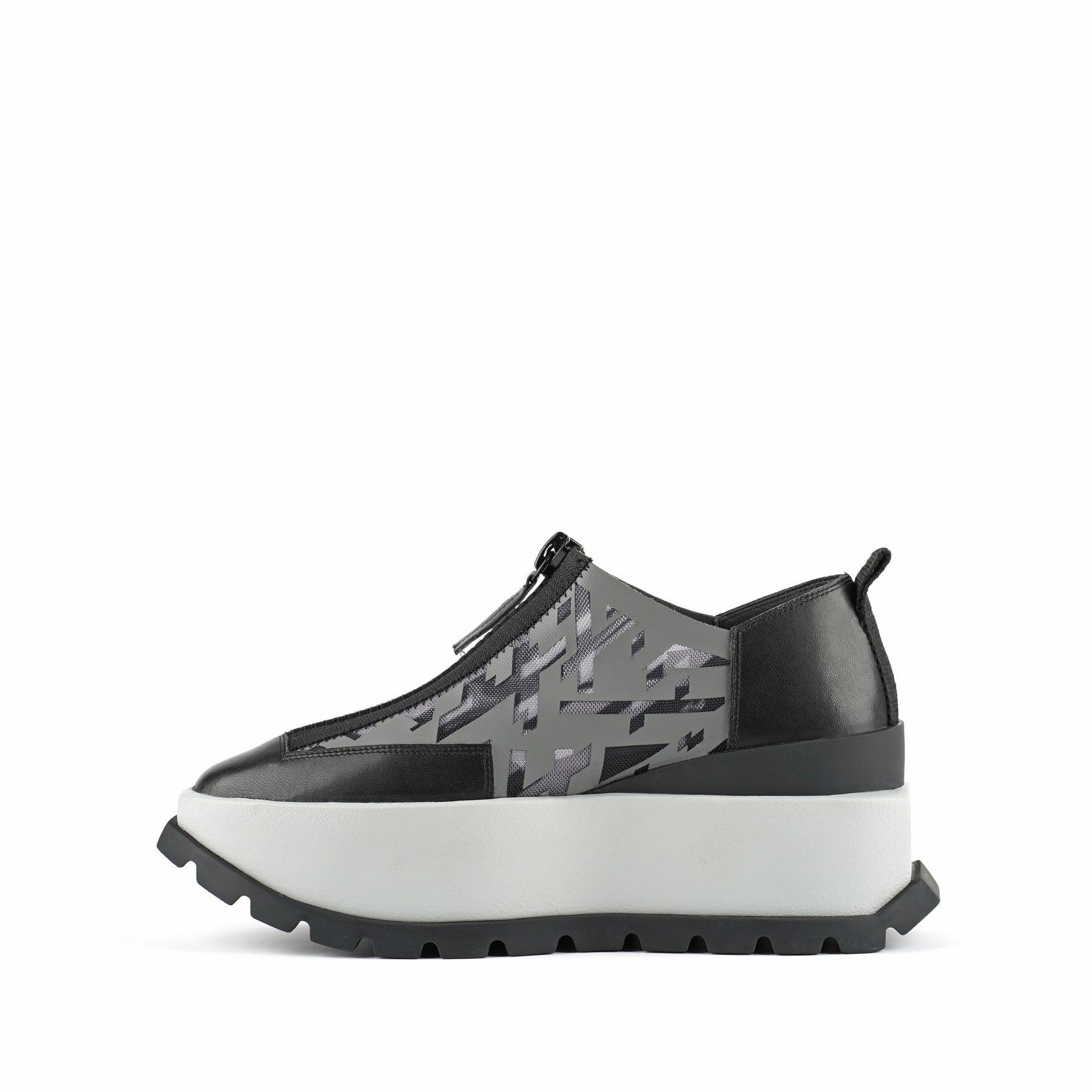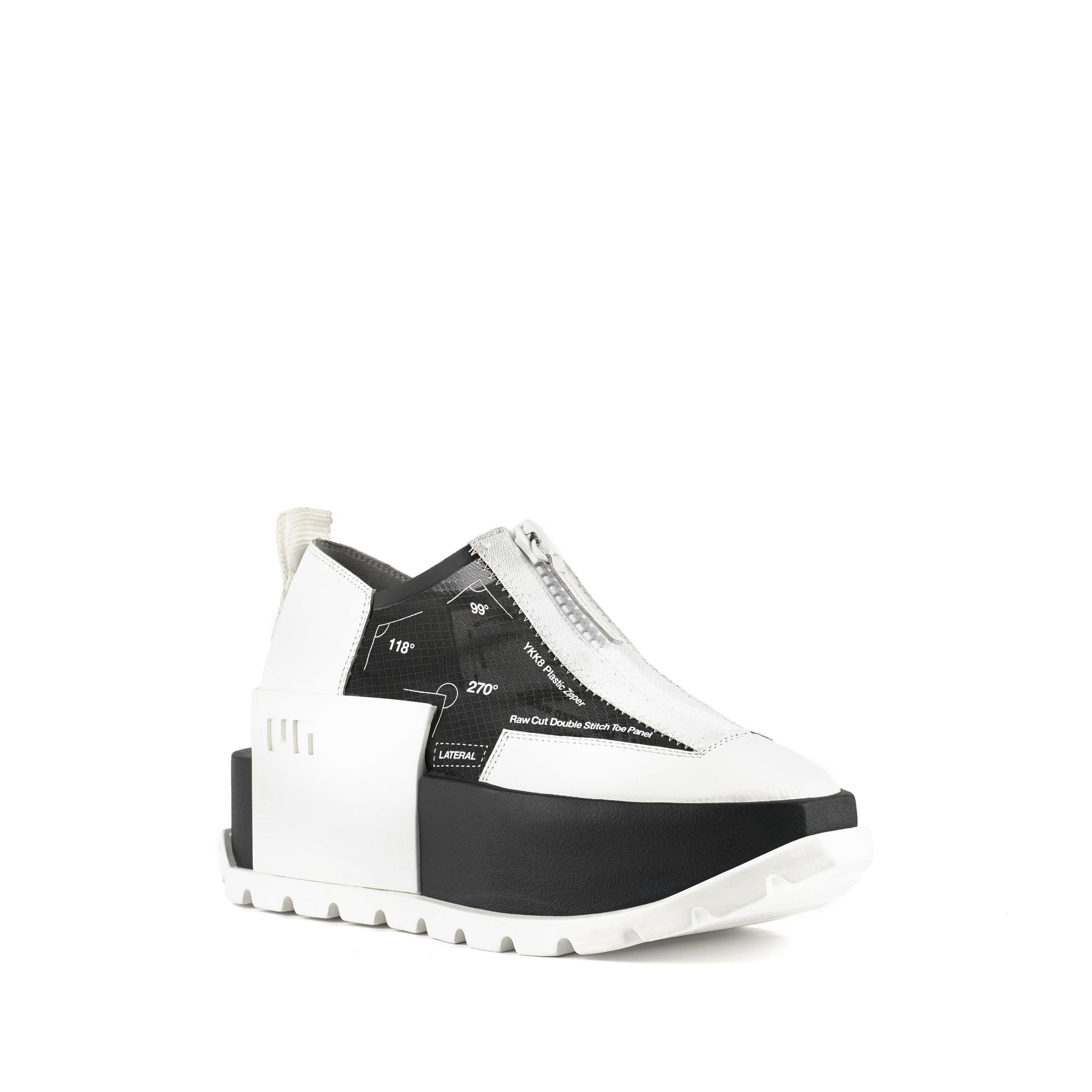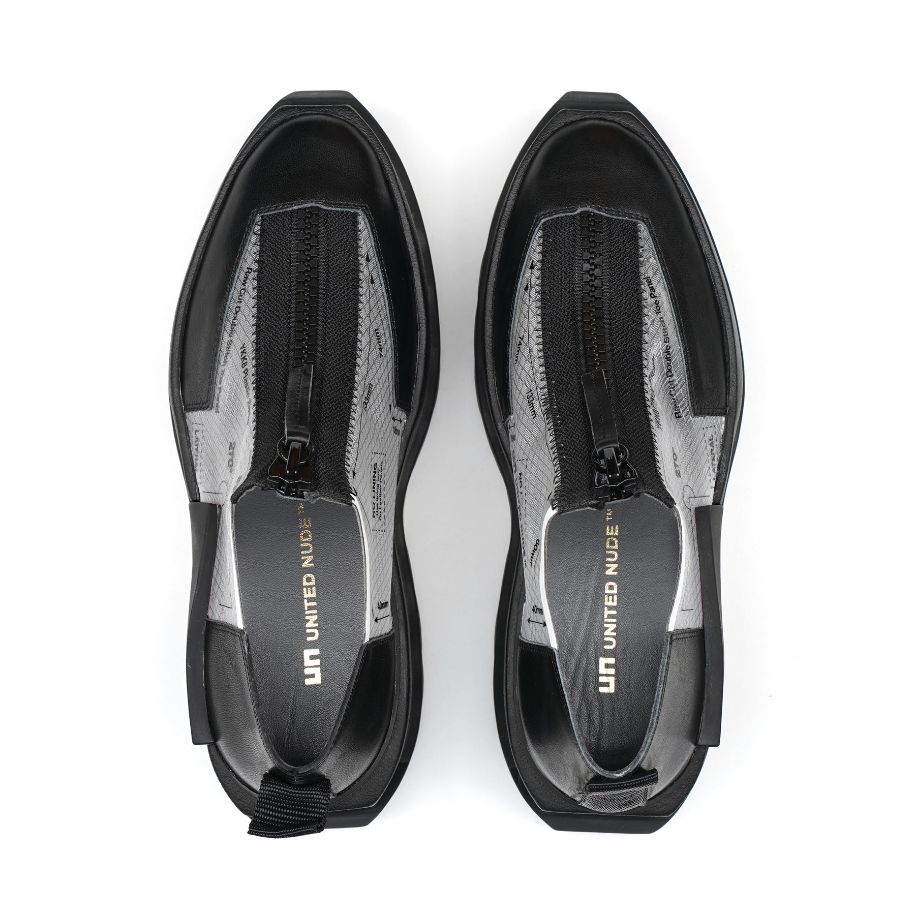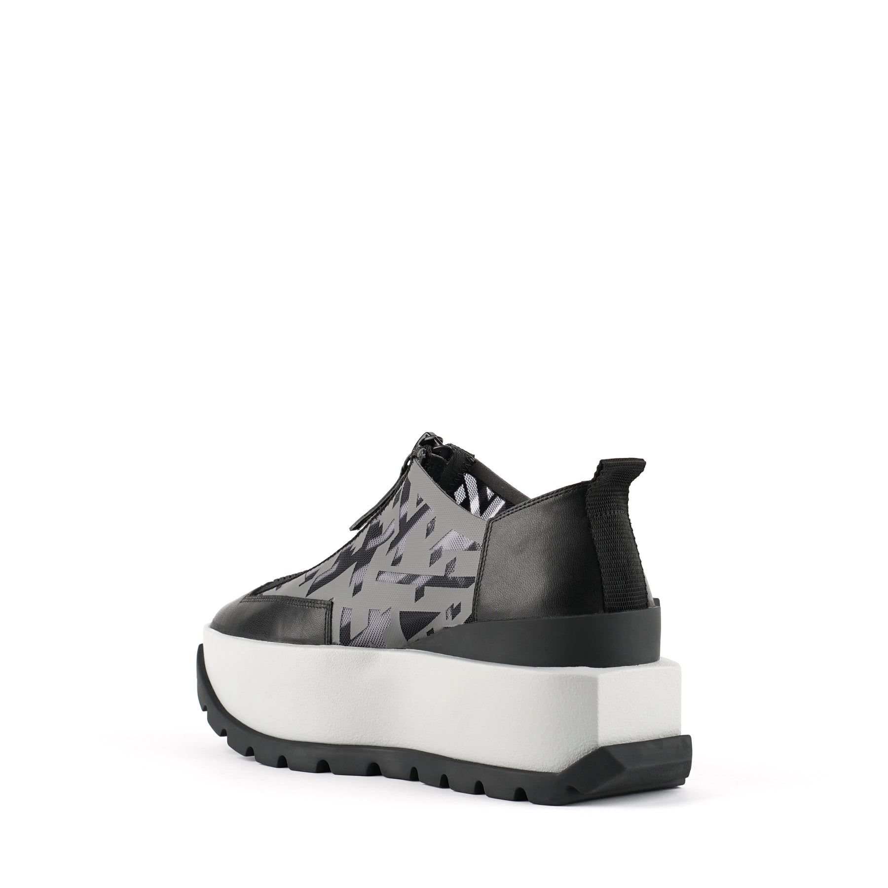 The Rasa Roko is a hybrid sneaker that sits on a bold cleated platform punctuated by a defining block embossed with the UN logo. The signature UN Roko style is updated with a breathable transparent mesh upper with leather accents. The top zipper enclosure allows for easy on and off wear. The heat pressed graphics and striking color breaks are inspired by a series of mixed media paintings by United Nude founder and creative director Rem D. Koolhaas.