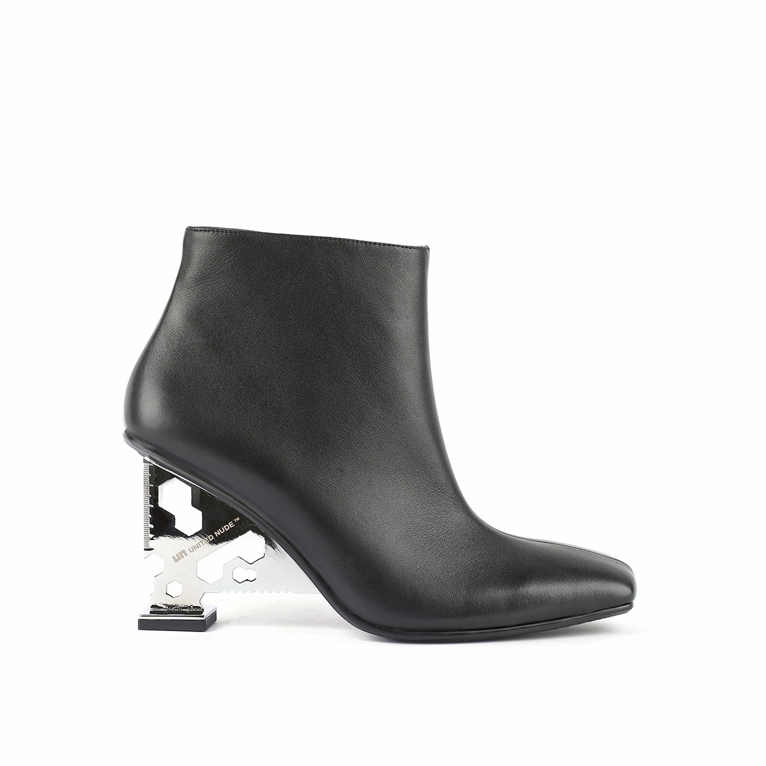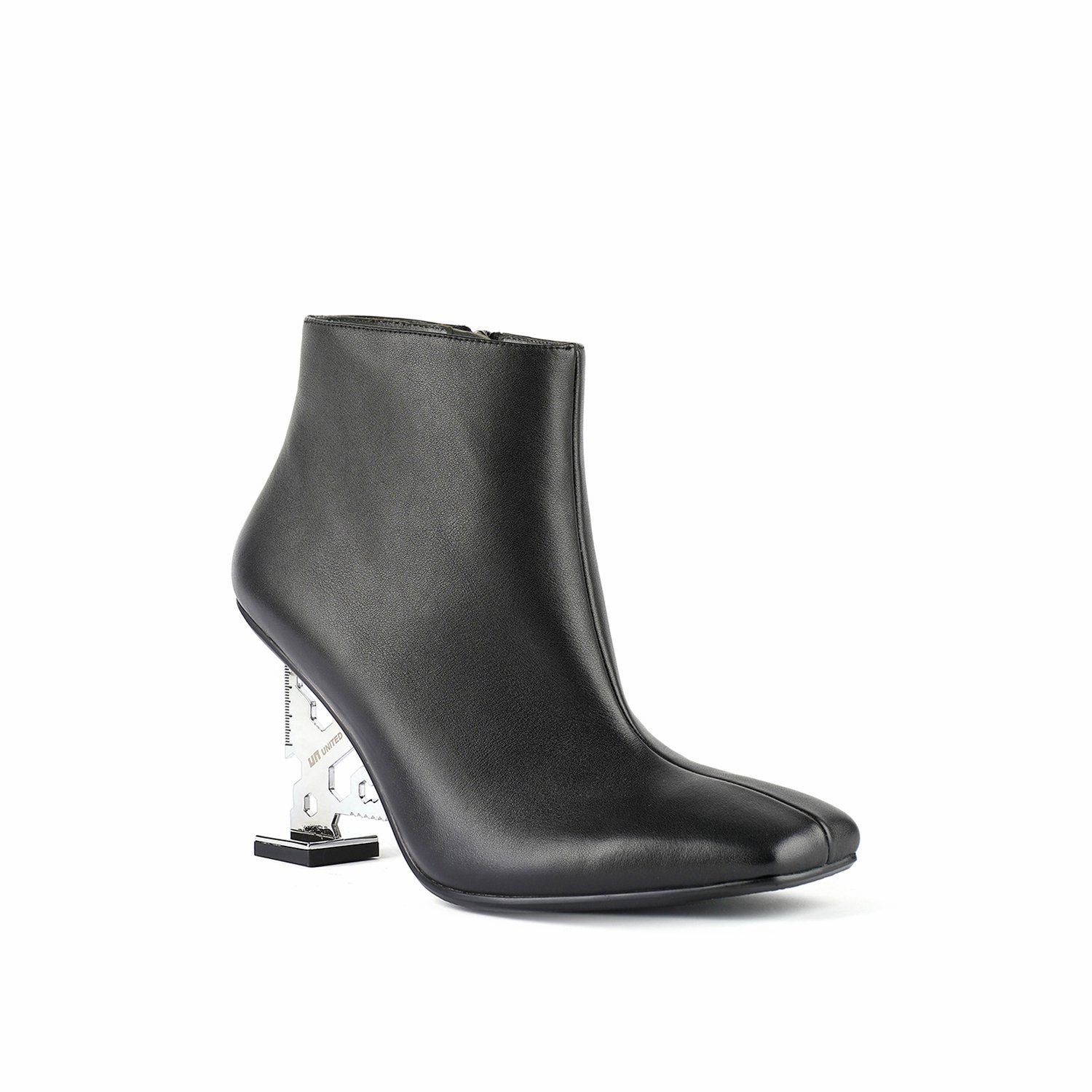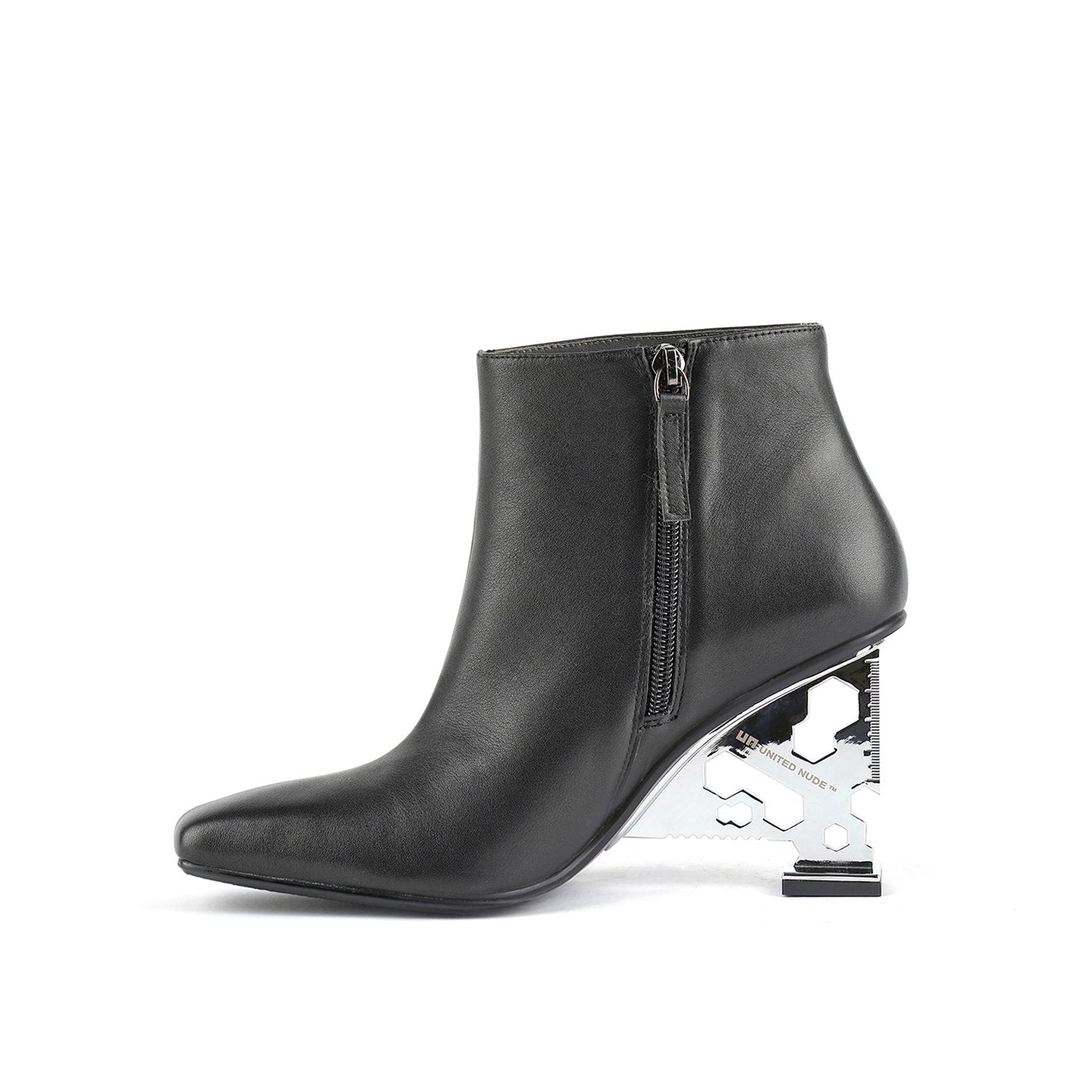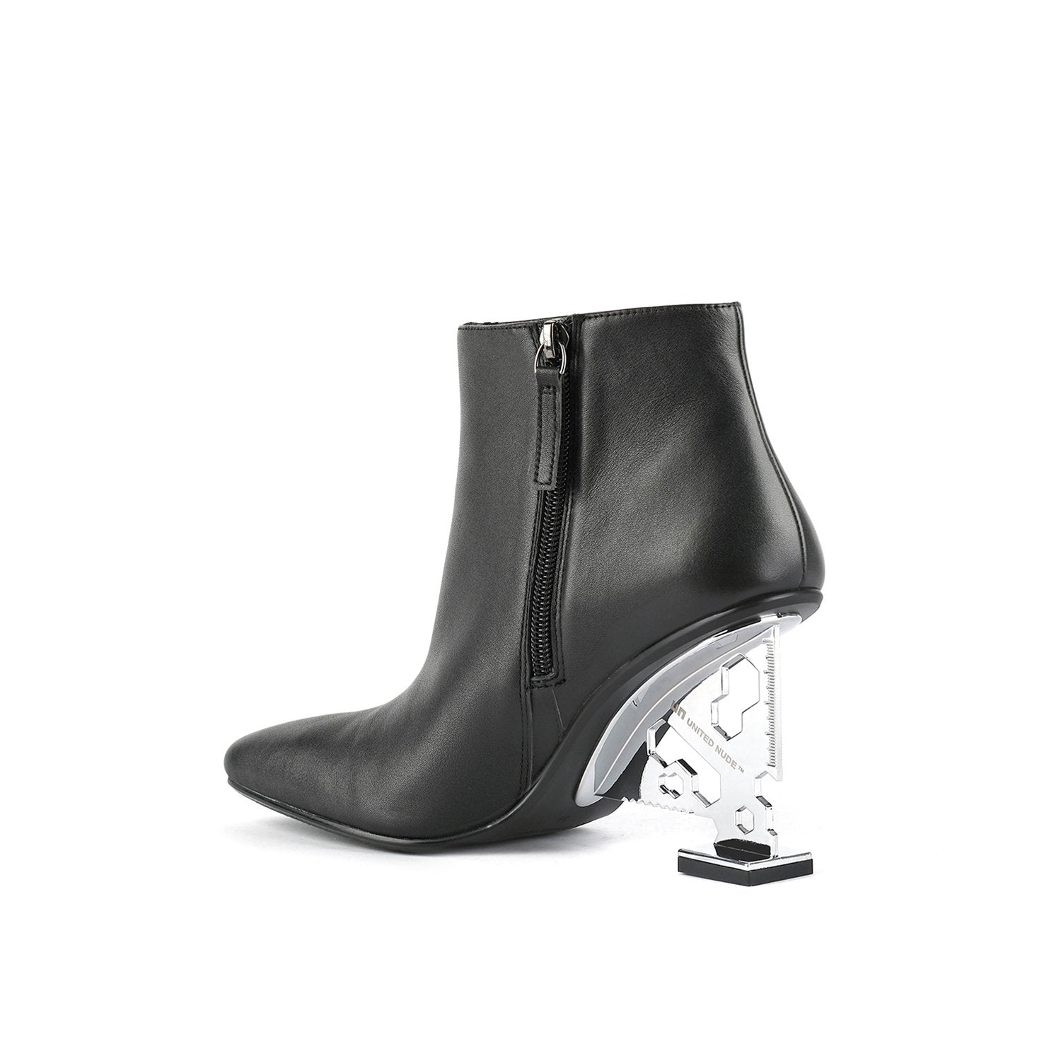 The Tool is a pointy toe bootie. The super sleek, minimal upper is lifted by a statement 45-degree metal heel.