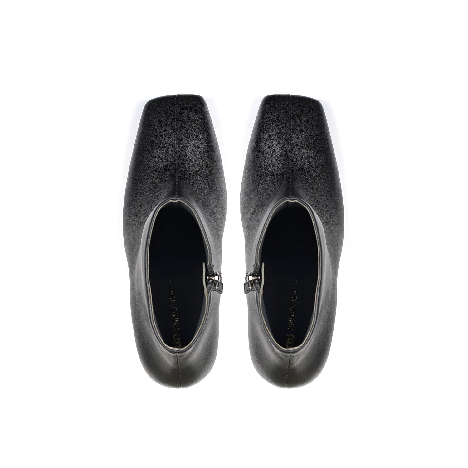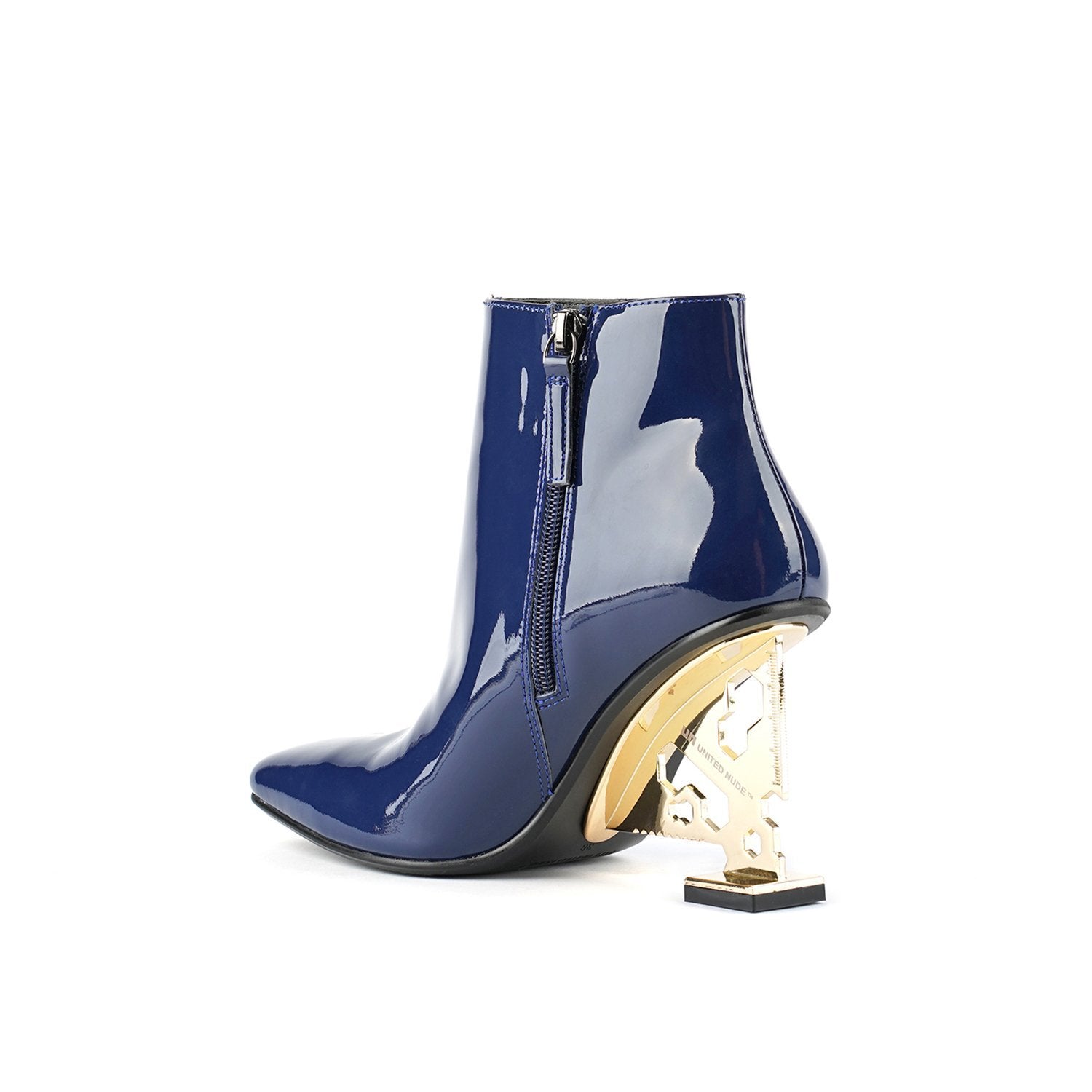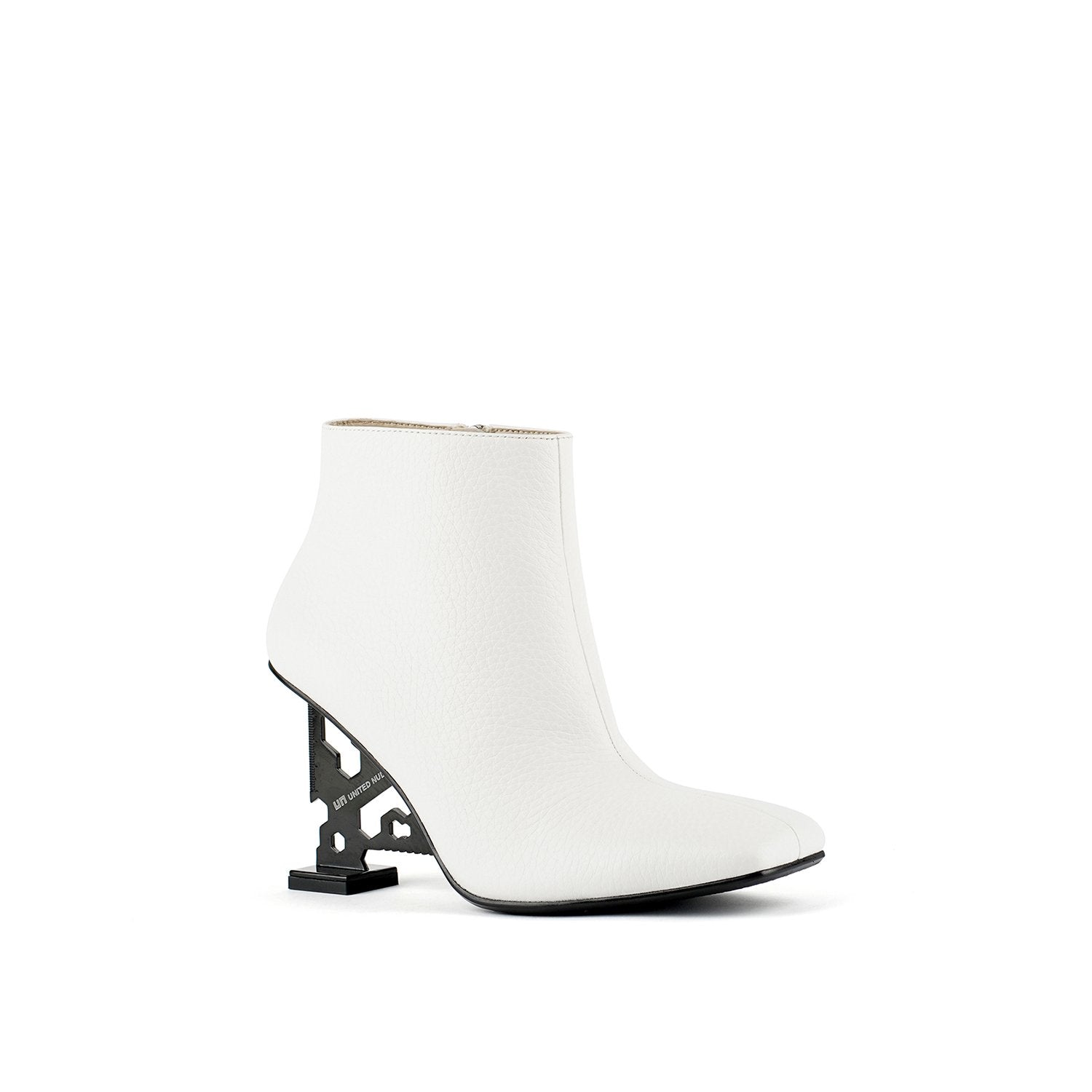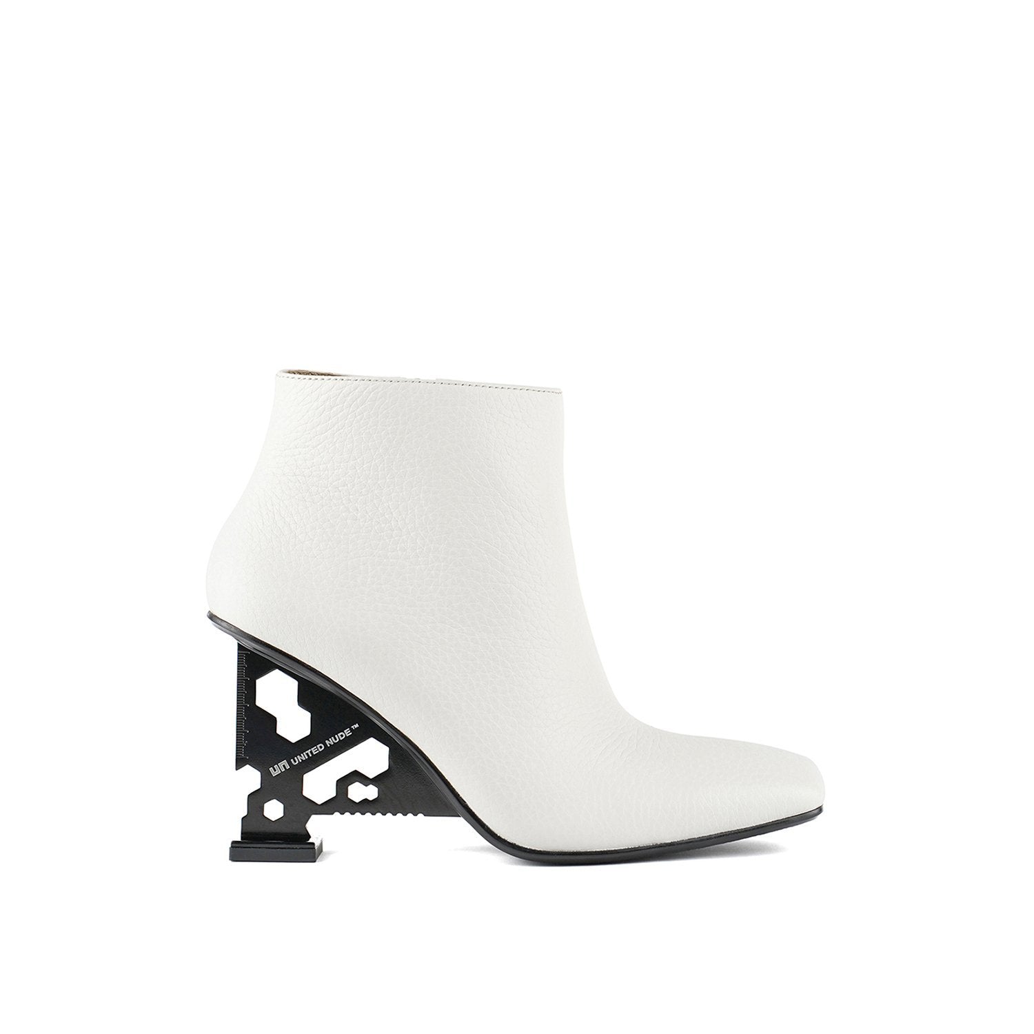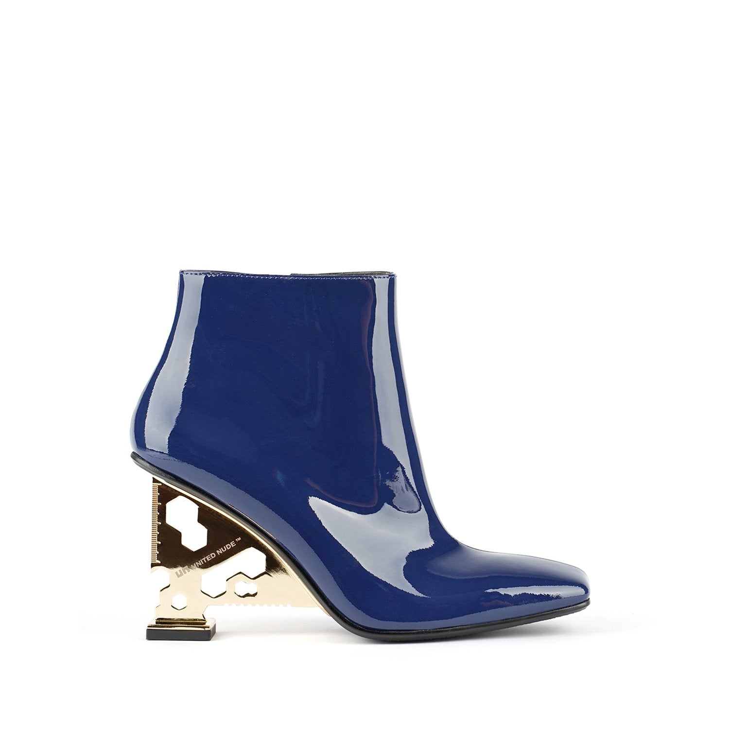 The Tool is a pointy toe bootie. The super sleek, minimal upper is lifted by a statement 45-degree metal heel.