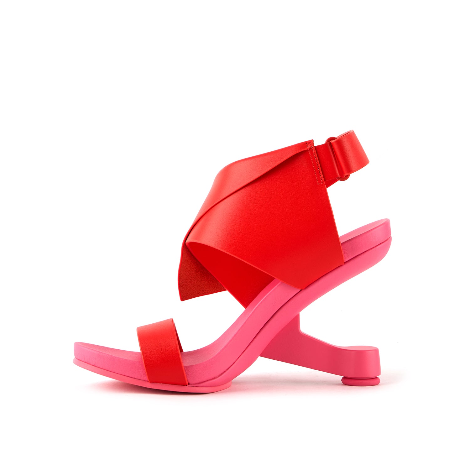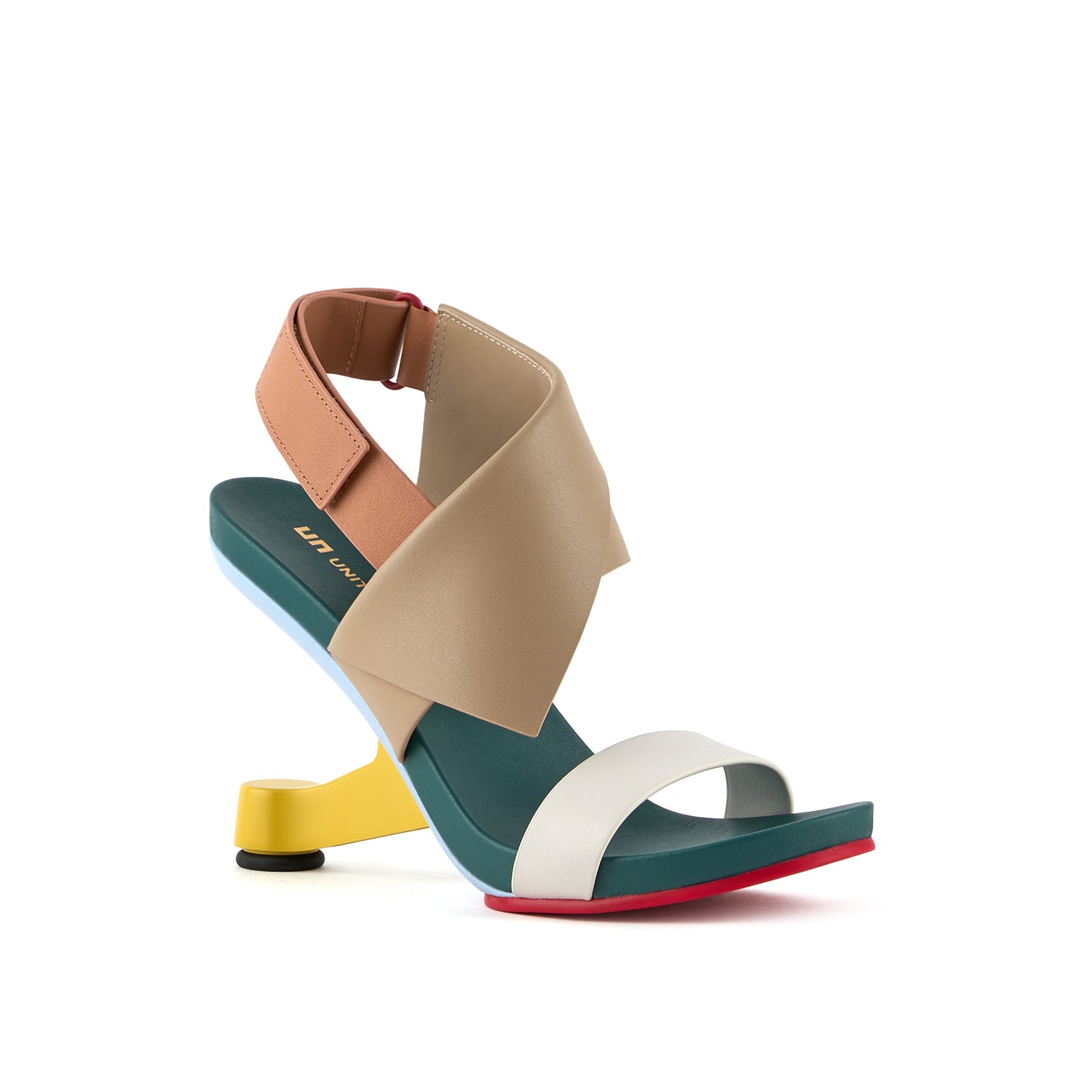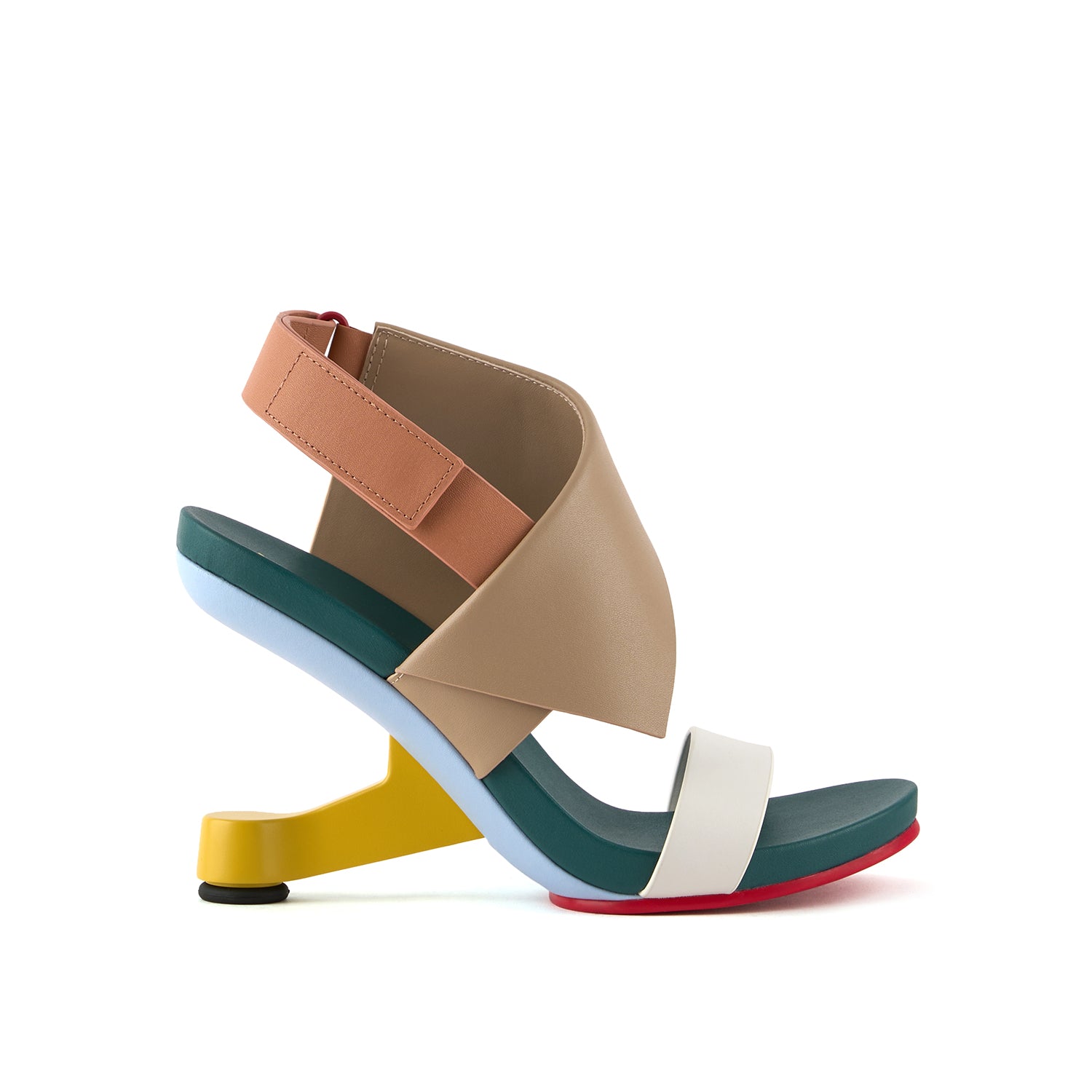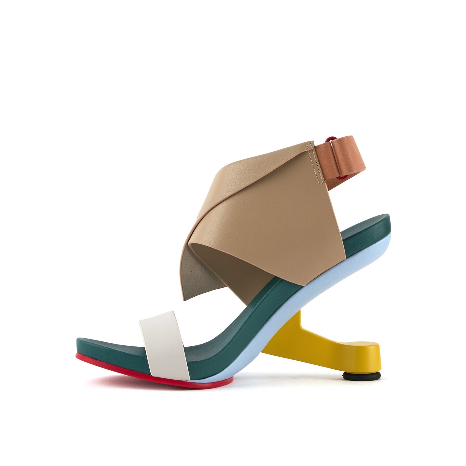 The Eamz Polo is a high heel sandal featuring an overlapping upper, an adjustable ankle strap, and the iconic United Nude Eamz heel. The Eamz heel is inspired by the sleek, modern aesthetic and innovative use of materials found in Charles and Ray Eames' iconic designs. Its distinctive, aluminum-casted structure creates a floating effect that makes the wearer appear suspended above the ground.
