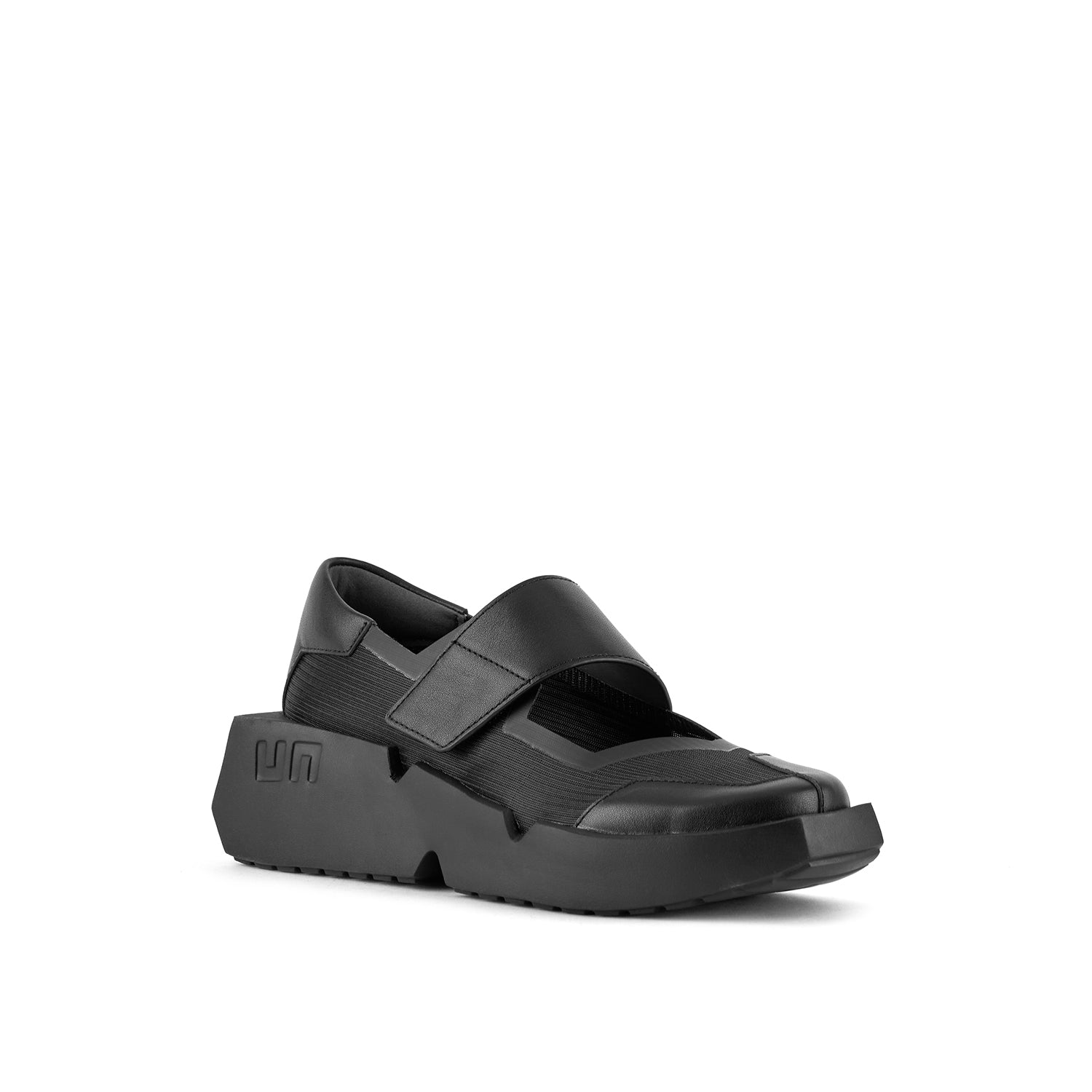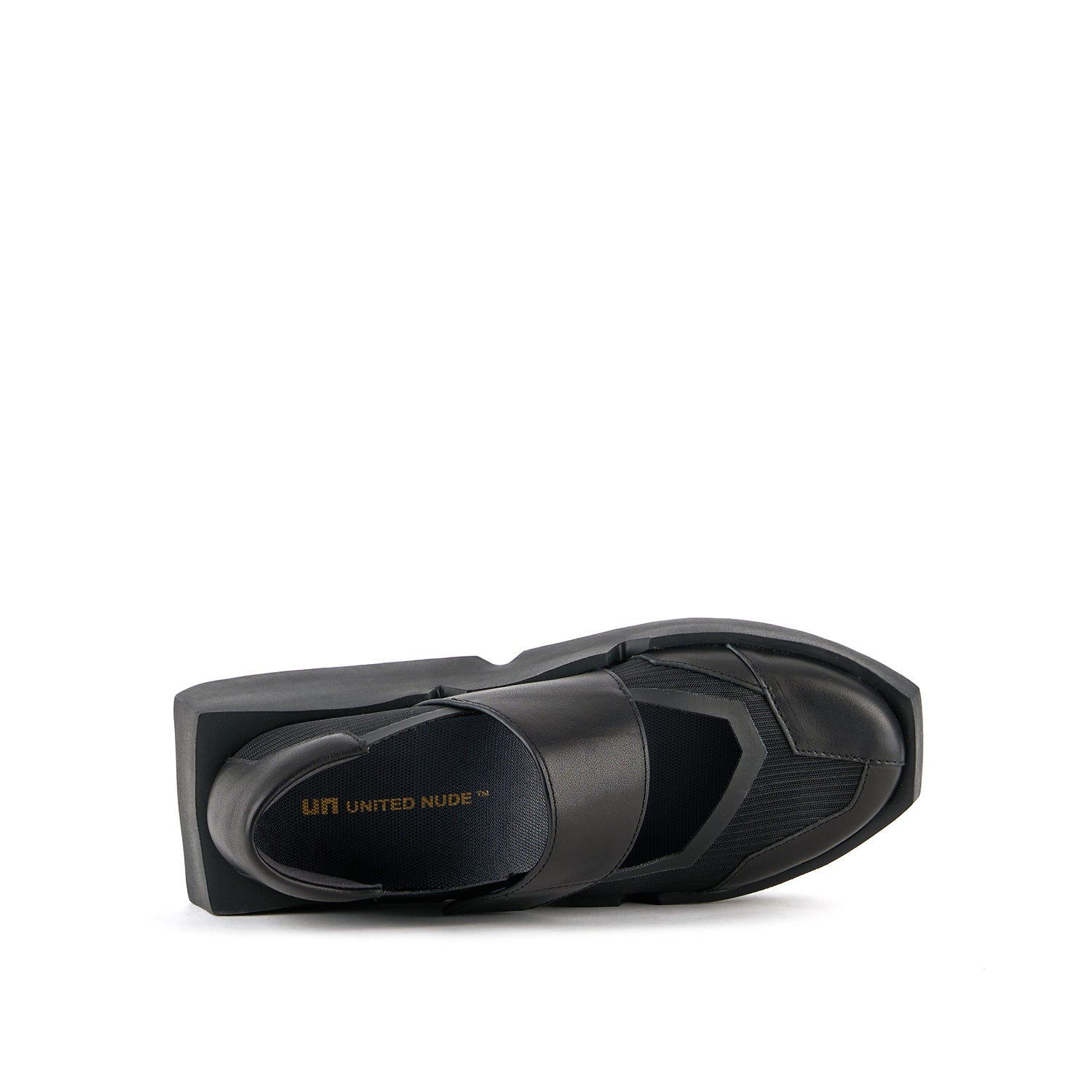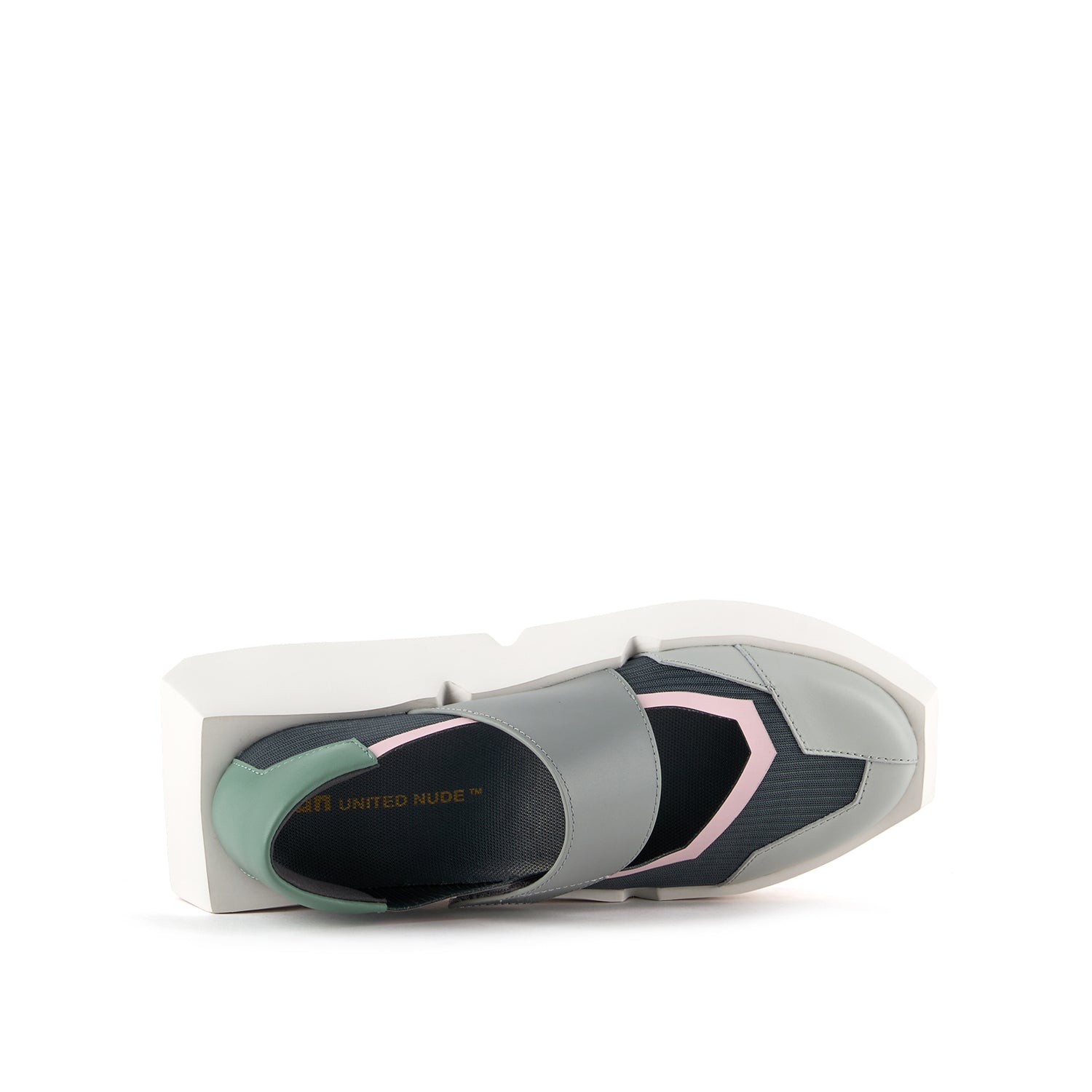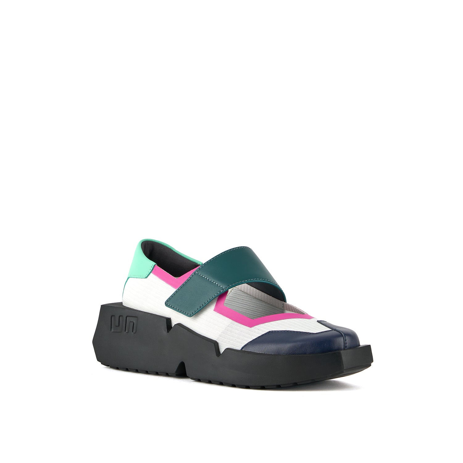 The Mega Robot Jane is a sporty, lightweight Mary Jane that blends technical design with bold, architectural style. Featuring a geometric leather upper, it creates a modern, graphic look with a comfortable, flexible fit. An adjustable hook-and-loop velcro strap secures the foot, while the brutalist, block-shaped EVA rubber outsole—embossed with the iconic United Nude logo—adds statement volume and cushioned support.