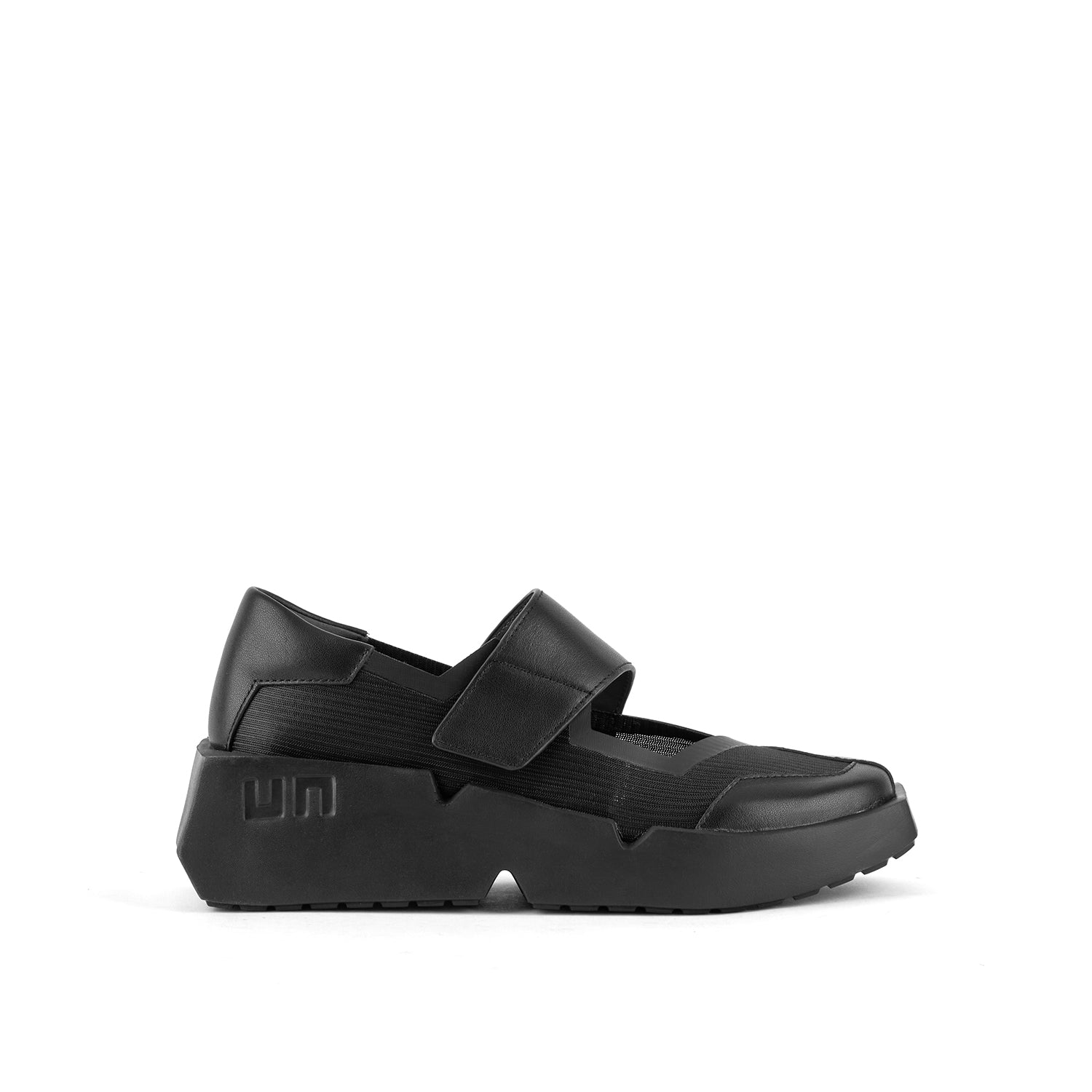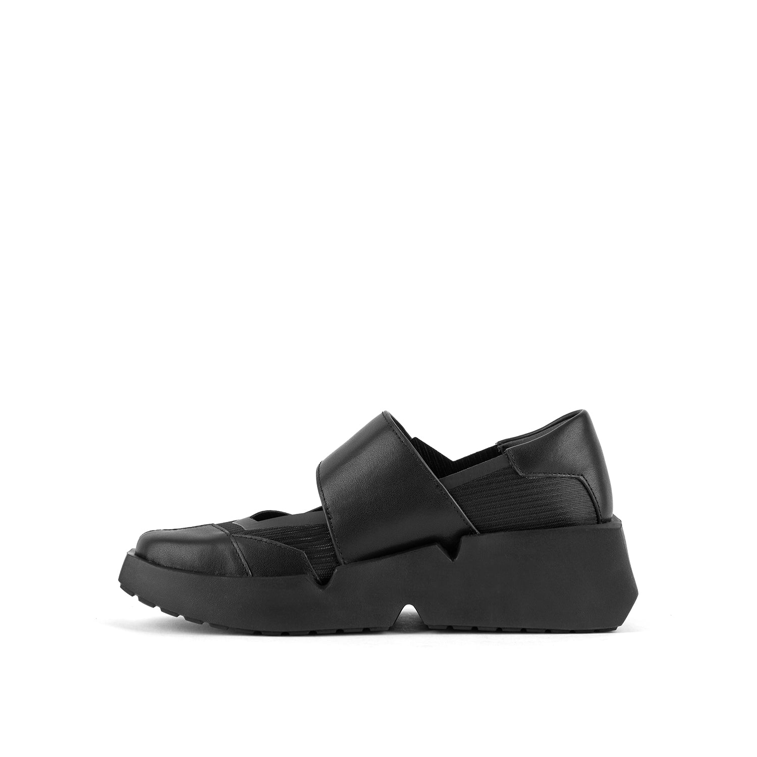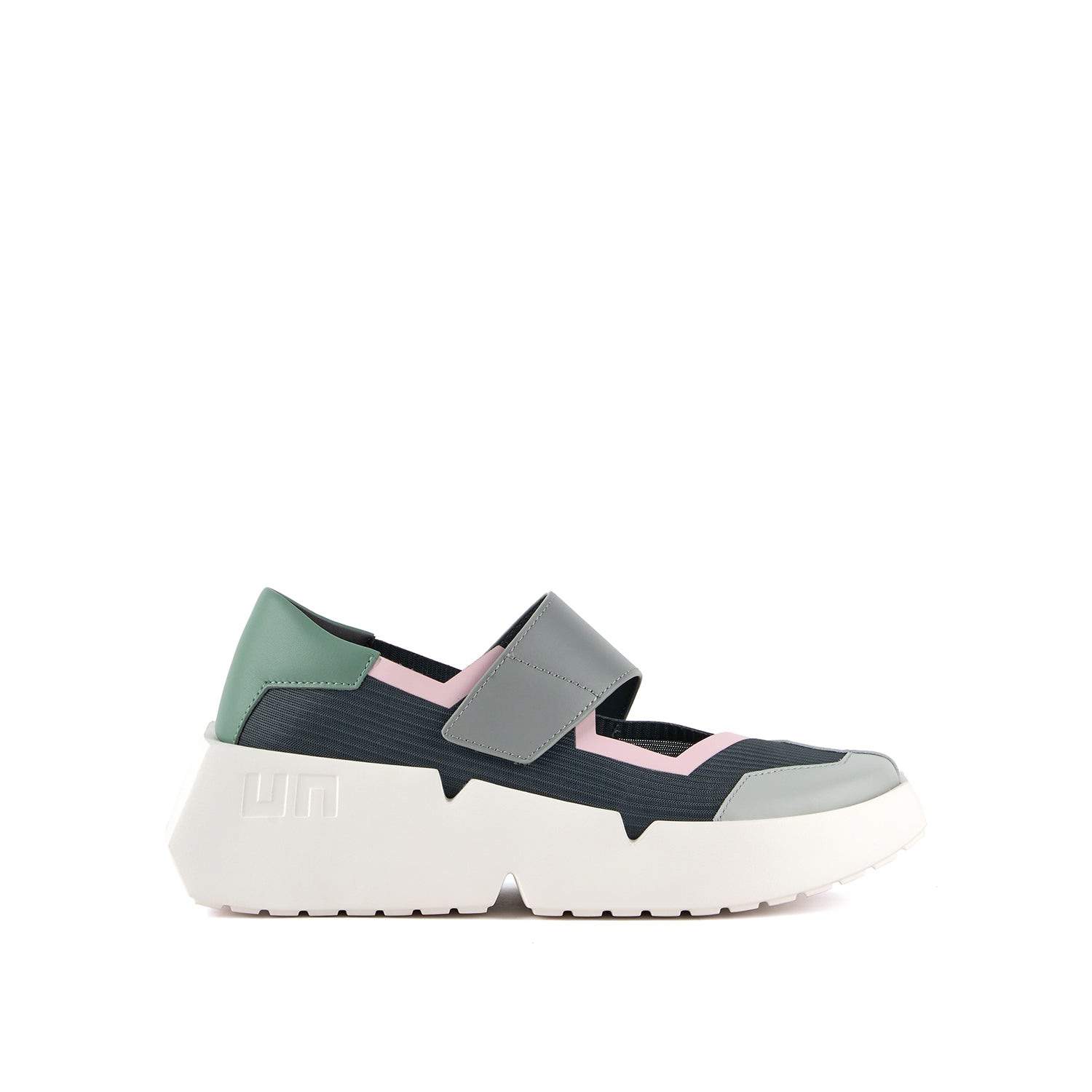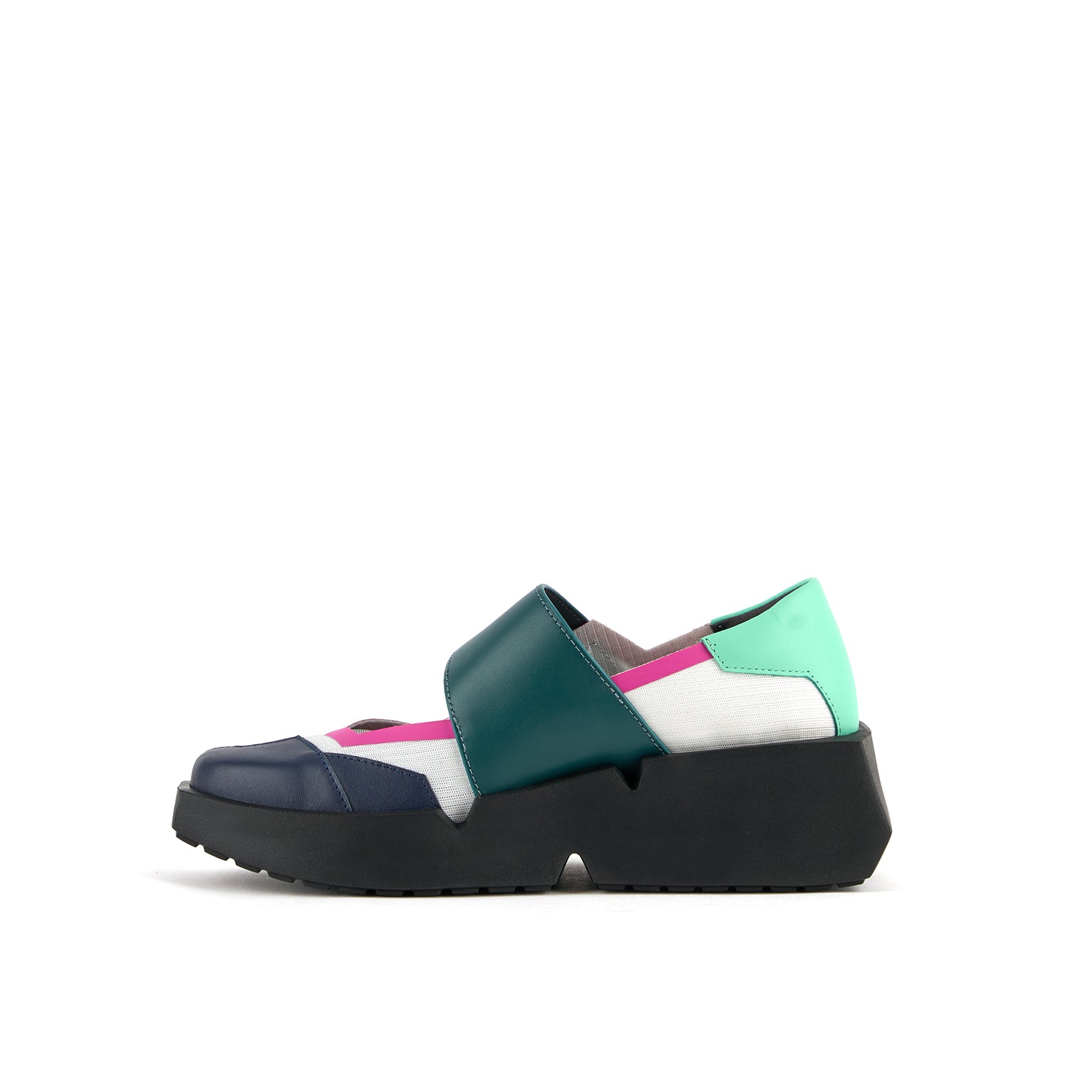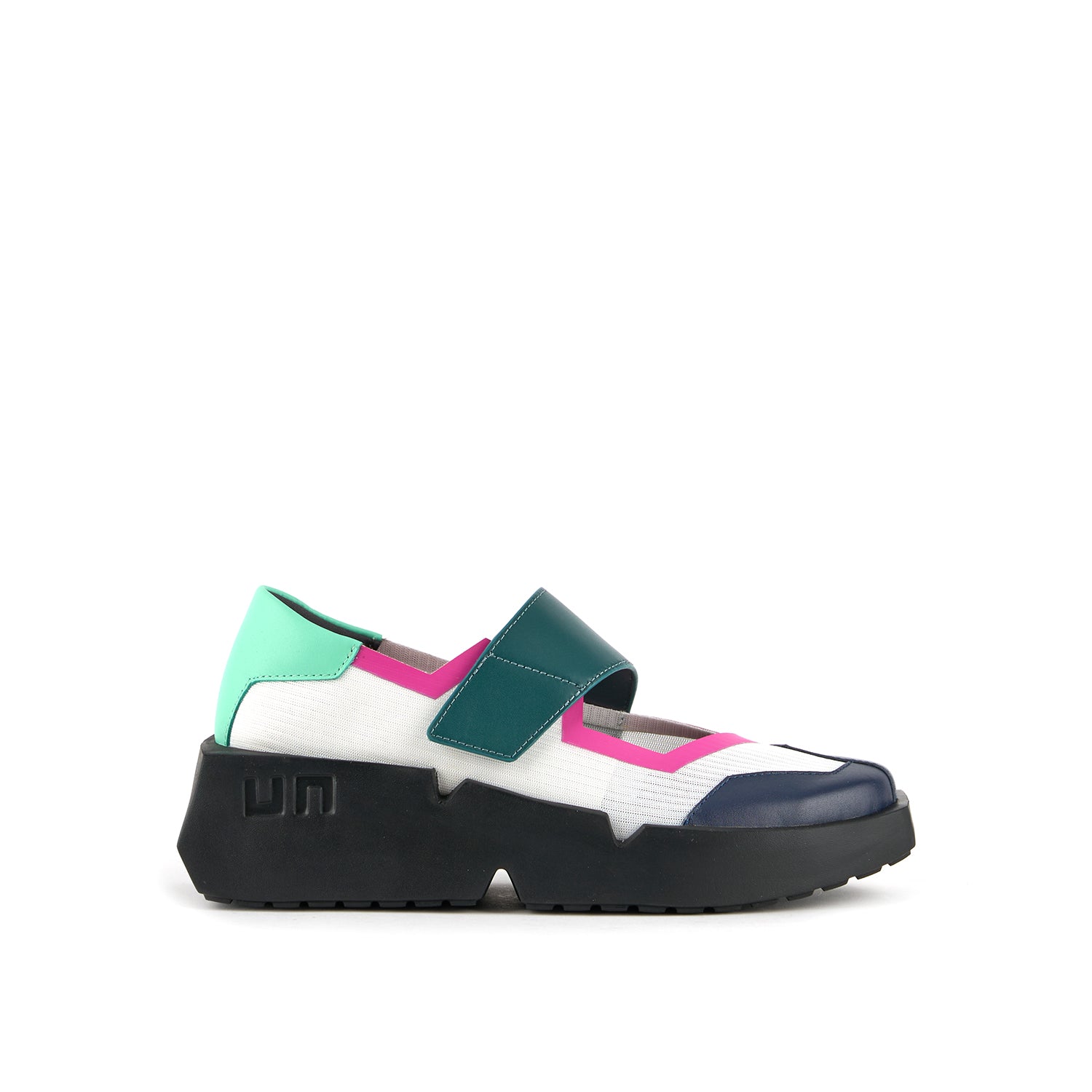 The Mega Robot Jane is a sporty, lightweight Mary Jane that blends technical design with bold, architectural style. Featuring a geometric leather upper, it creates a modern, graphic look with a comfortable, flexible fit. An adjustable hook-and-loop velcro strap secures the foot, while the brutalist, block-shaped EVA rubber outsole—embossed with the iconic United Nude logo—adds statement volume and cushioned support.