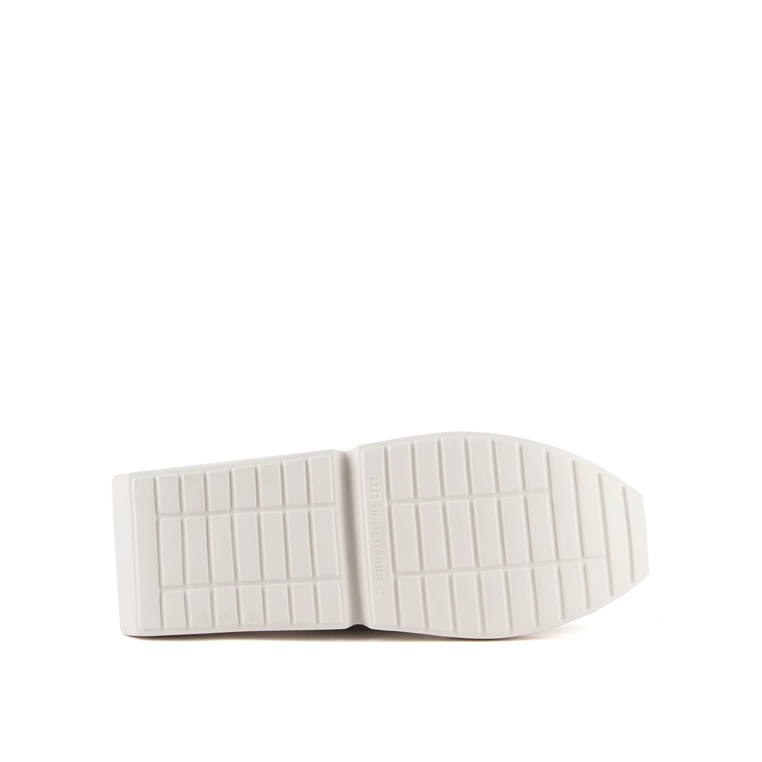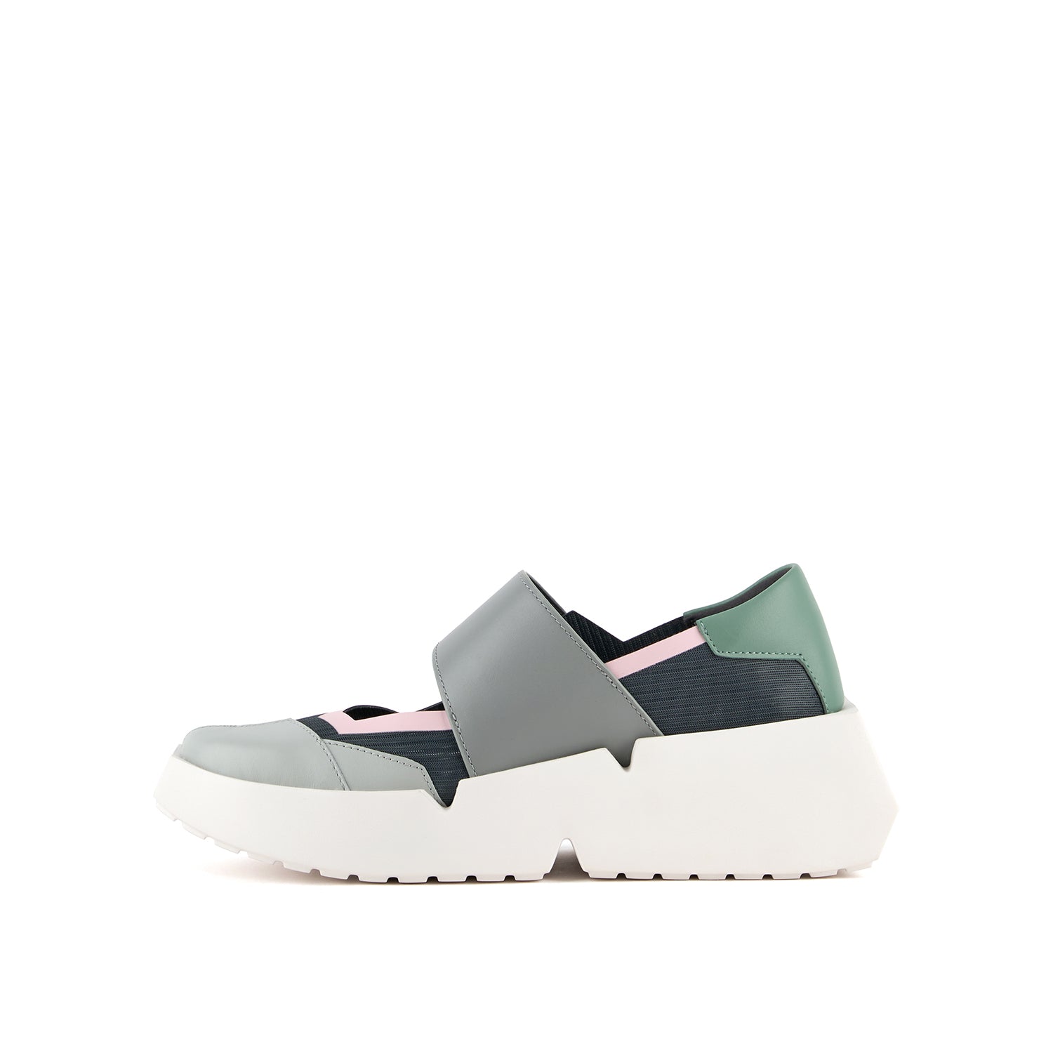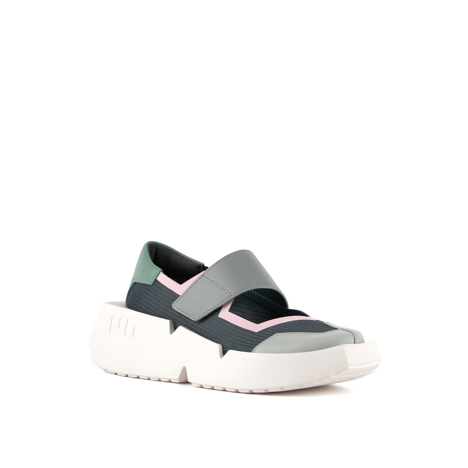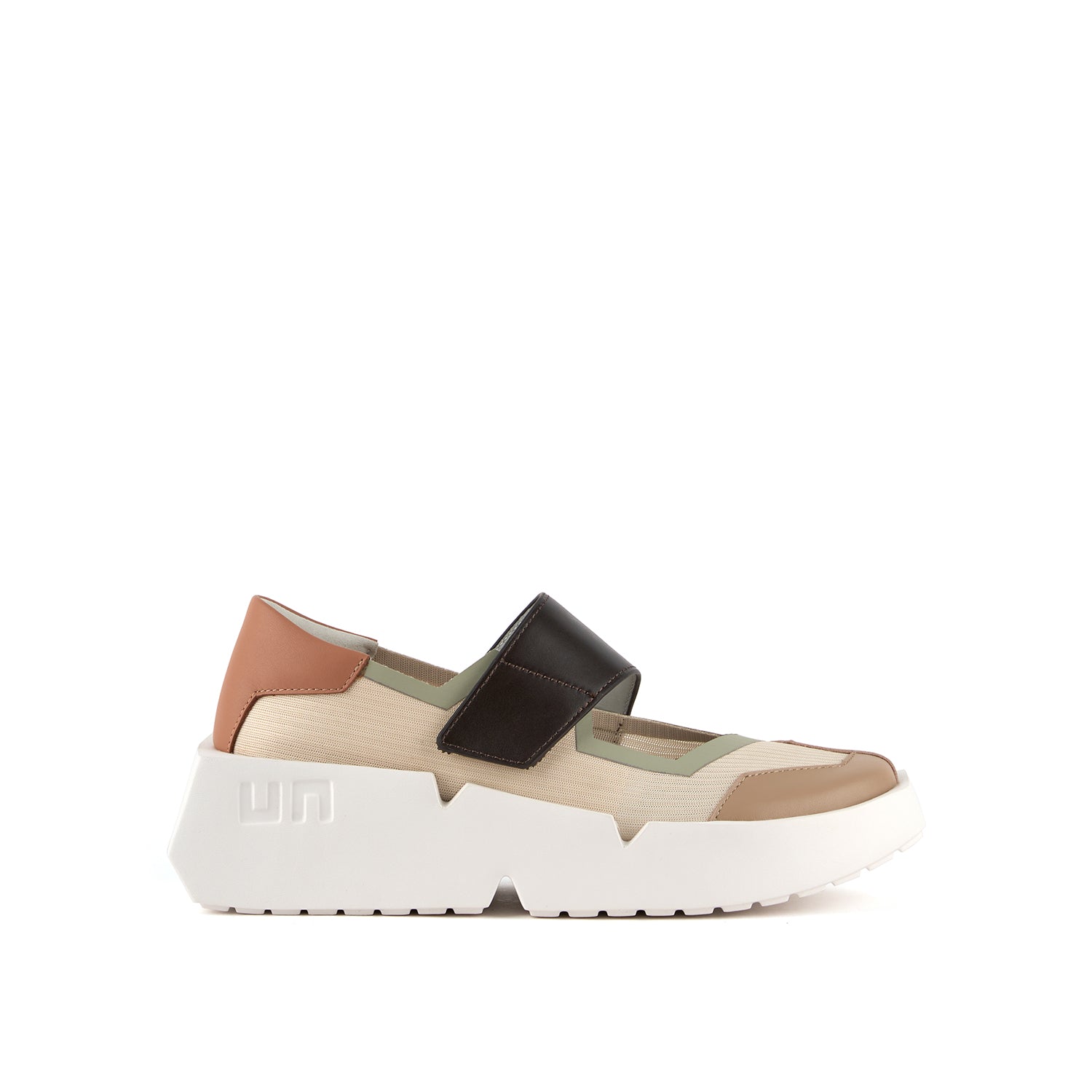 The Mega Robot Jane is a sporty, lightweight Mary Jane that blends technical design with bold, architectural style. Featuring a geometric leather upper, it creates a modern, graphic look with a comfortable, flexible fit. An adjustable hook-and-loop velcro strap secures the foot, while the brutalist, block-shaped EVA rubber outsole—embossed with the iconic United Nude logo—adds statement volume and cushioned support.