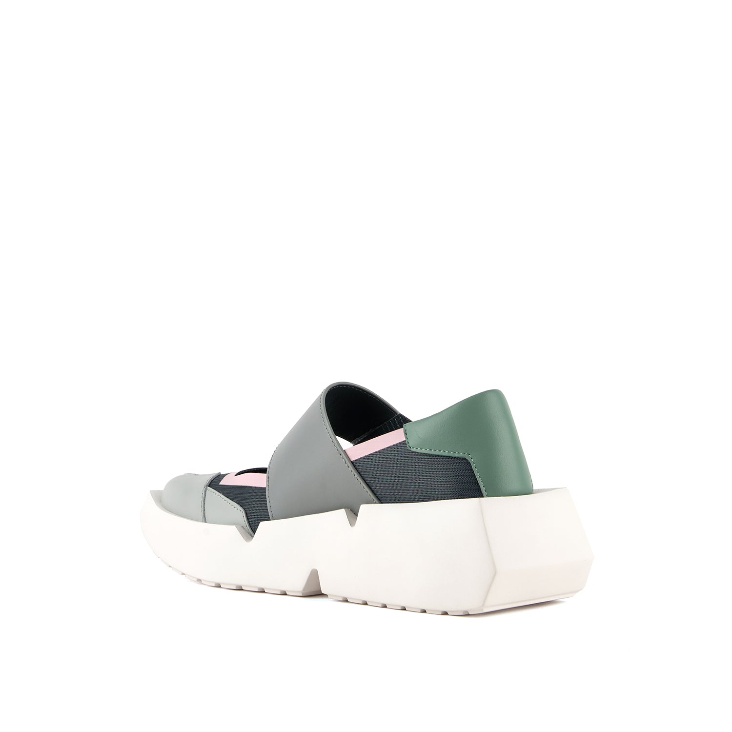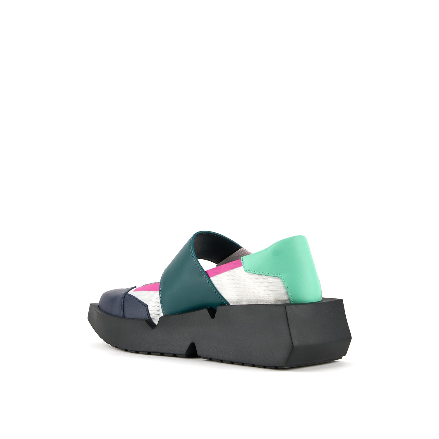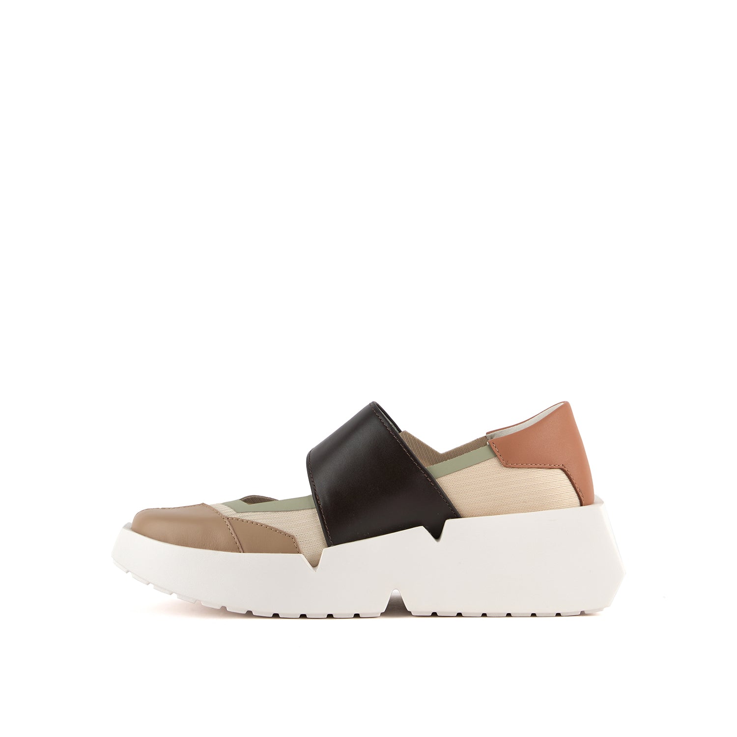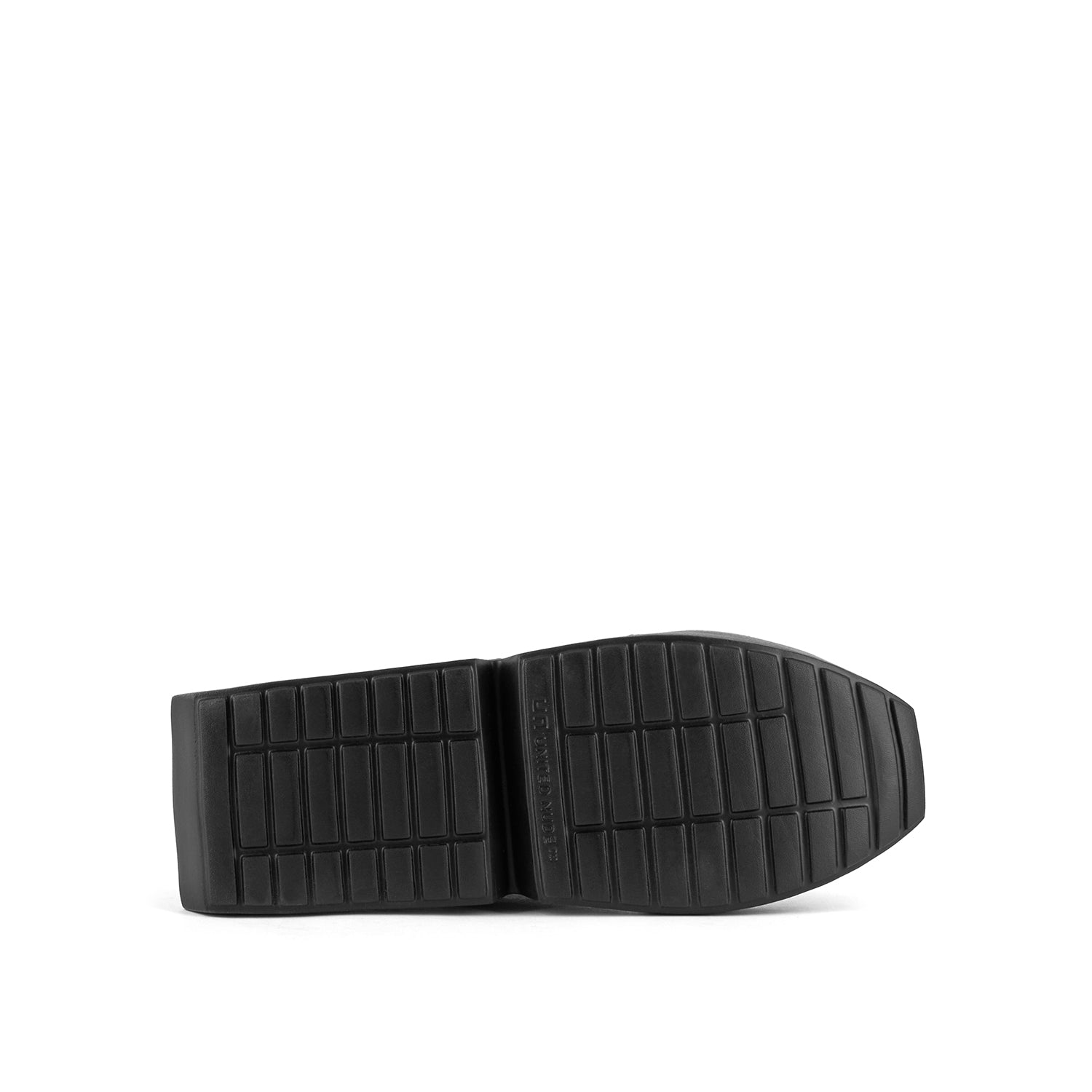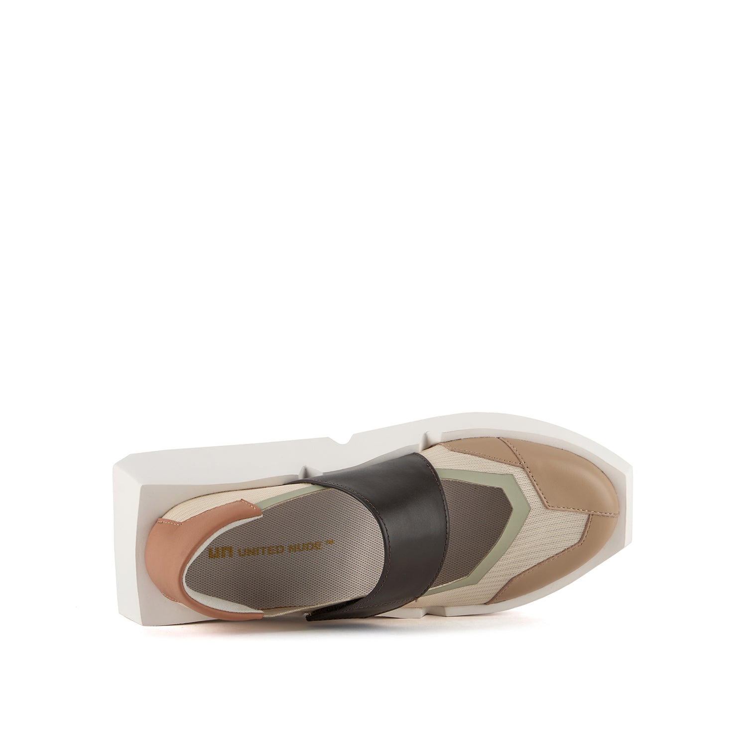 The Mega Robot Jane is a sporty, lightweight Mary Jane that blends technical design with bold, architectural style. Featuring a geometric leather upper, it creates a modern, graphic look with a comfortable, flexible fit. An adjustable hook-and-loop velcro strap secures the foot, while the brutalist, block-shaped EVA rubber outsole—embossed with the iconic United Nude logo—adds statement volume and cushioned support.