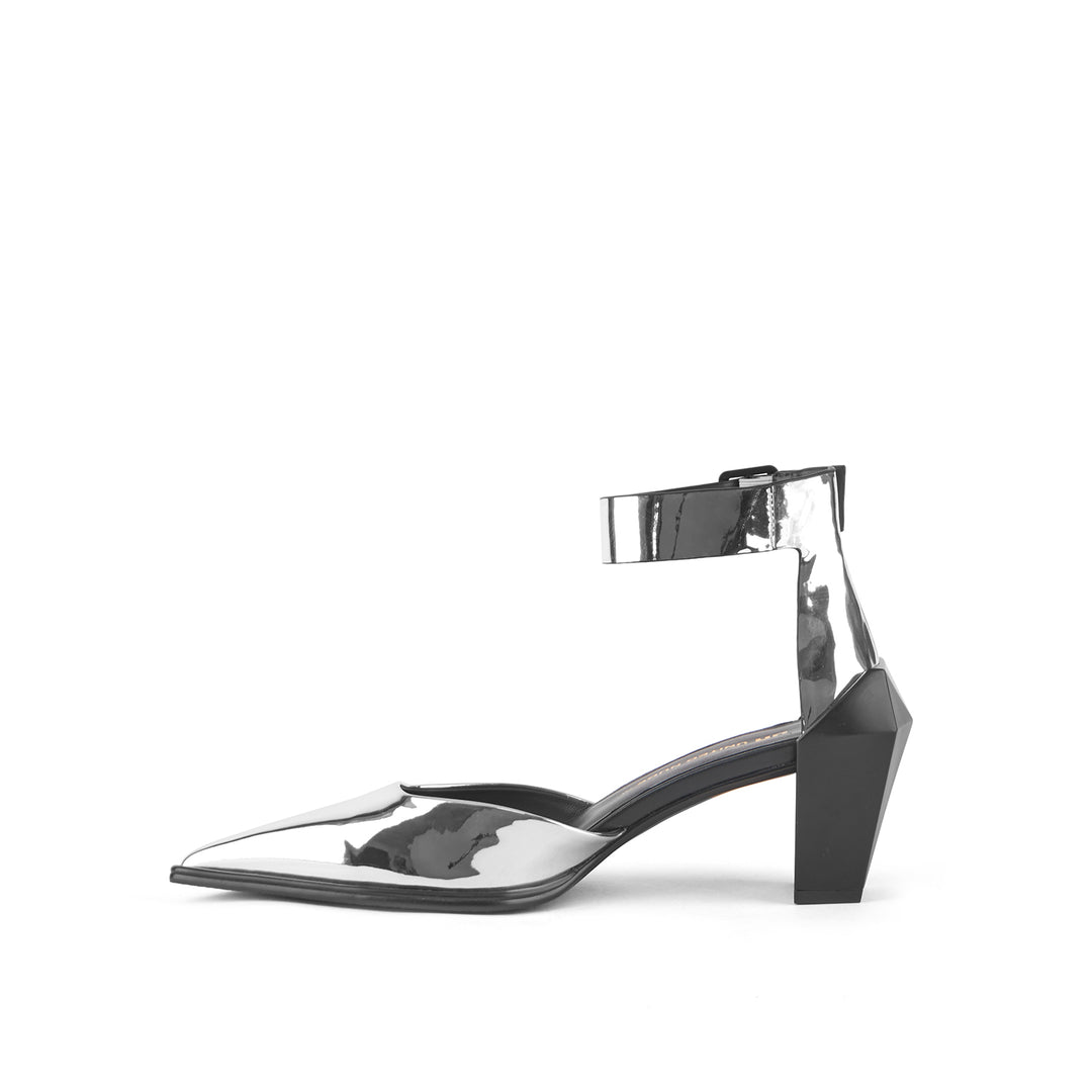 The Gem Dorsey Mid is a mid heel with a sleek Dorsey upper, a dipped topline, and a gem-shaped block heel. It features an ankle strap with a buckle for fastening and a pointed-toe.