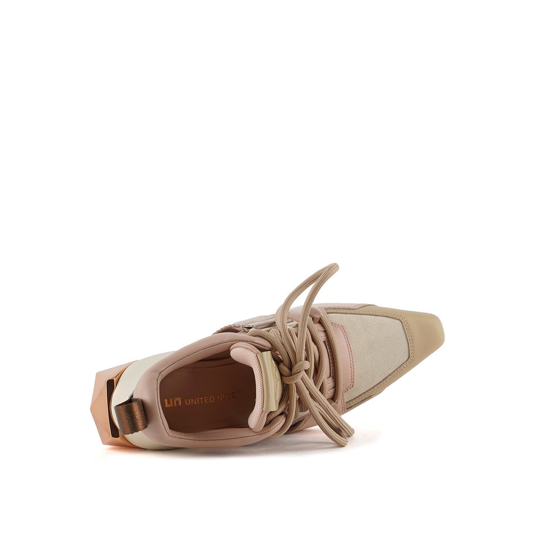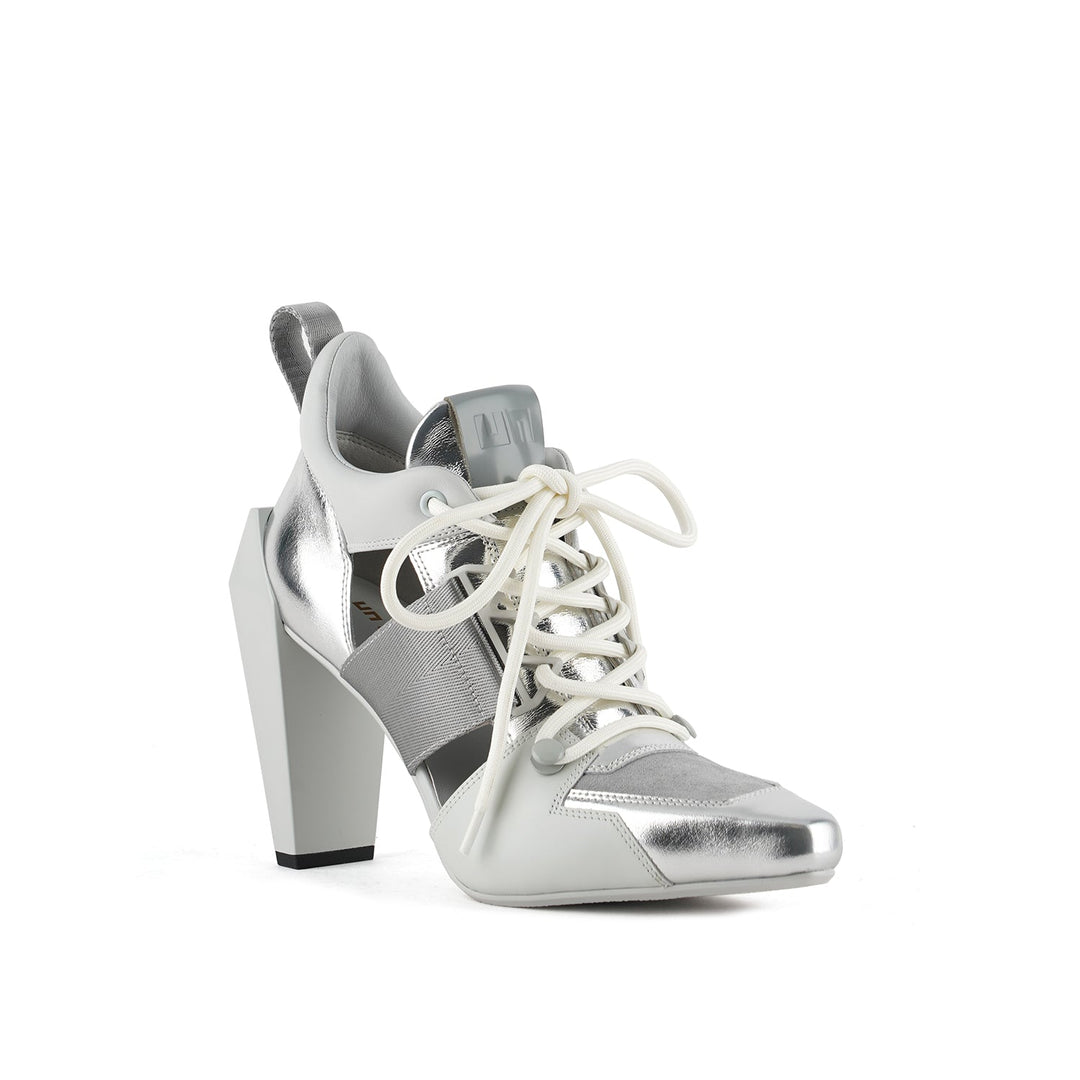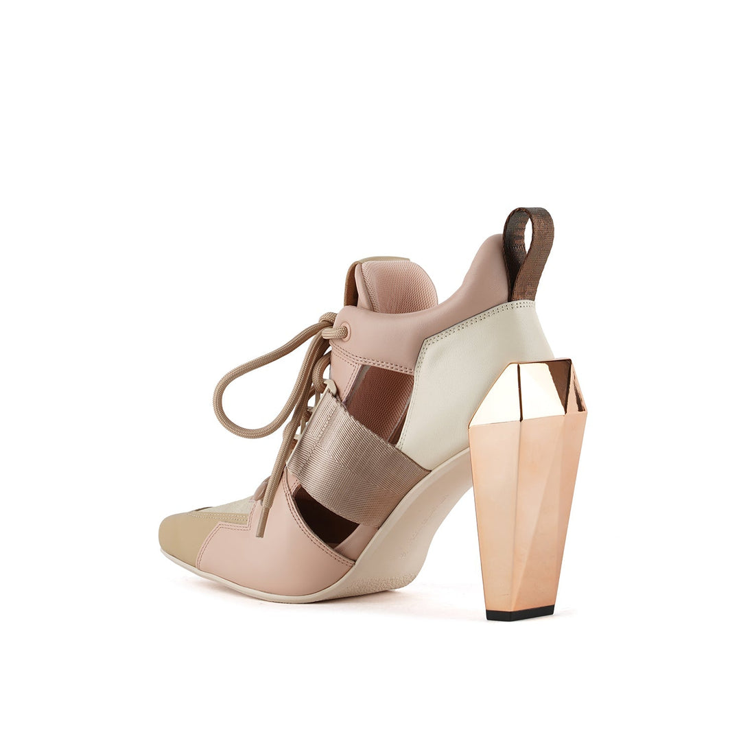 The Gem Sporty Hi is leather lace-up high heel sneaker featuring a sporty upper with cut-outs, a pointed toe, and a geometric gem-shaped block heel.