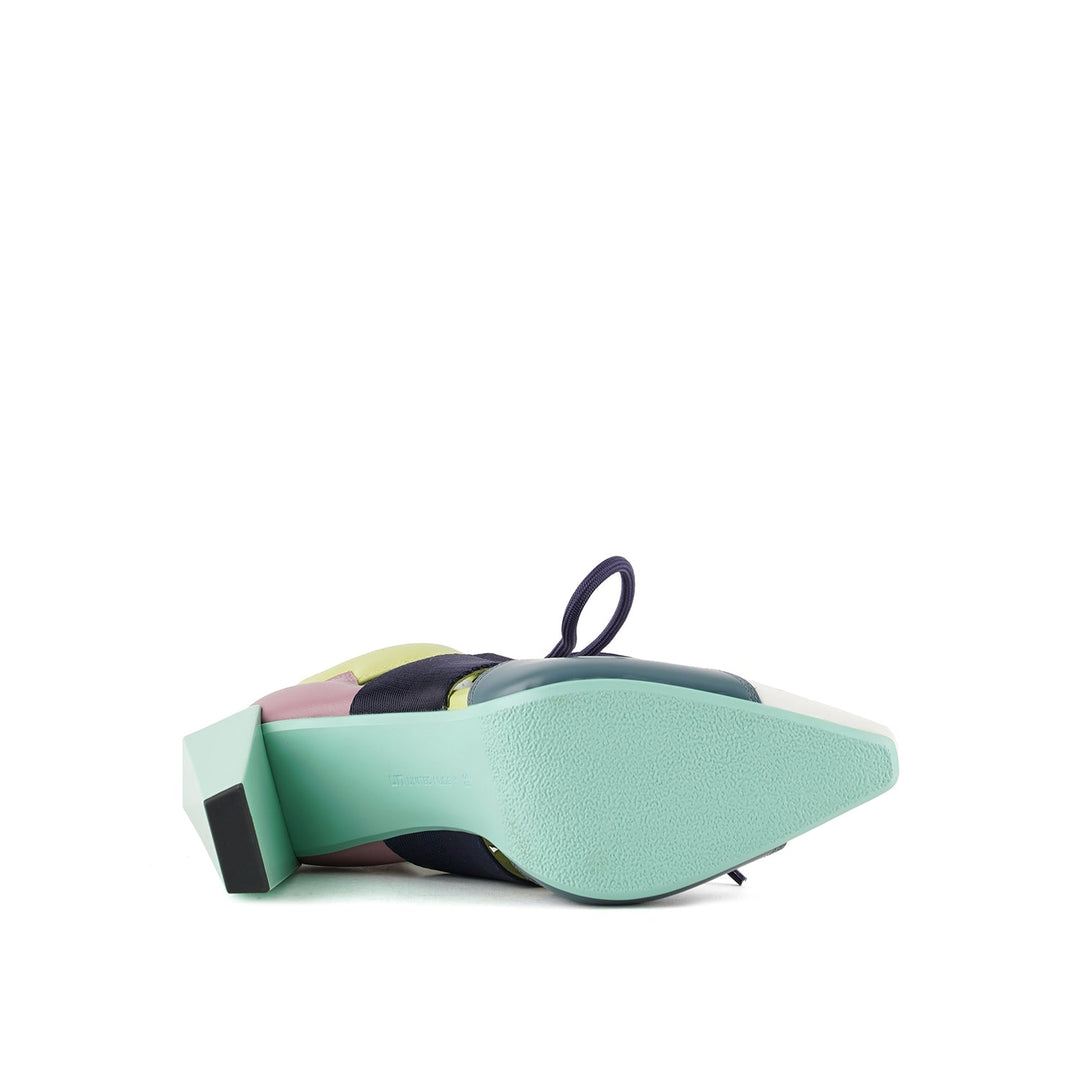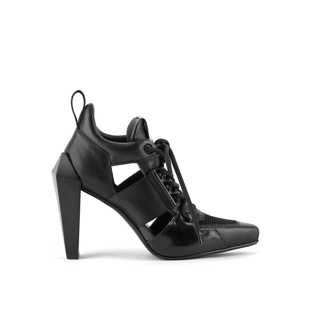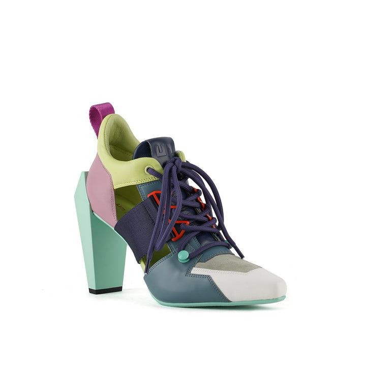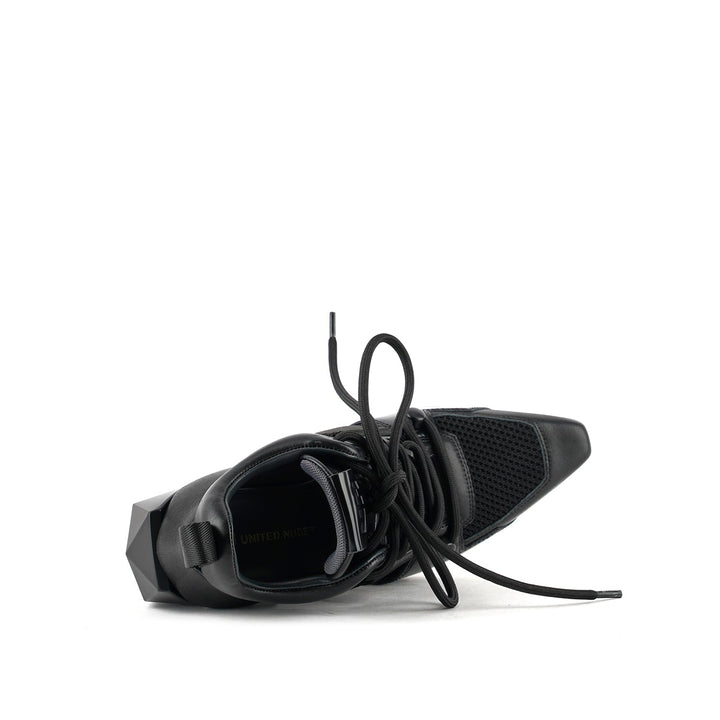 The Gem Sporty Hi is leather lace-up high heel sneaker featuring a sporty upper with cut-outs, a pointed toe, and a geometric gem-shaped block heel.