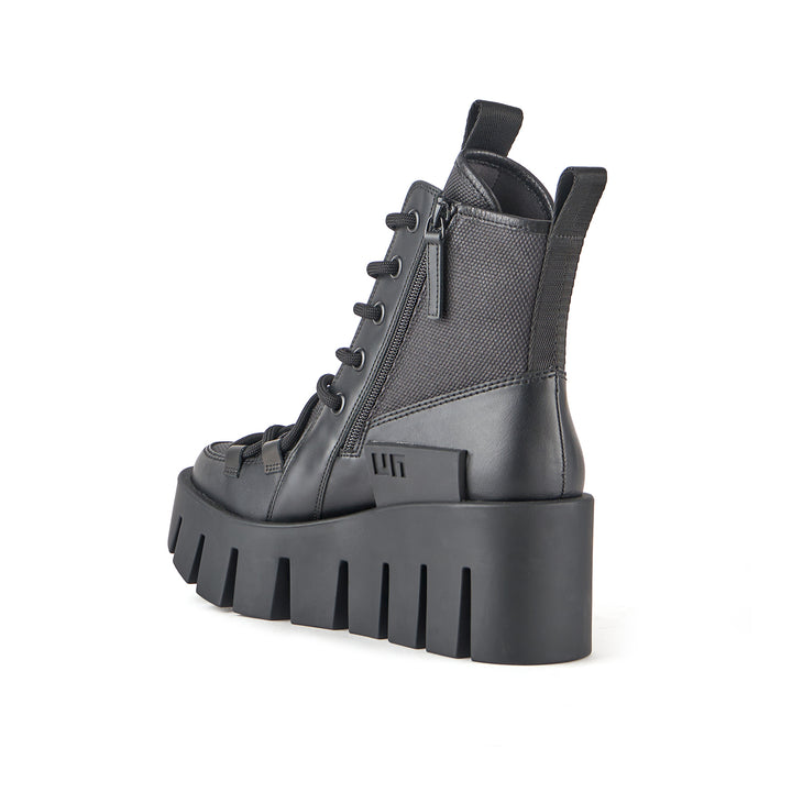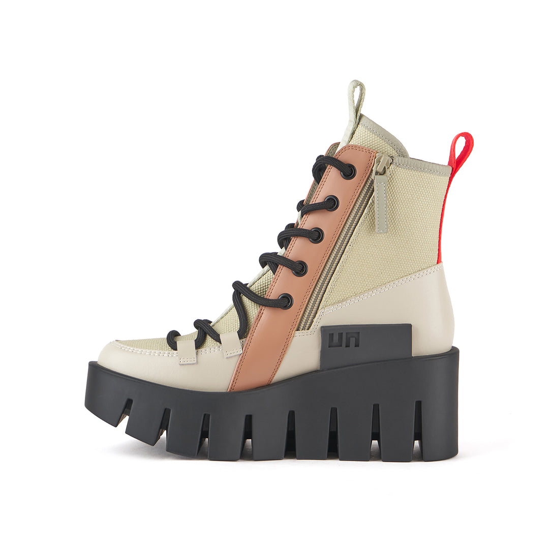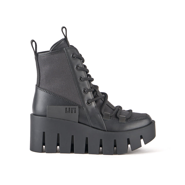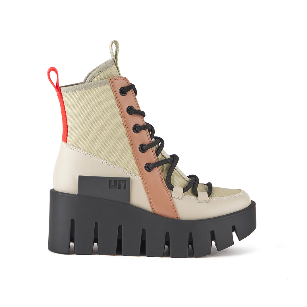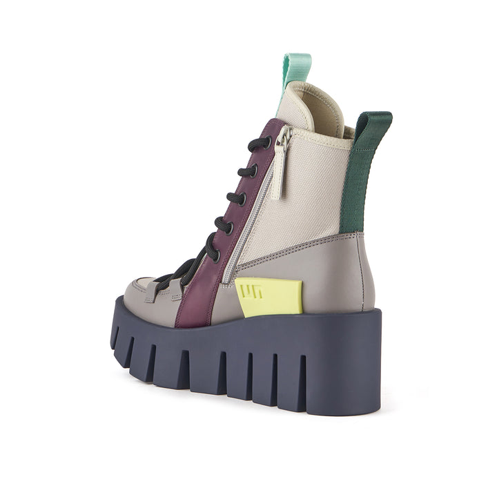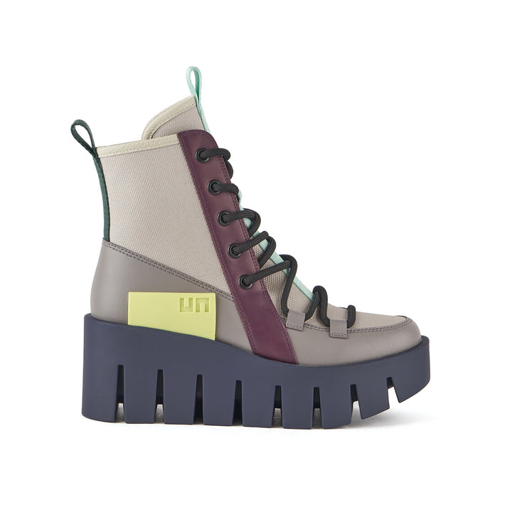The Grip Explorer is a waxed canvas lace-up bootie with a platform lift, nylon straps, a statement logo block, and a defining lug sole.