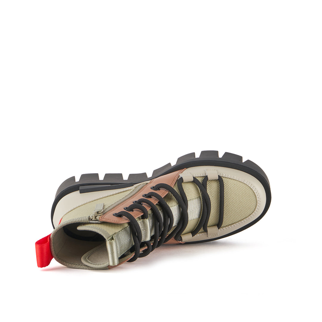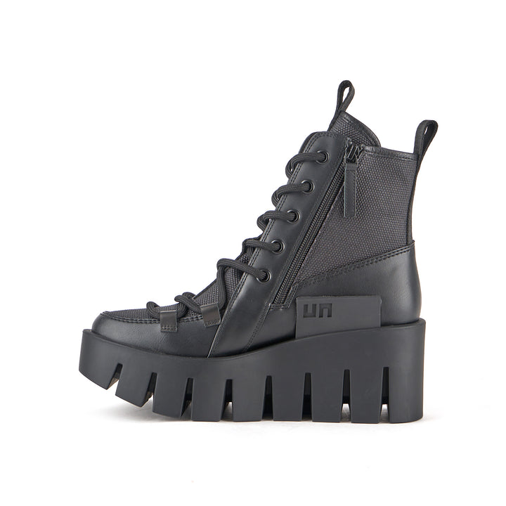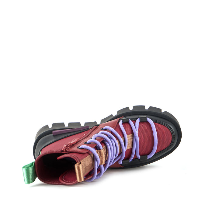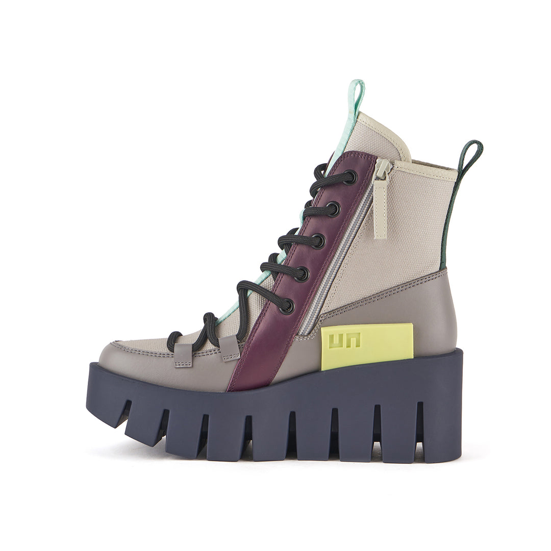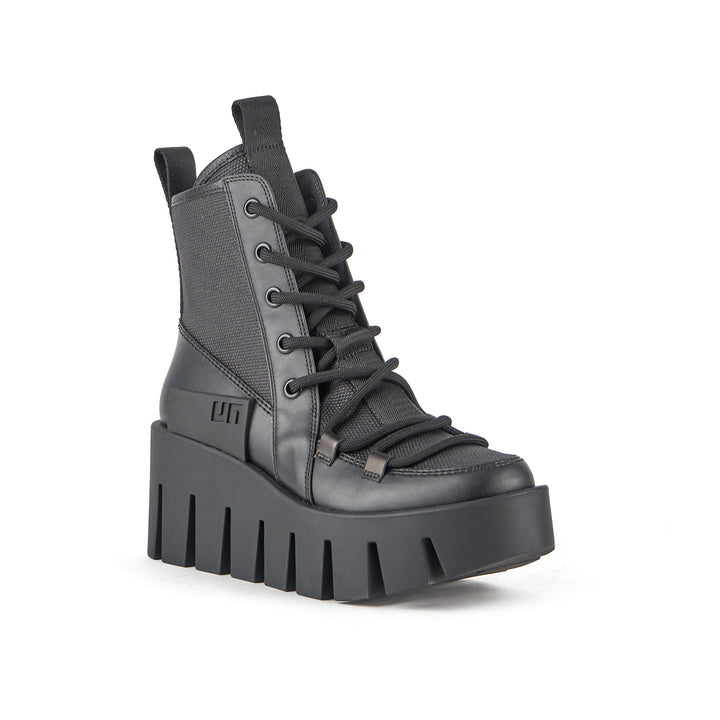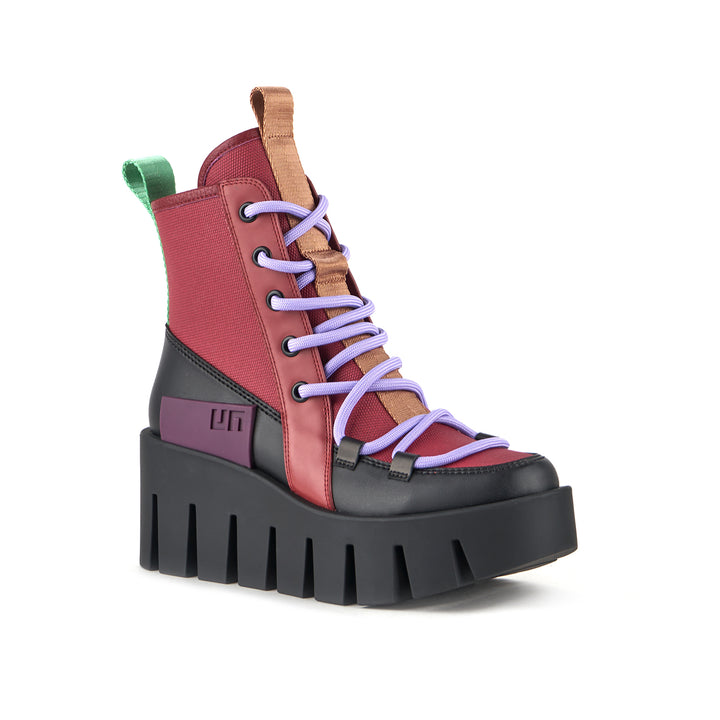 The Grip Explorer is a waxed canvas lace-up bootie with a platform lift, nylon straps, a statement logo block, and a defining lug sole.