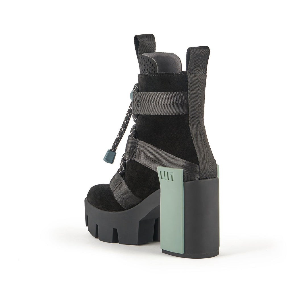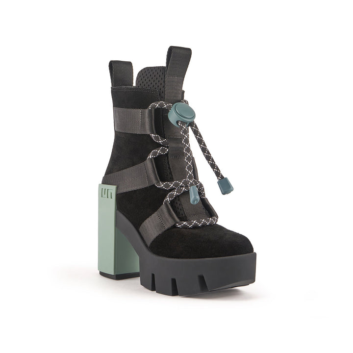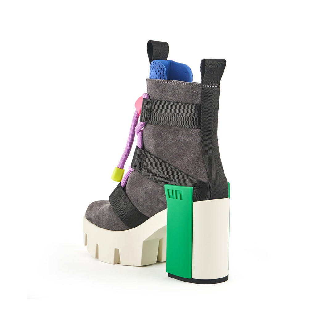 The Grip Nomad II is a split suede and neoprene lace-up bootie with a platform lift, nylon straps, a statement logo block, and a defining lug sole. It features a puffy mesh tongue and oversized technical trims.