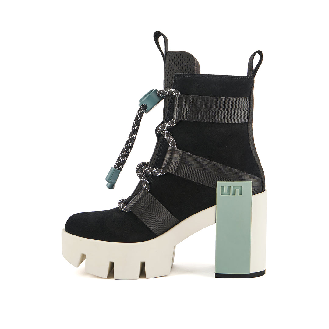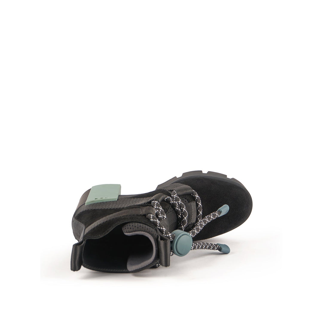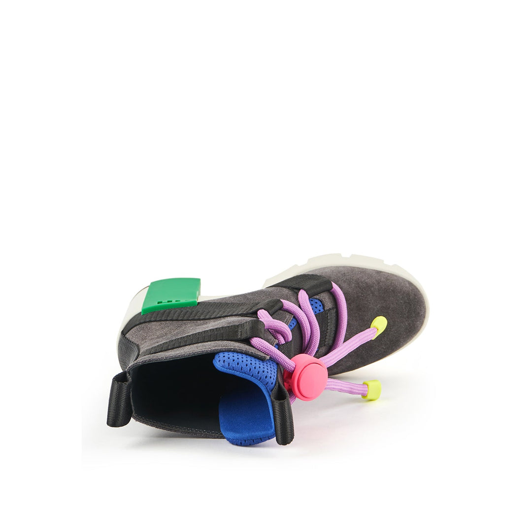 The Grip Nomad II is a split suede and neoprene lace-up bootie with a platform lift, nylon straps, a statement logo block, and a defining lug sole. It features a puffy mesh tongue and oversized technical trims.