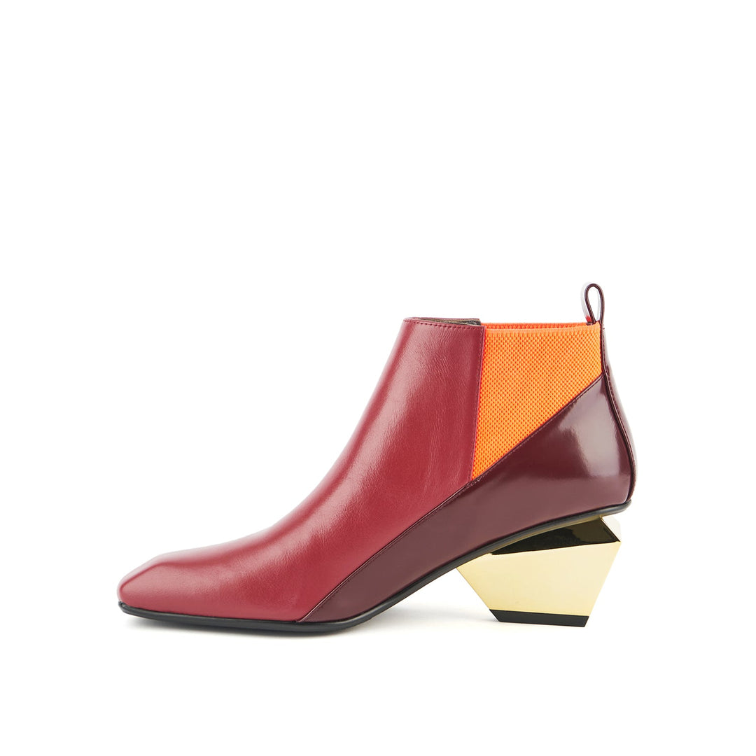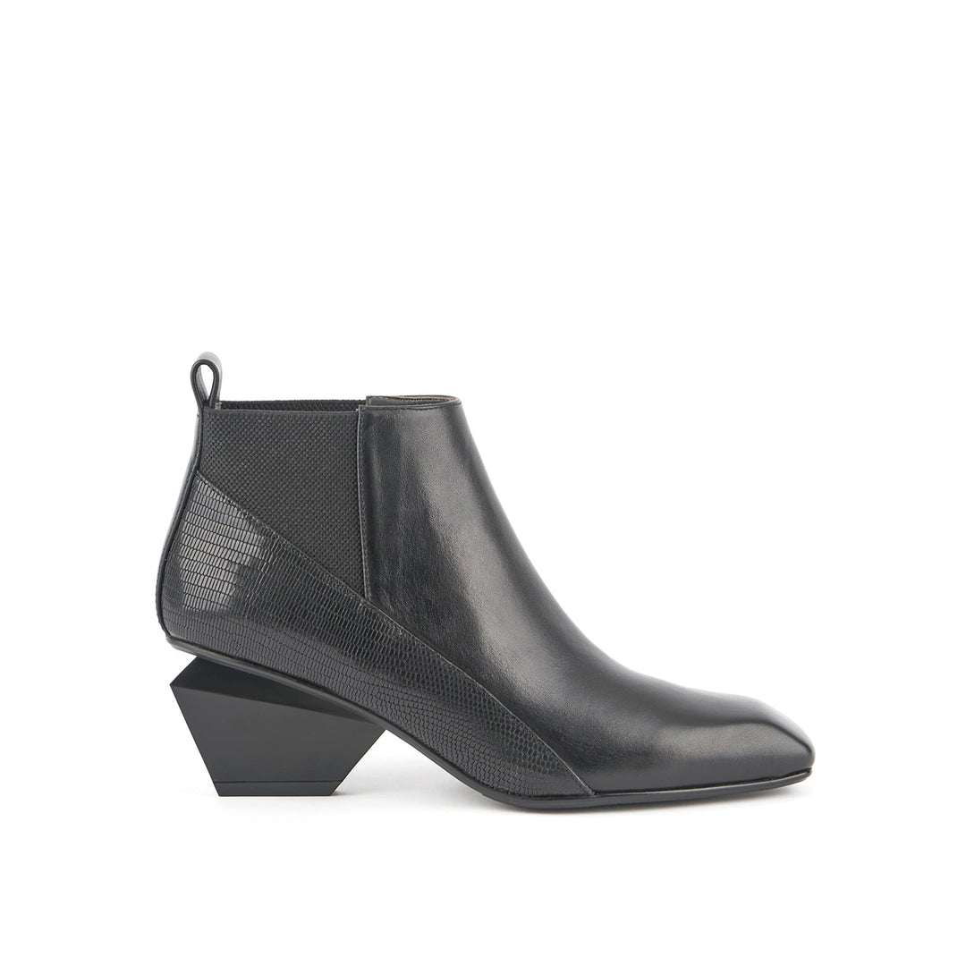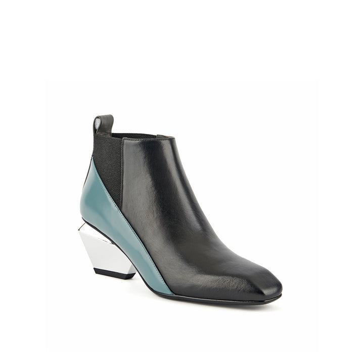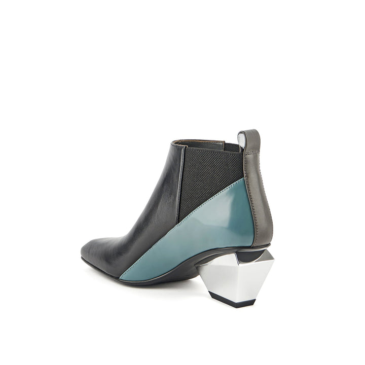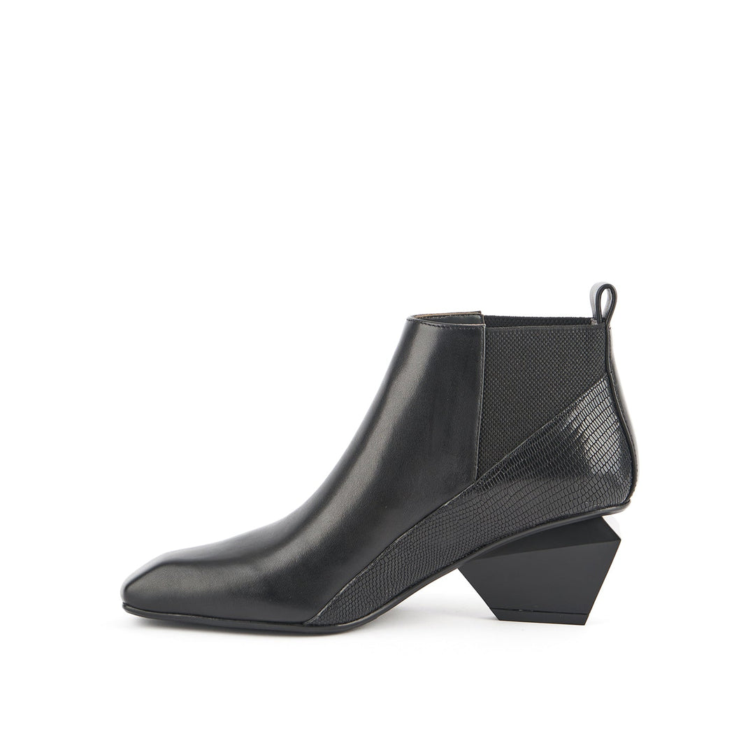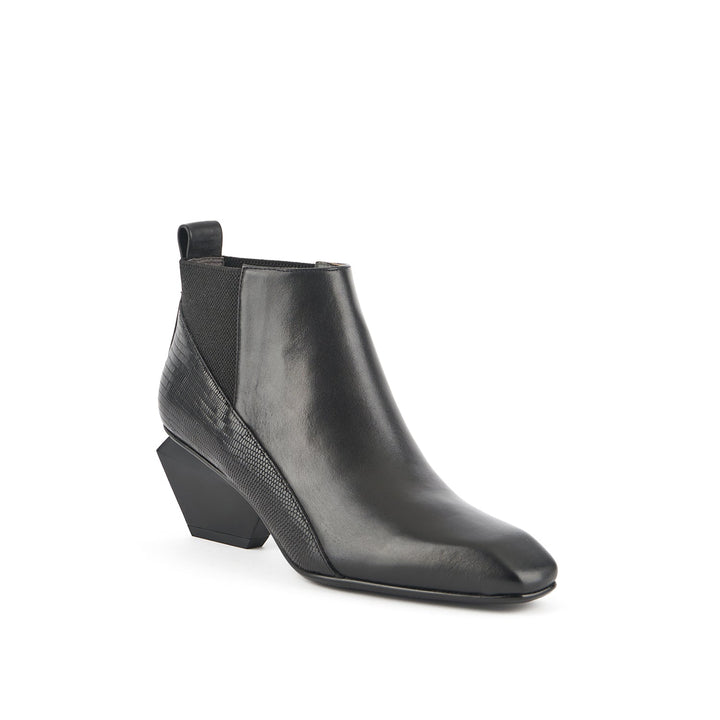 The Jacky X is a slip-on leather bootie featuring an angular toe, sharp diagonal lines and and a geometric statement heel.