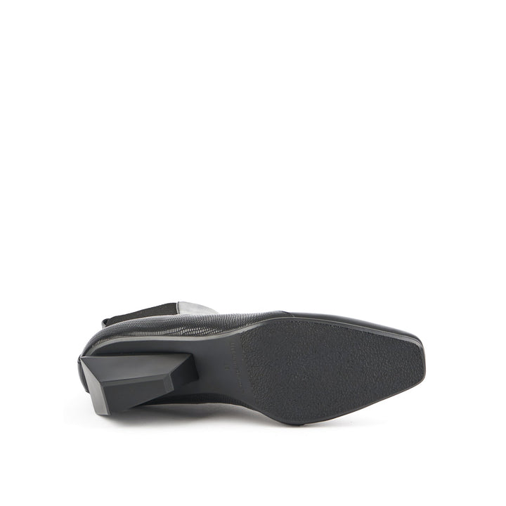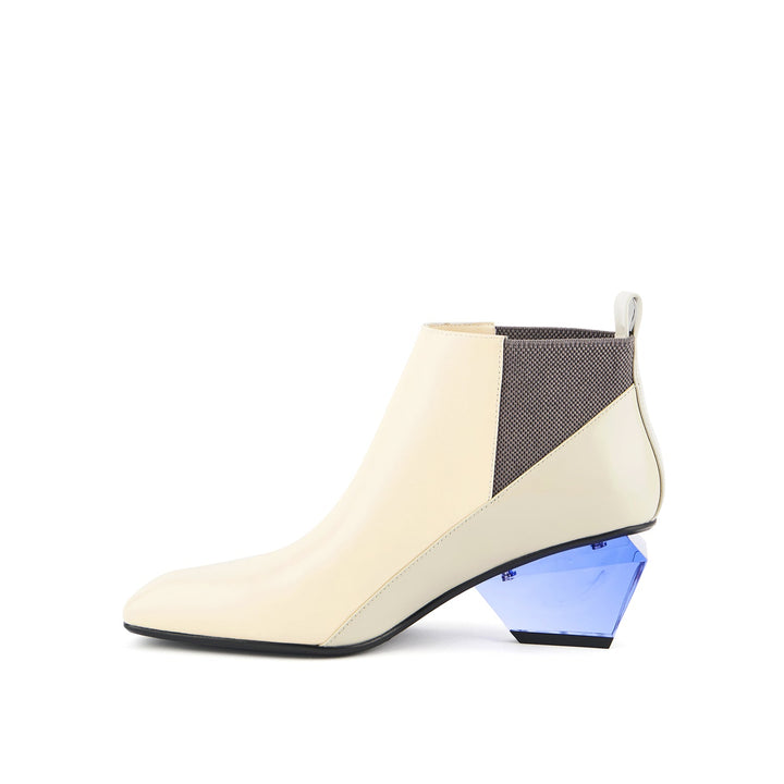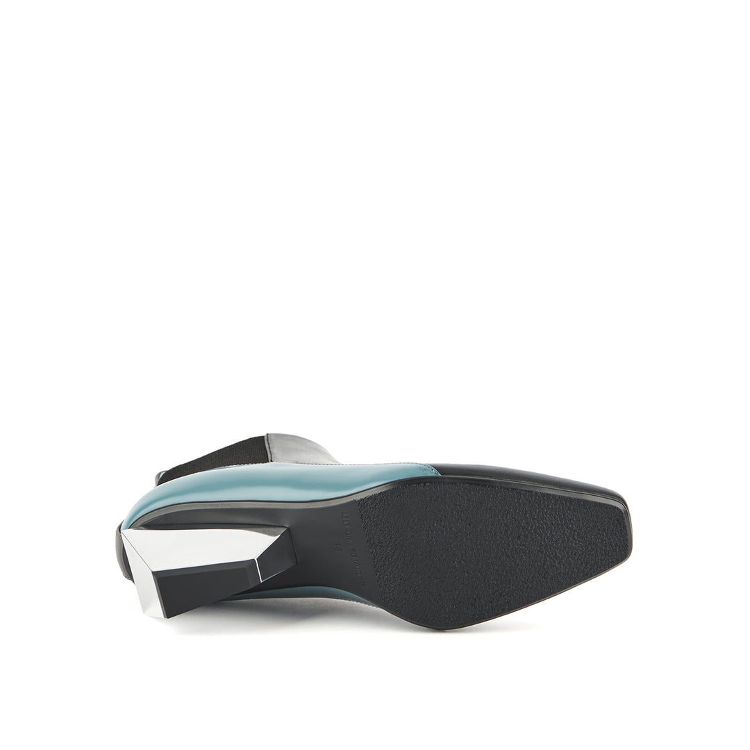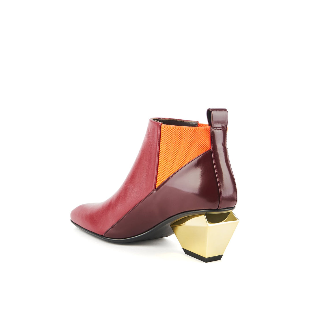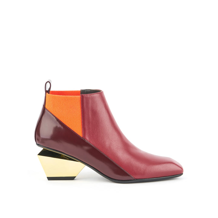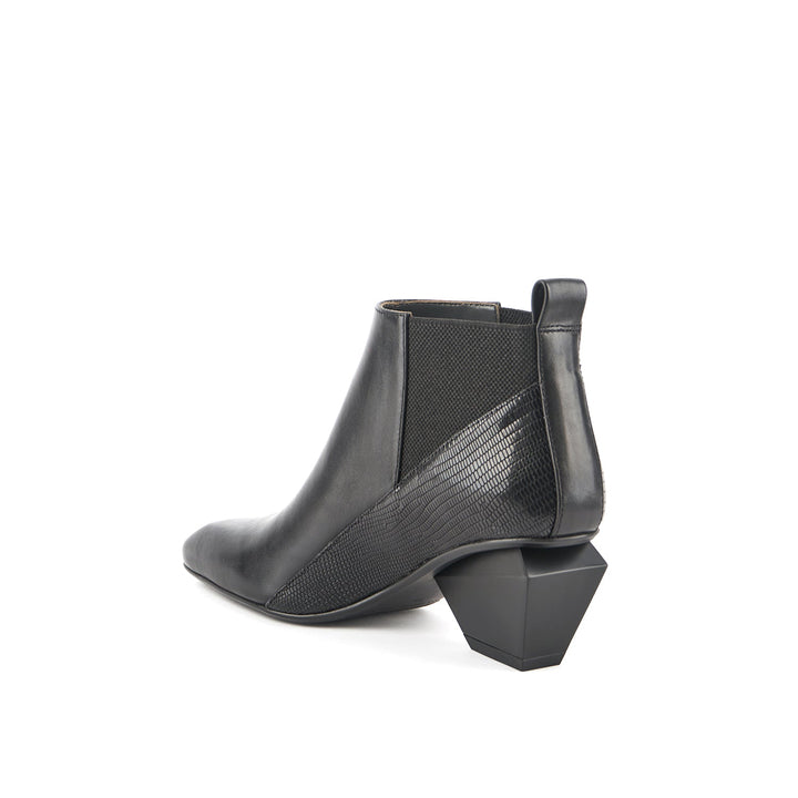 The Jacky X is a slip-on leather bootie featuring an angular toe, sharp diagonal lines and and a geometric statement heel.