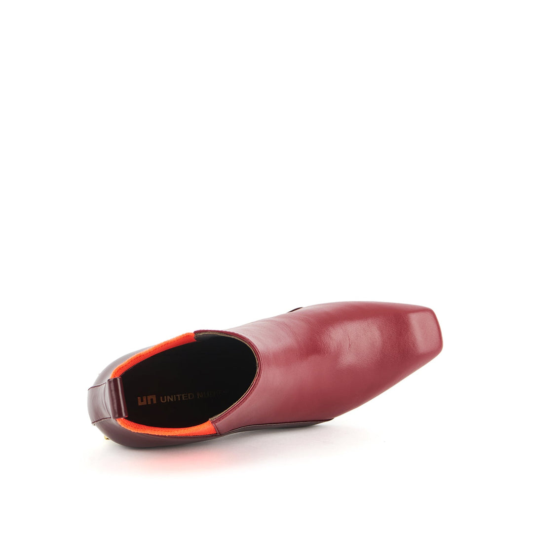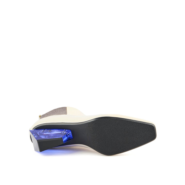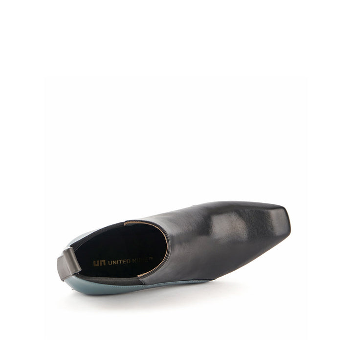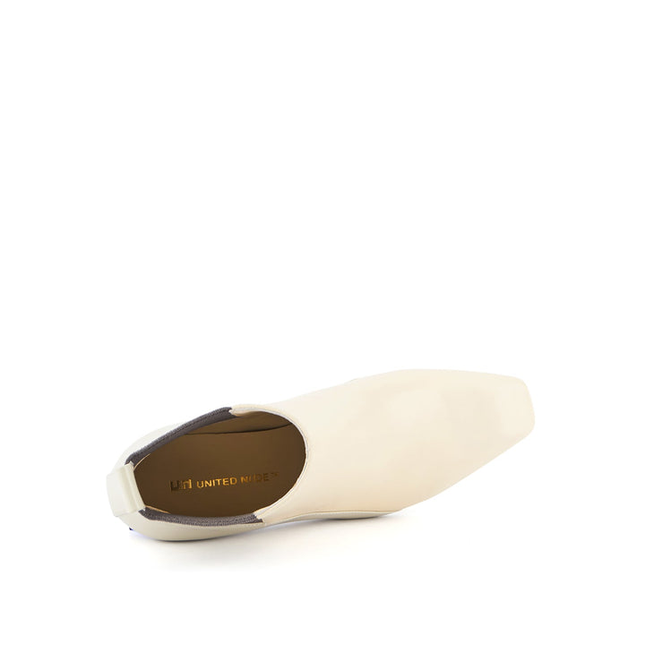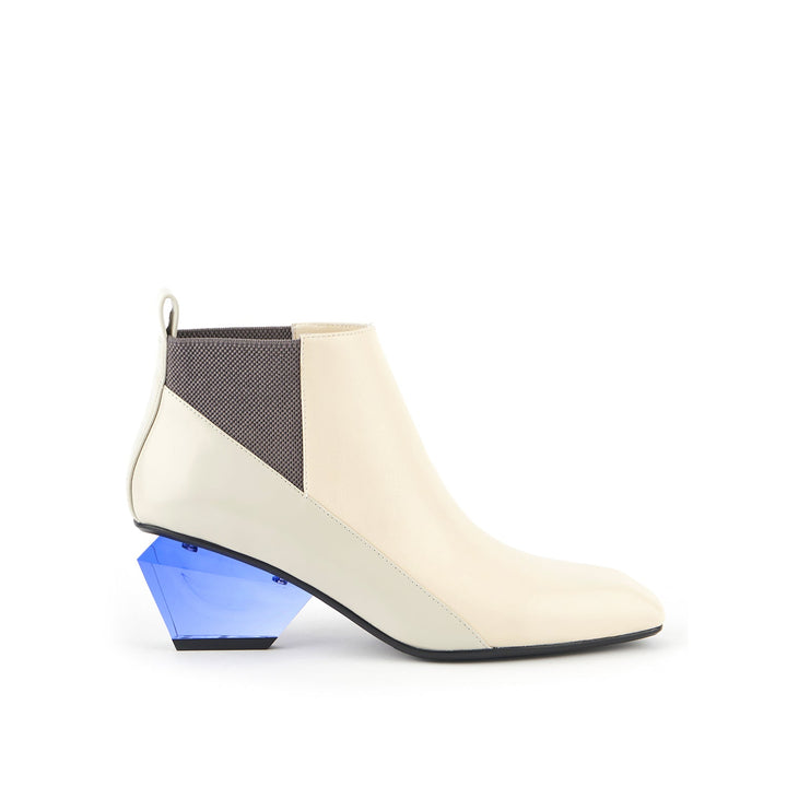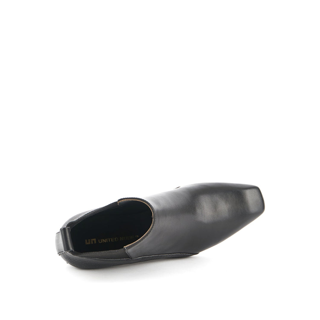 The Jacky X is a slip-on leather bootie featuring an angular toe, sharp diagonal lines and and a geometric statement heel.