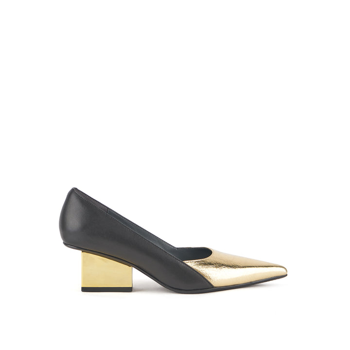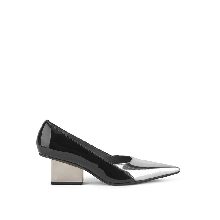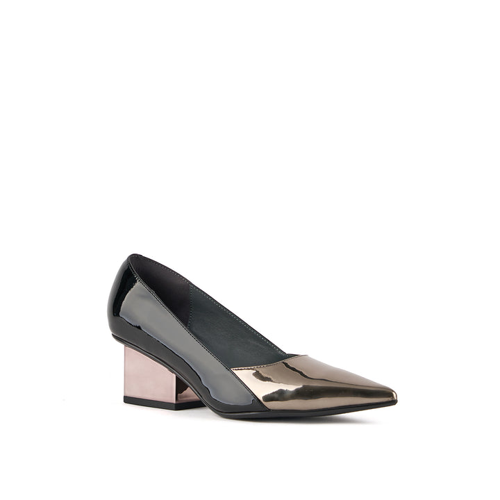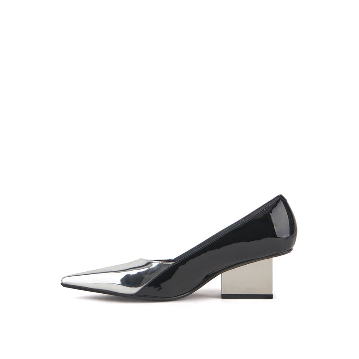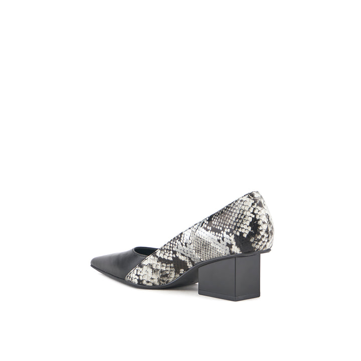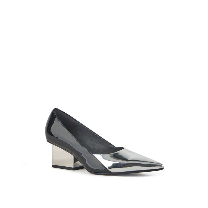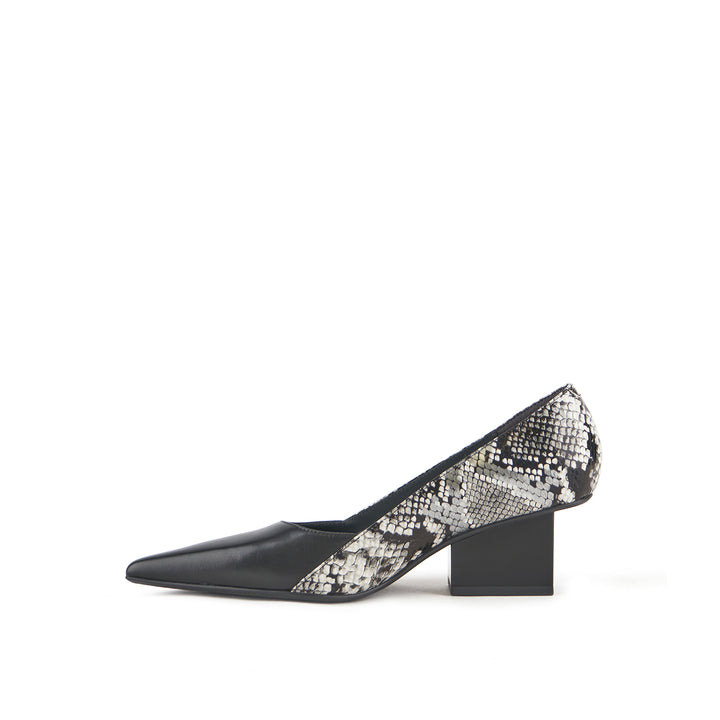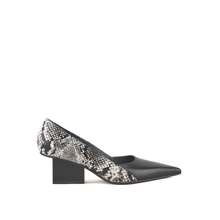 The Raila Pump is a slip-on mid heel with an elongated pointed-toe and a geometric block heel.