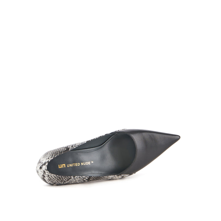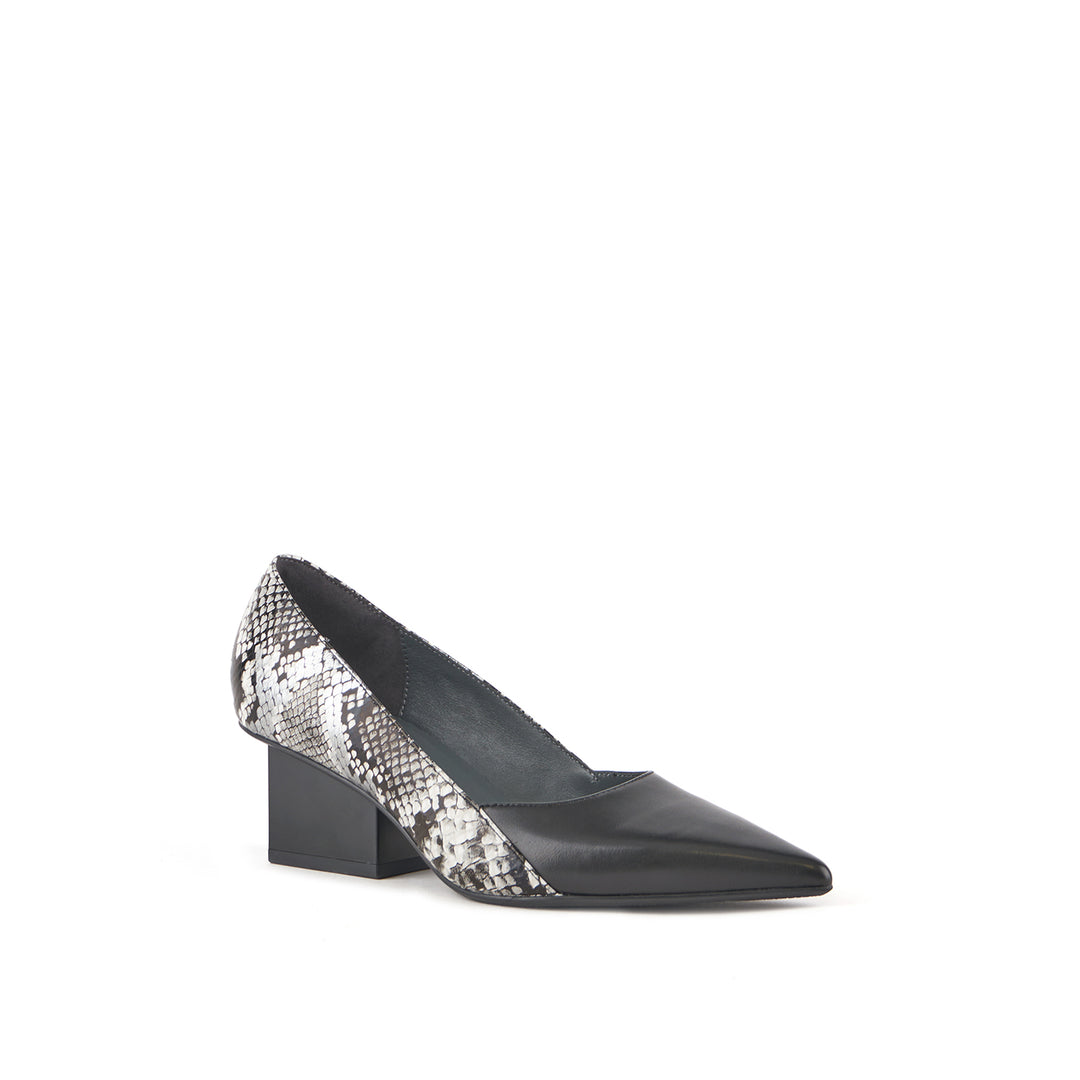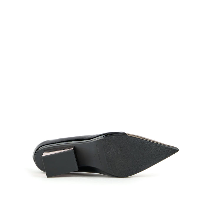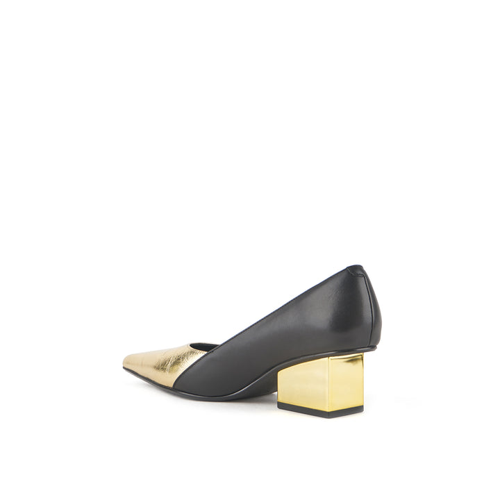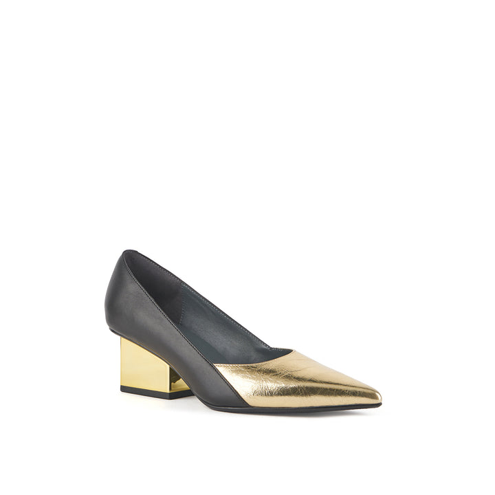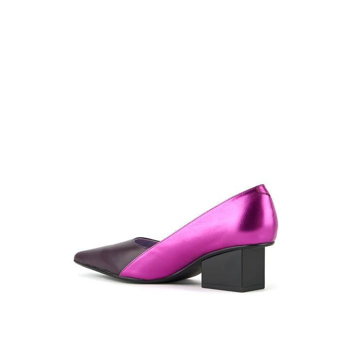 The Raila Pump is a slip-on mid heel with an elongated pointed-toe and a geometric block heel.