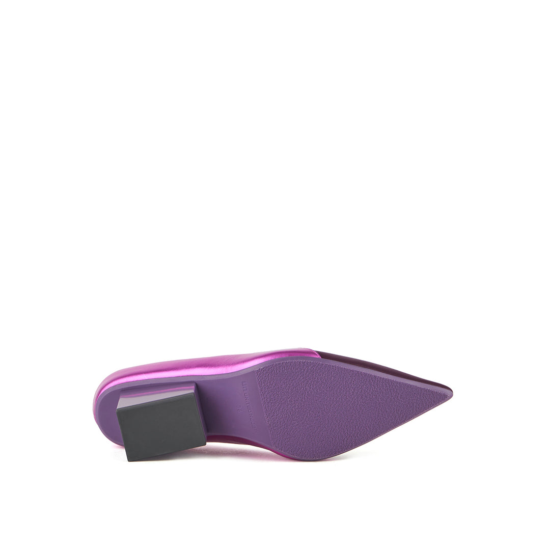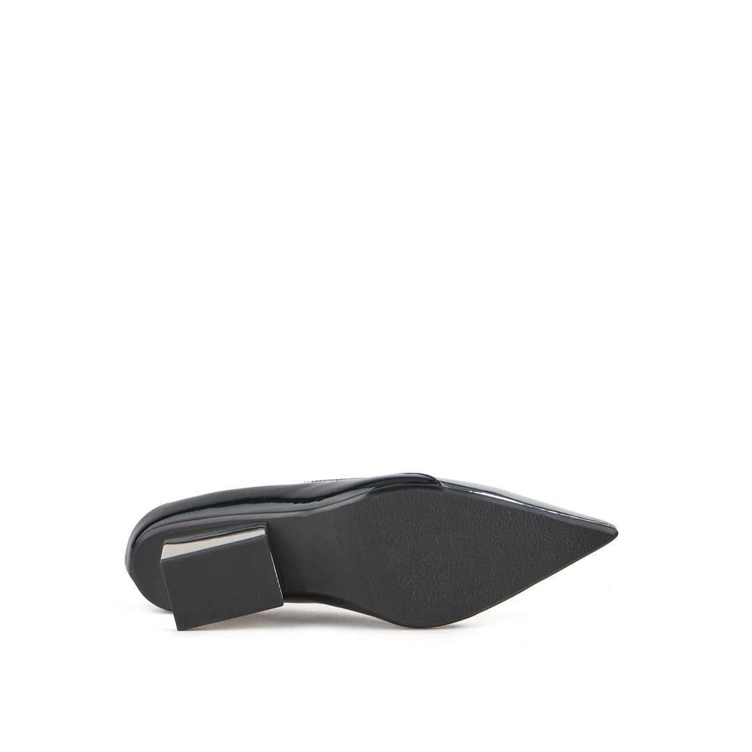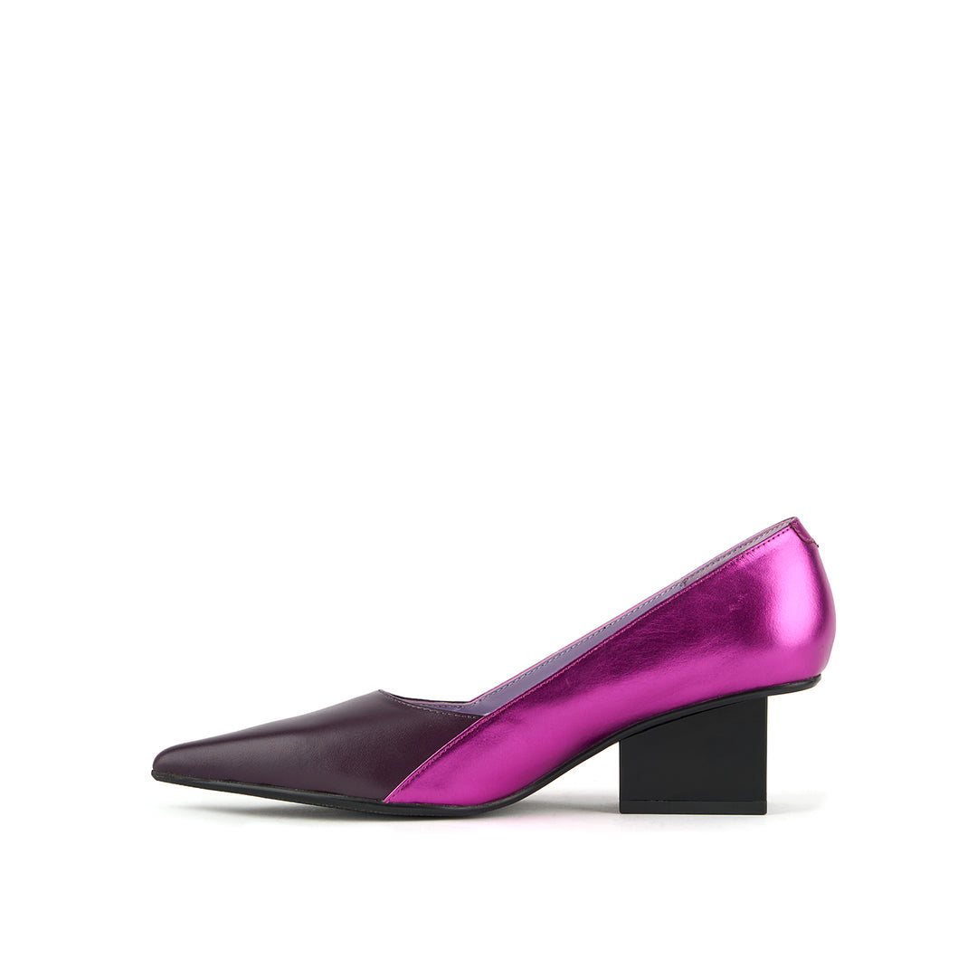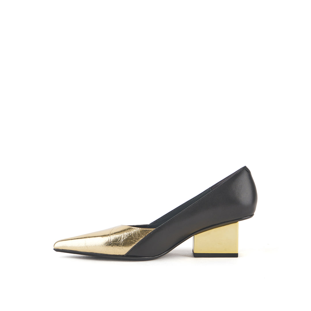 The Raila Pump is a slip-on mid heel with an elongated pointed-toe and a geometric block heel.
