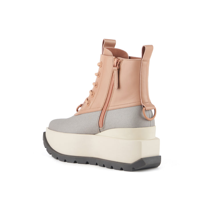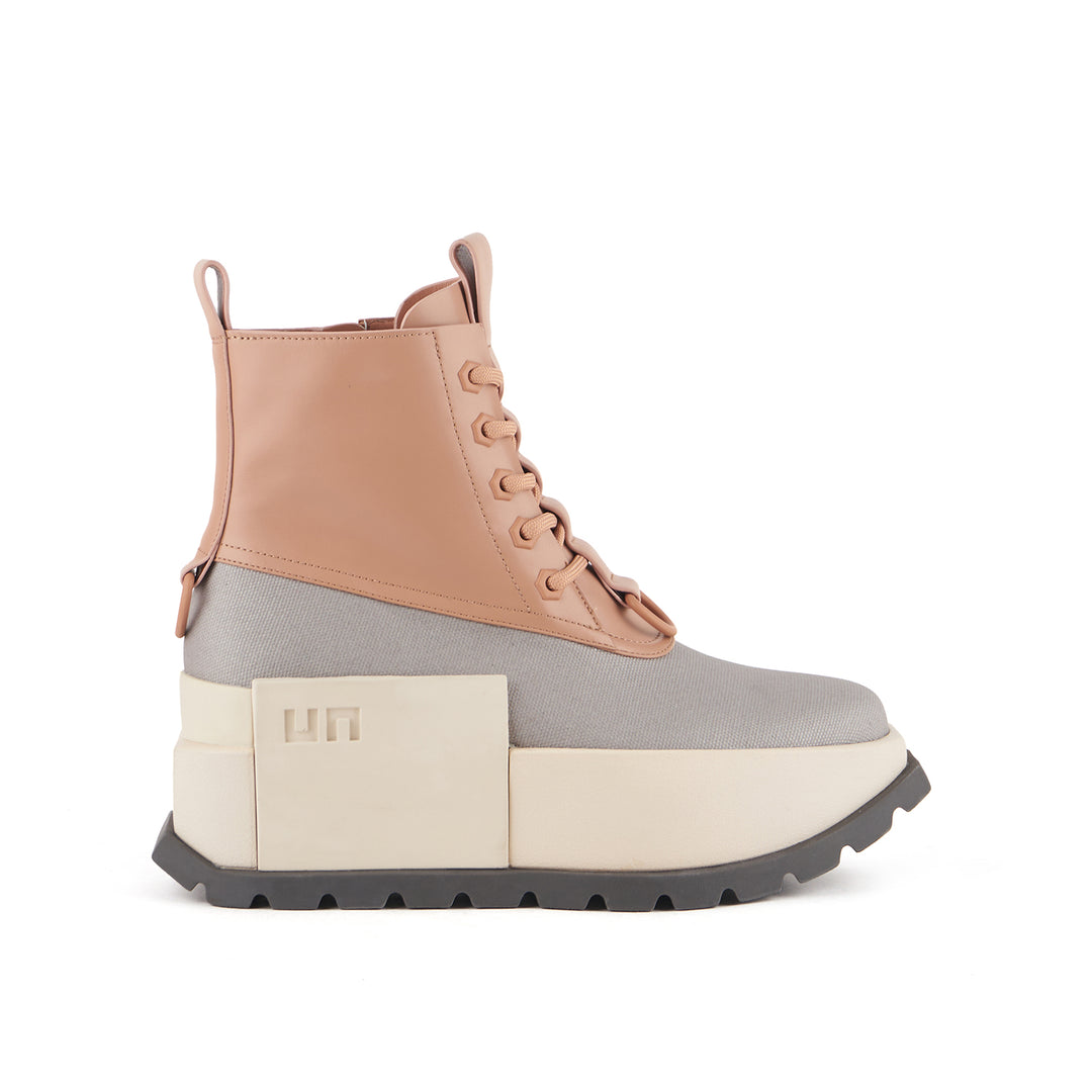 The Roko Patrol Boot is a functional lace-up style for everyday wear, featuring a vegetan leather and rubber coated nylon upper, a bold cleated outsole, UN's signature aesthetics, signature pull-ups, and a defining block logo.