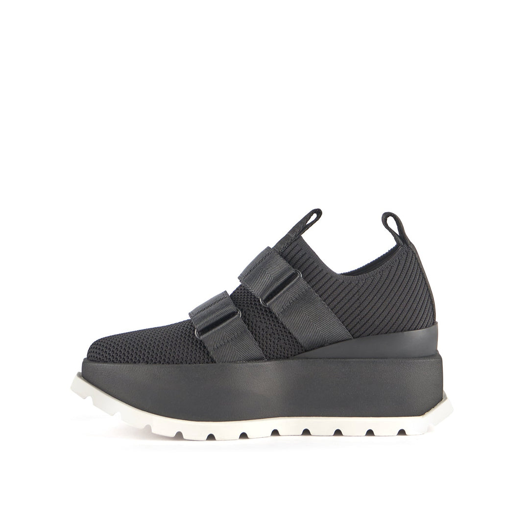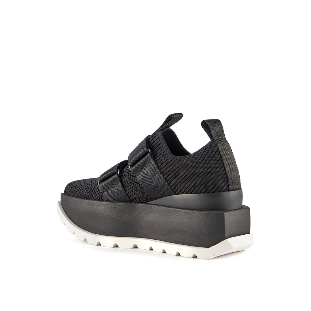 The Roko Run II is a wedge platform sneaker lifted by a bold cleated outsole. The geometric silhouette features UN's signature aesthetics, a knit fabric upper, adjustable velcro straps, signature pull-ups, and a defining block logo.