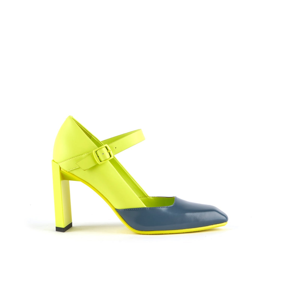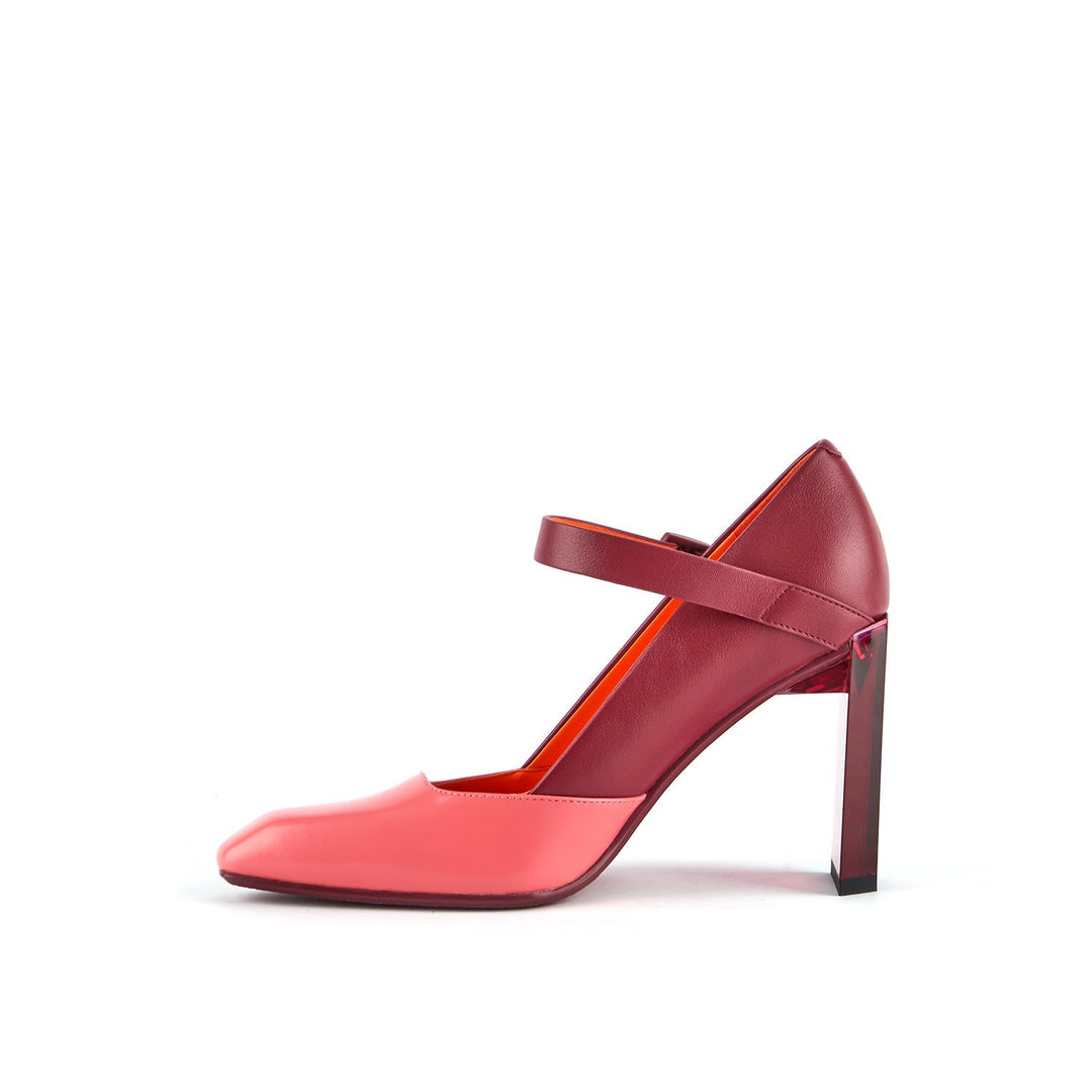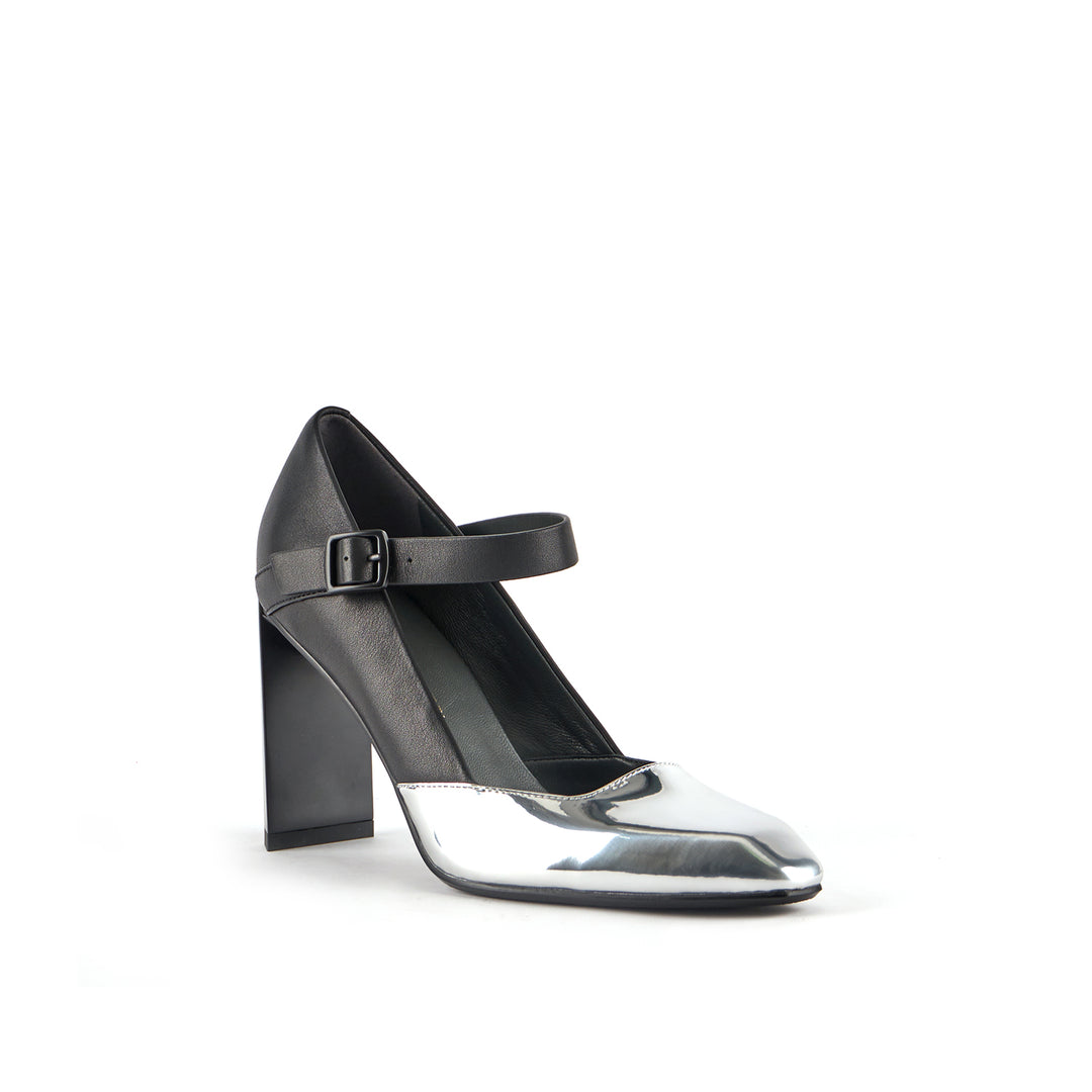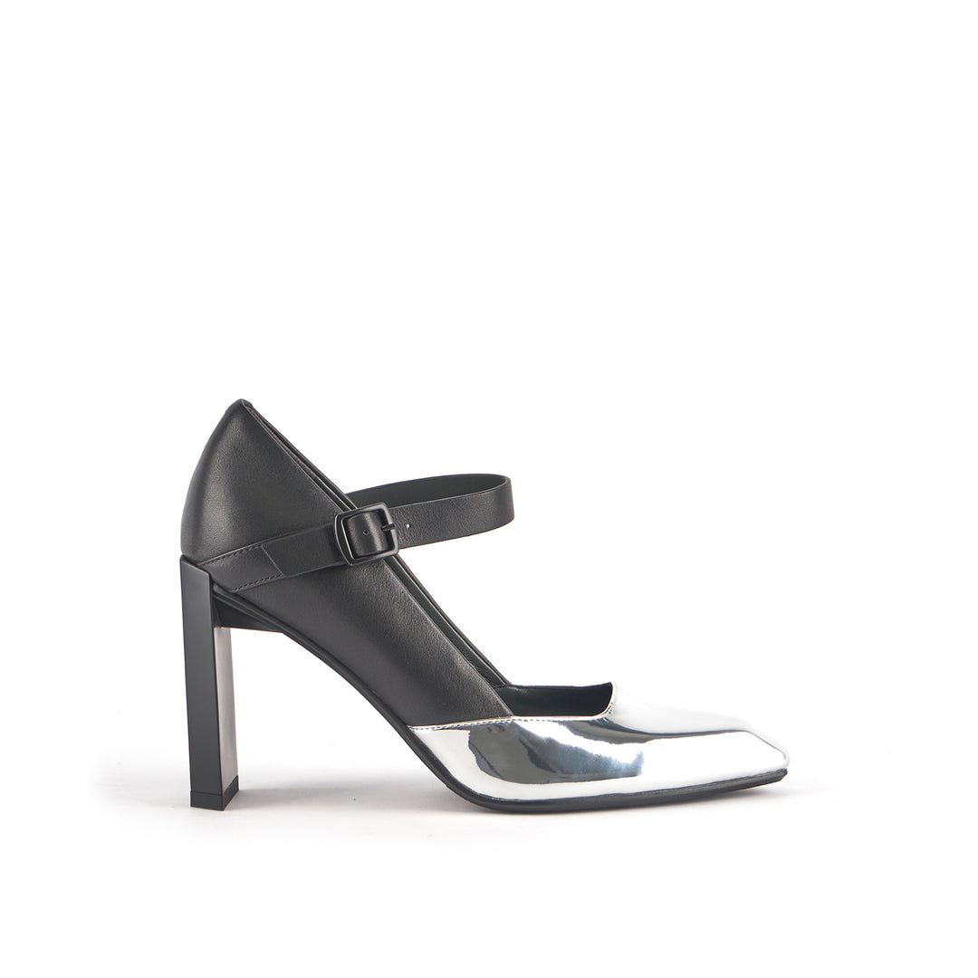 The Tara MJ Hi is a high heeled pump with a clean two-toned upper and a classic Mary Jane buckle strap. It comes with a slim, geometric satin-finished or clear colored heel.