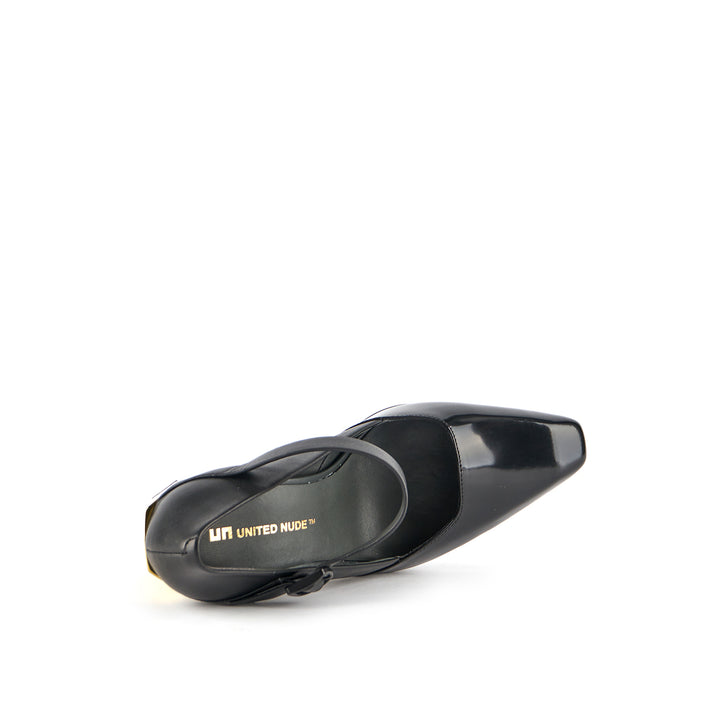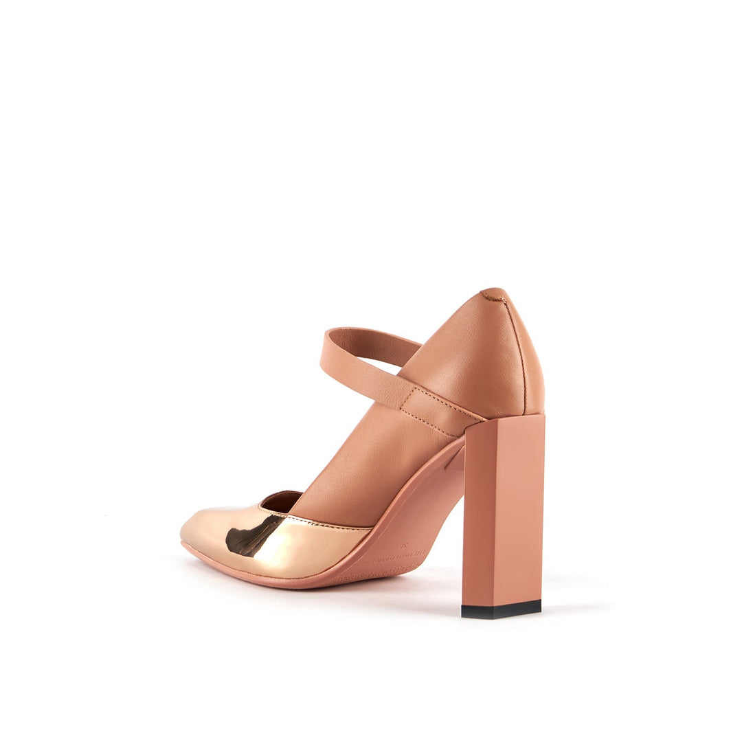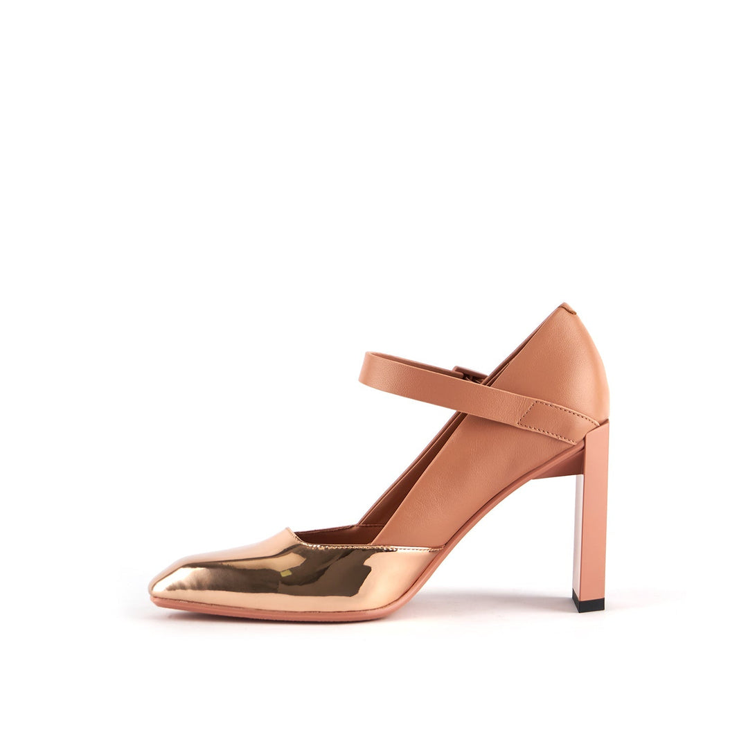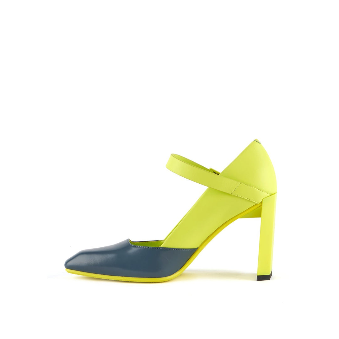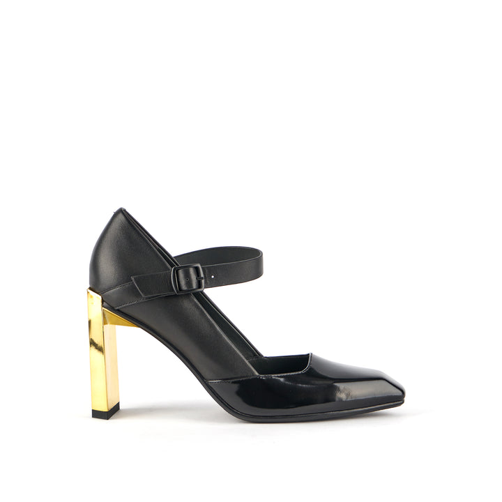 The Tara MJ Hi is a high heeled pump with a clean two-toned upper and a classic Mary Jane buckle strap. It comes with a slim, geometric satin-finished or clear colored heel.