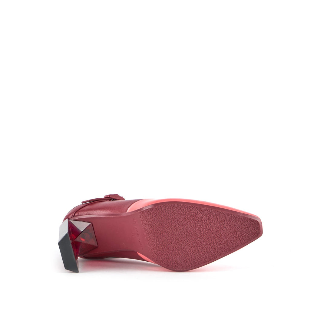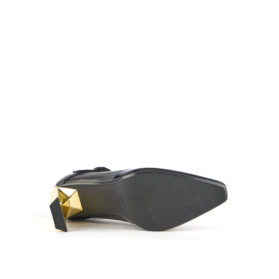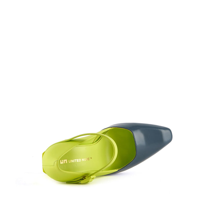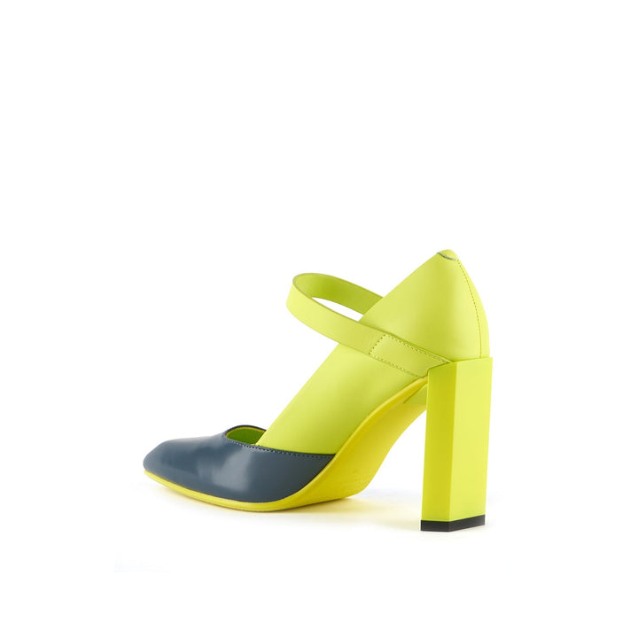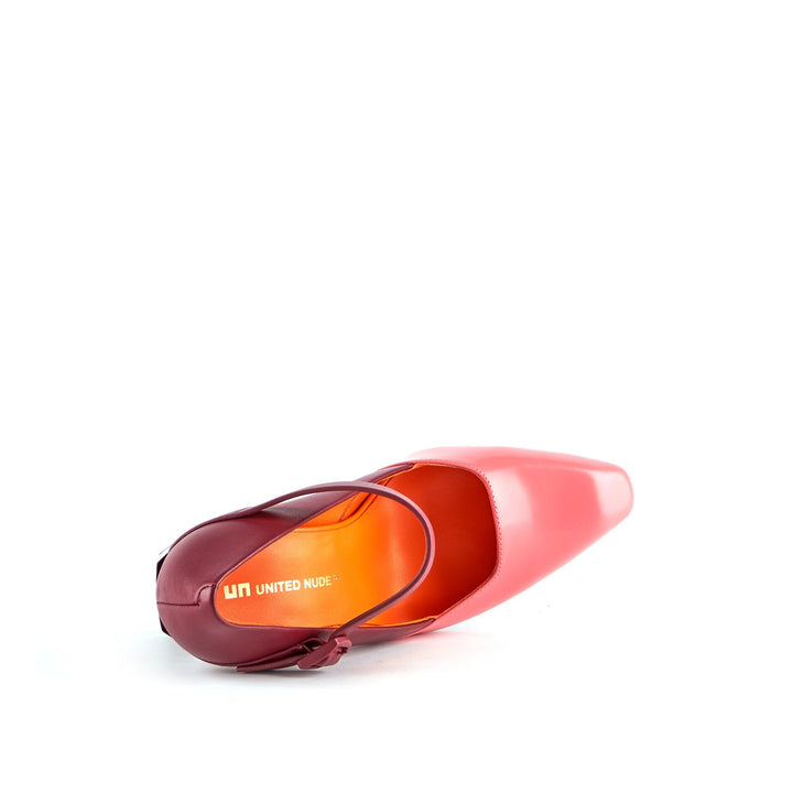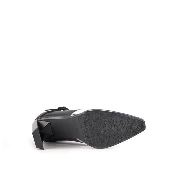 The Tara MJ Hi is a high heeled pump with a clean two-toned upper and a classic Mary Jane buckle strap. It comes with a slim, geometric satin-finished or clear colored heel.