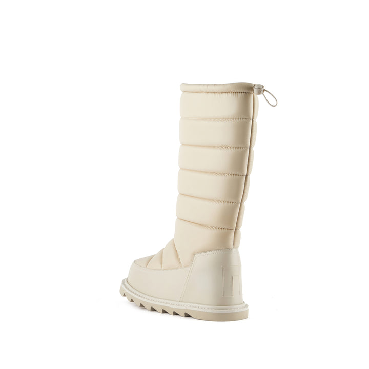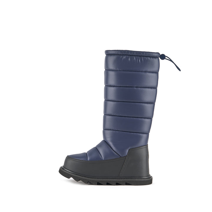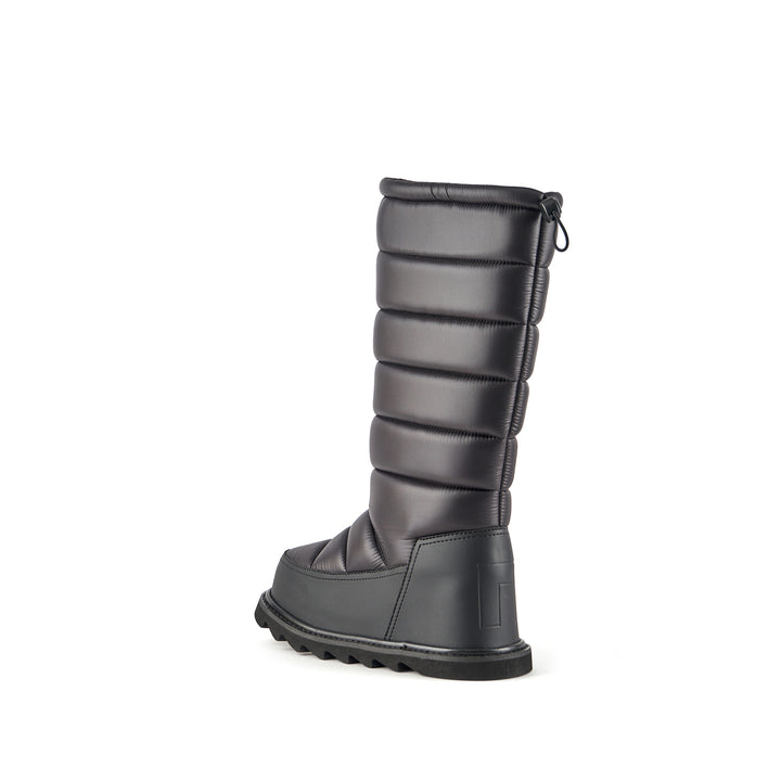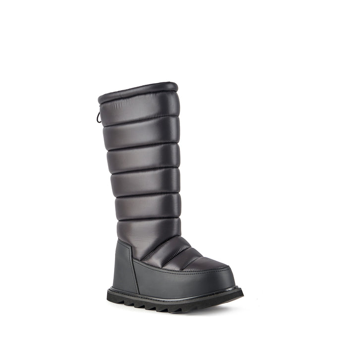 The Zembla Bubble Boot is a pull-on winter knee boot featuring a quilted puffer upper, an oversized rand, an adjustable topline, and a chunky treaded platform outsole.